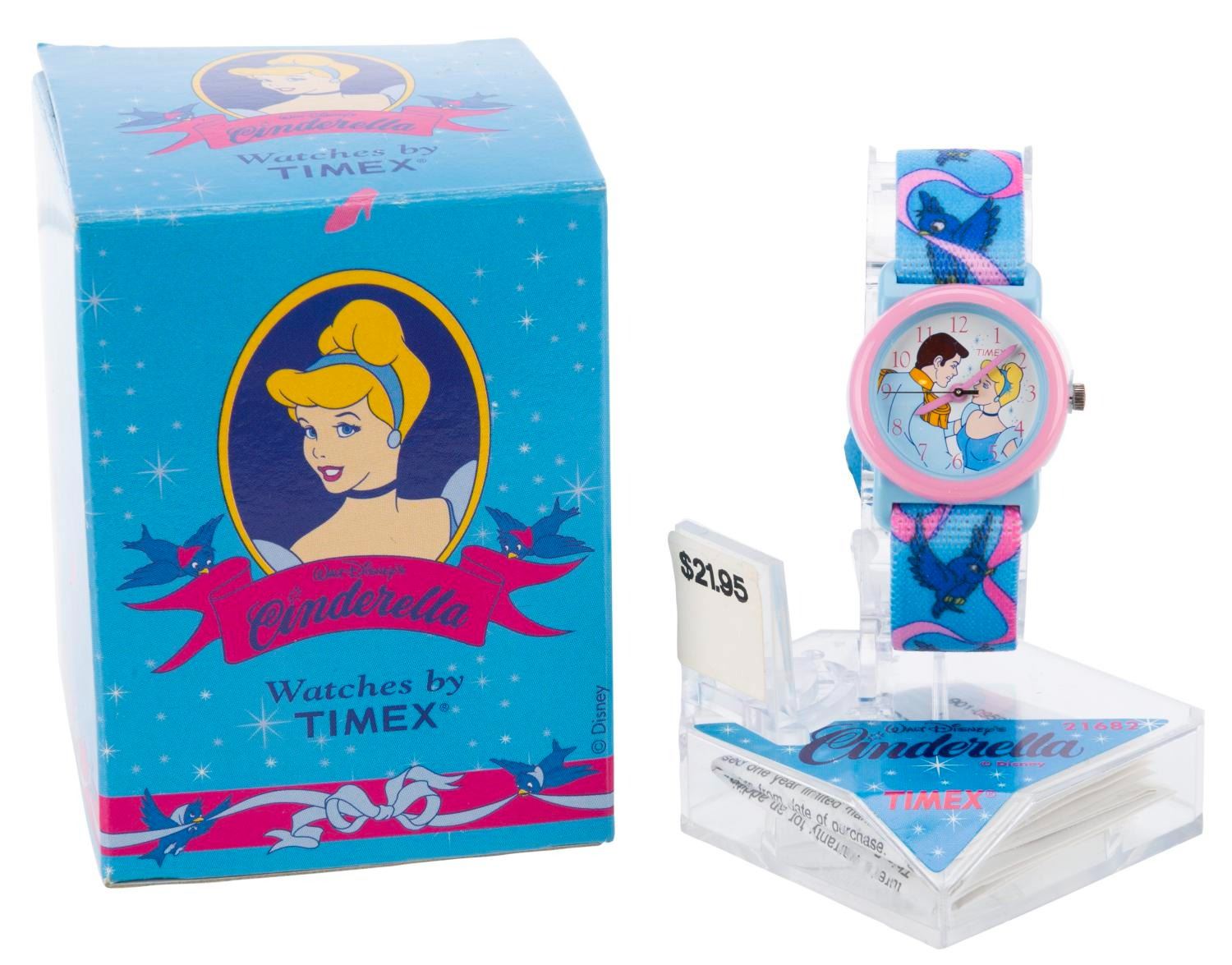 (Timex, 1990s) A children's Cinderella with Prince Charming wristwatch. Featuring an elastic band and the original retail packaging, the watch requires a battery (not included) and is sold untested and may require service for operation. The watch and original packaging are in fine condition.