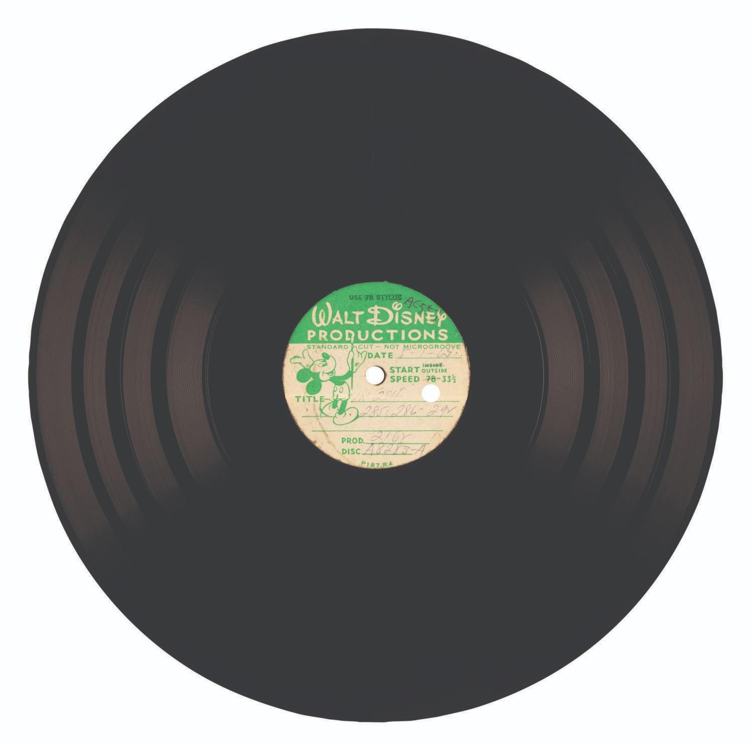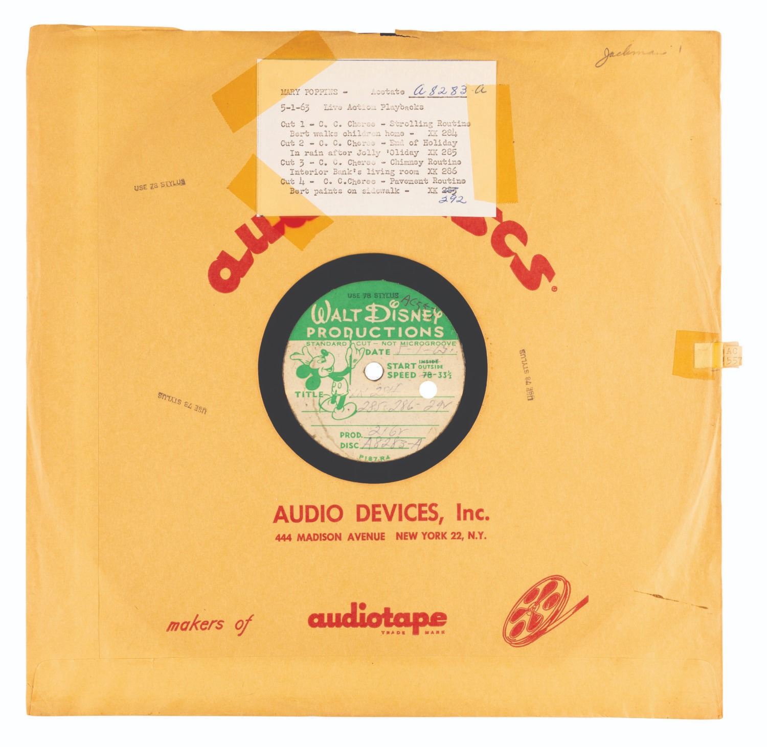 (Disney, 1963) A “Mary Poppins” live-action playback acetate from May 1, 1963, featuring “I Love to Laugh,” “Supercalifragilisticexpialidocious,” and four cuts of “Chim Chim Cher-ee.” Measuring 12” in diameter, the 33 ⅓ RPM record is in very good condition with scratches.