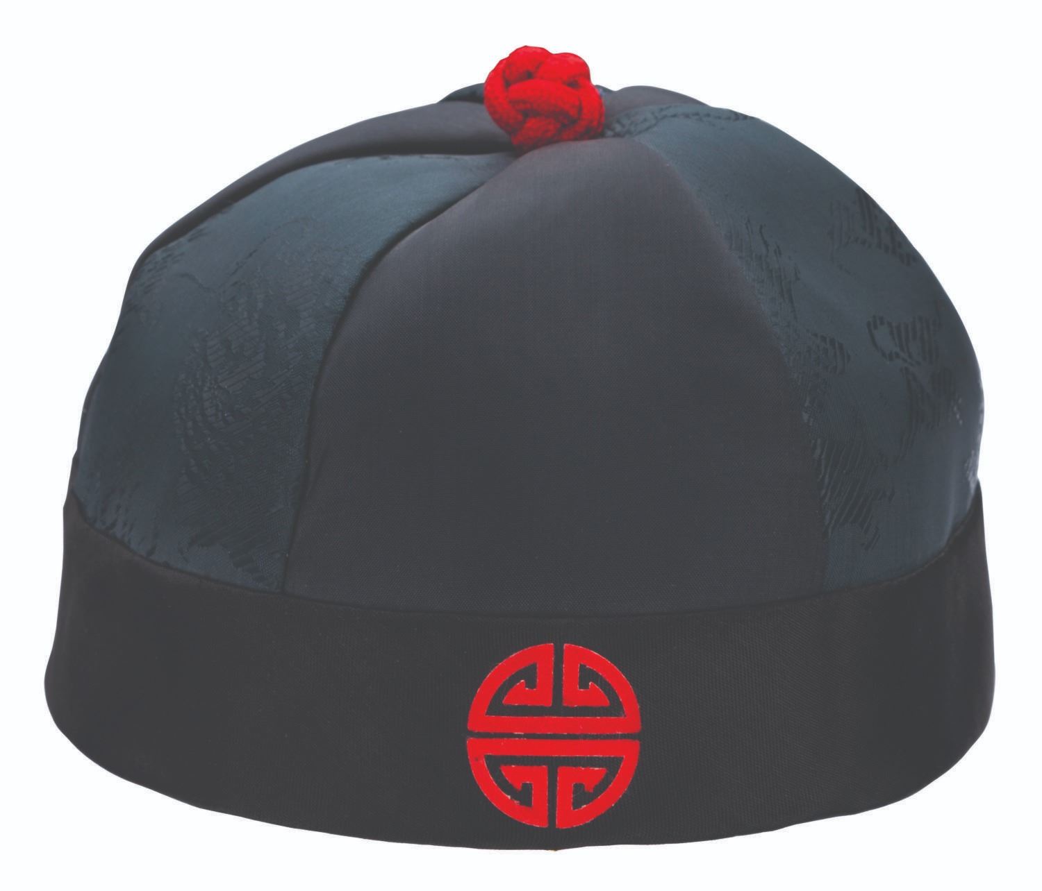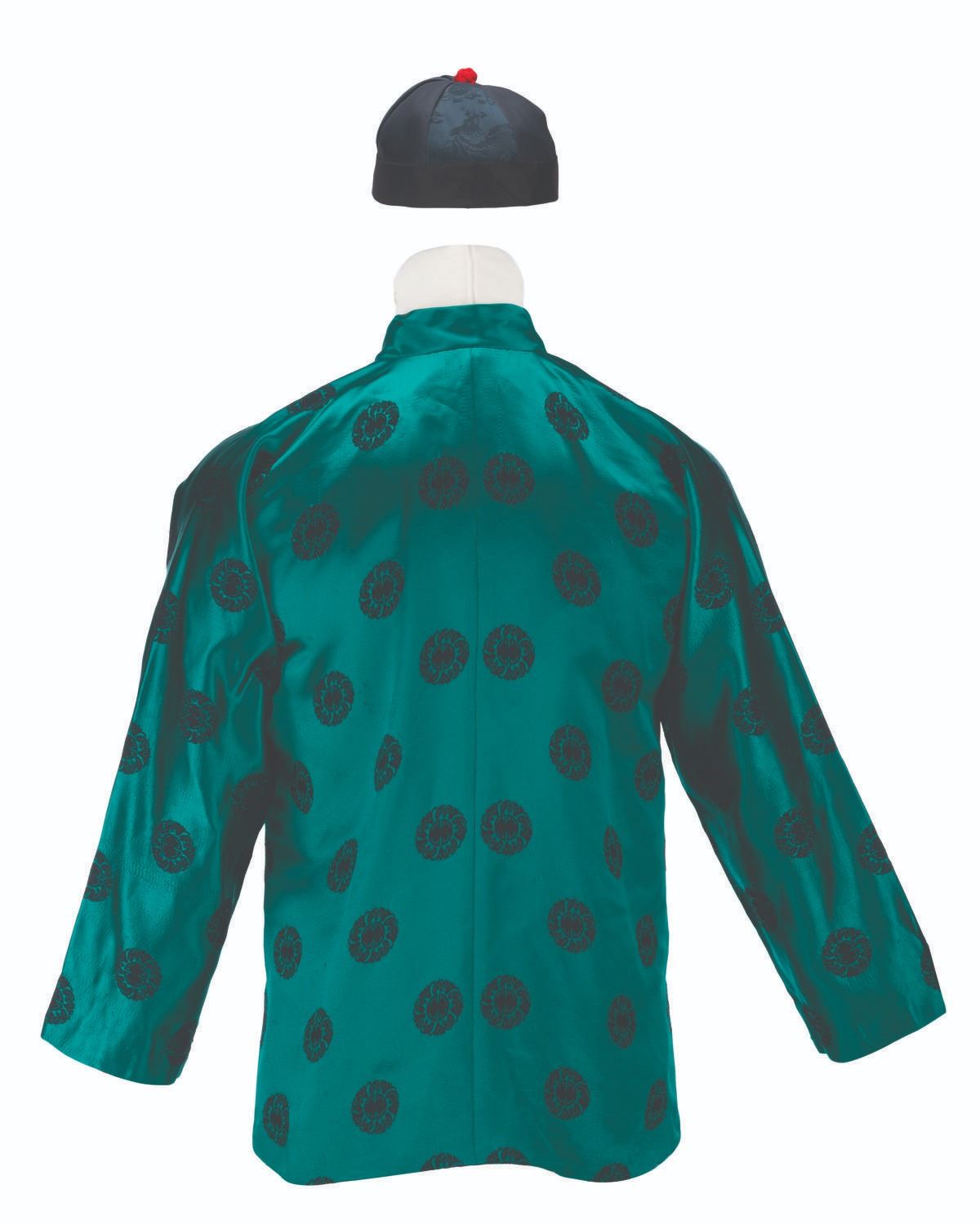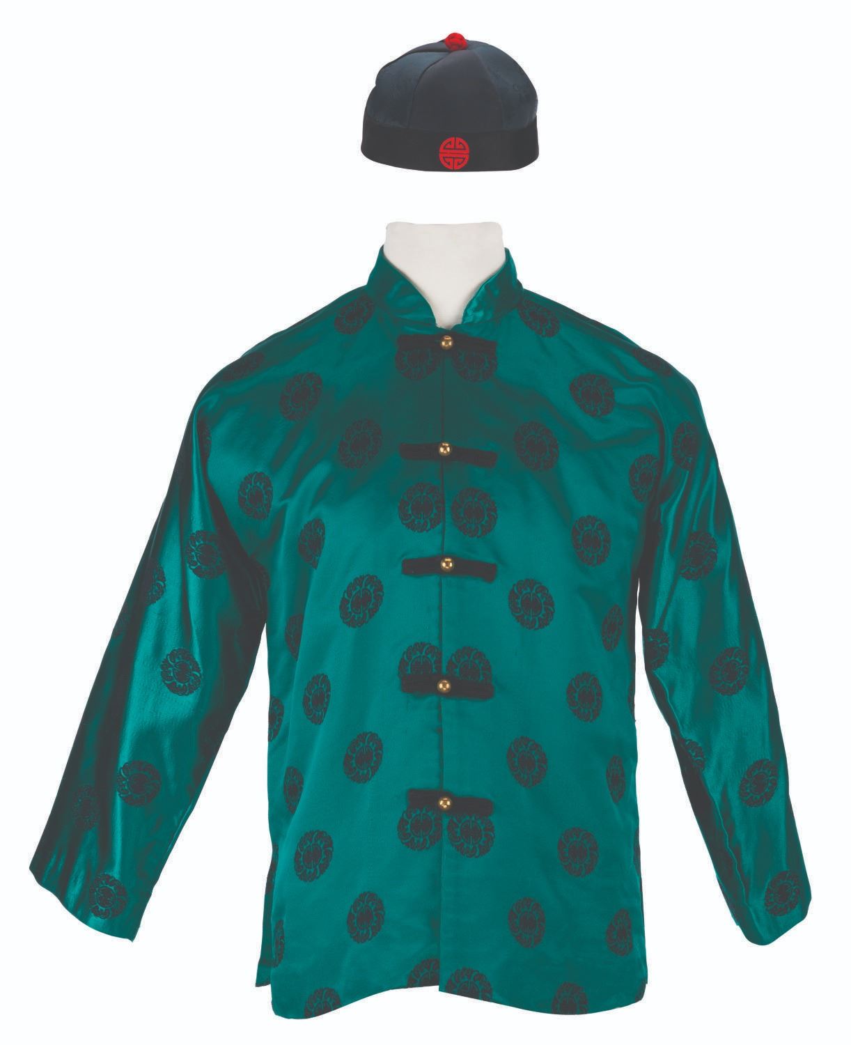 (EPCOT Center, 1980s-90s) A uniform shirt and traditional hat worn by Cast Members working the China Pavilion. Labeled a size M, the shirt displays in good condition with heavy fraying throughout and wear, while the hat is labeled a size 7 ½ and in very good condition with light wear from Park use.