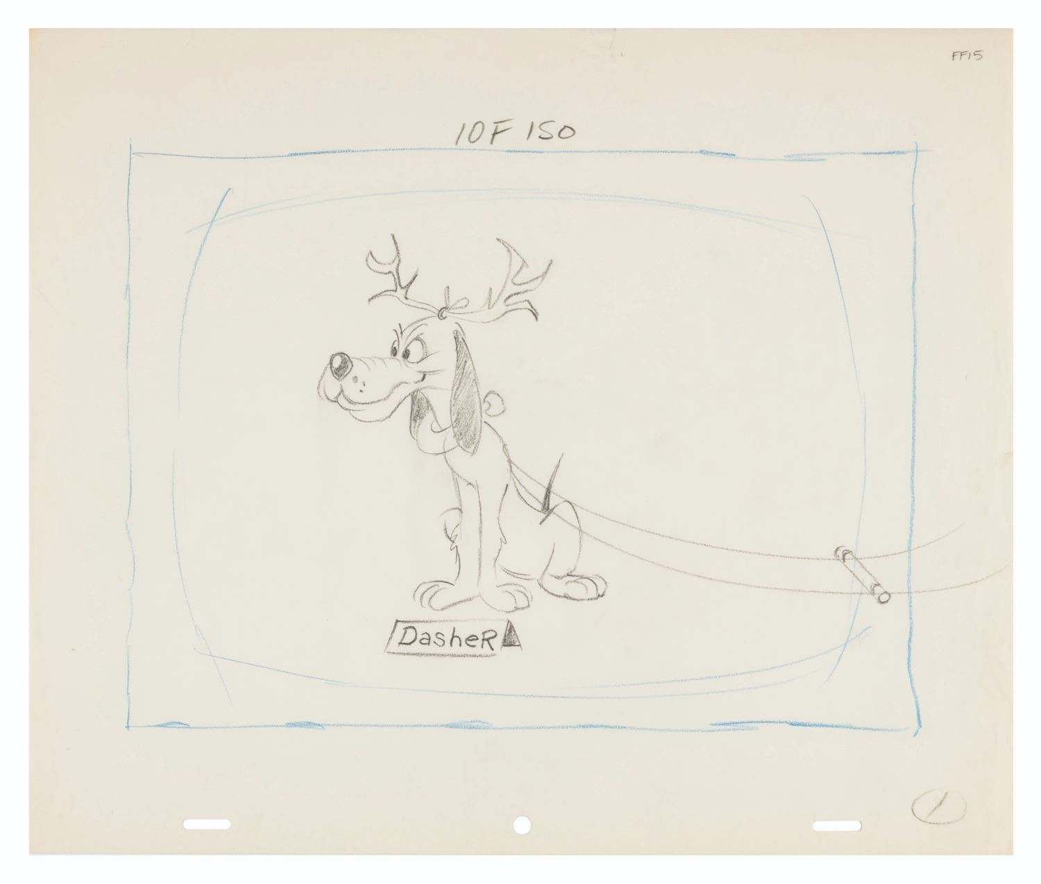 (Chuck Jones/Bagdasarian, 1981) A set of ten layout drawings of dogs dressed as Santa's reindeer from "A Chipmunk Christmas." The drawings, by Chuck Jones, feature various dogs as reindeer and include several of Jones' more well-known canines including Marc Anthoy and Max. With various image sizes on 10.5" x 12.5" animation paper, the graphite drawings are in very good condition with light smudges and wear from handling and original production use.