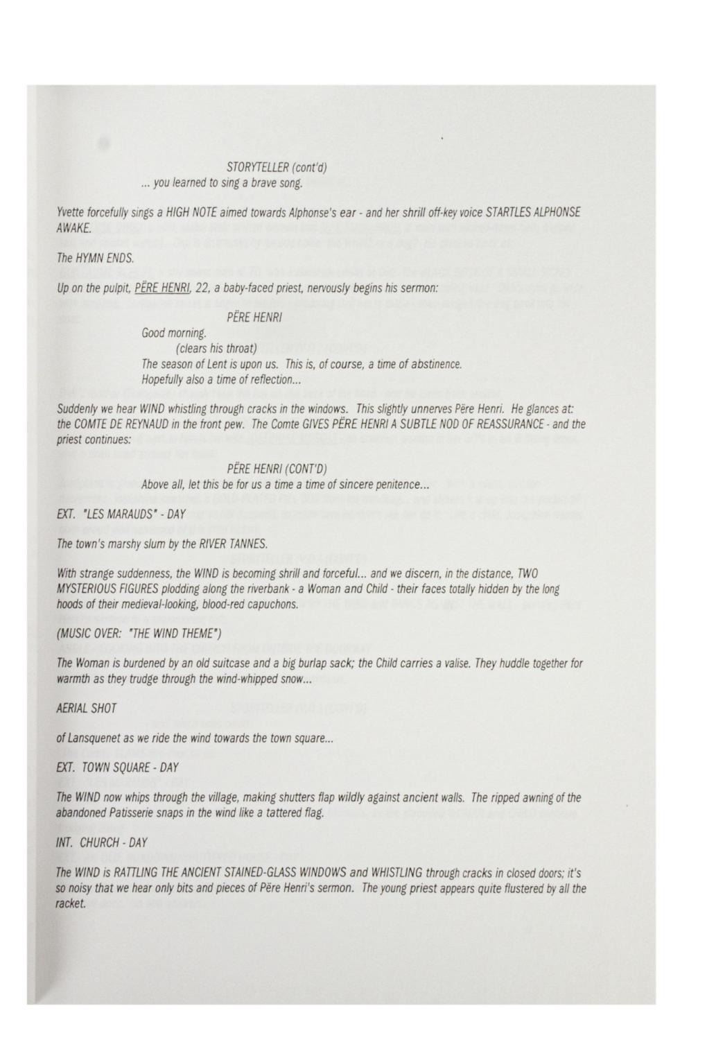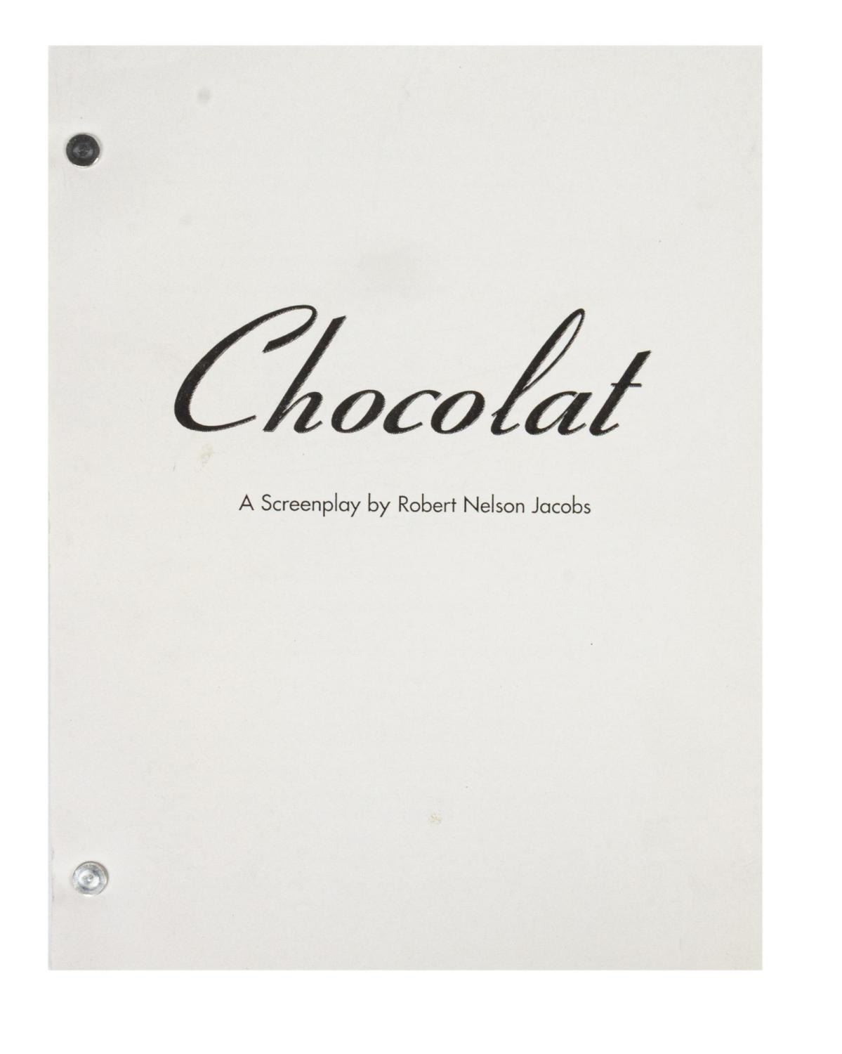 (Miramax, 2000) A script for "Chocolat," written by Robert Nelson Jacobs. The screenplay is in very good condition with very light handling wear, and no date or numbering to the pages, appearing complete.