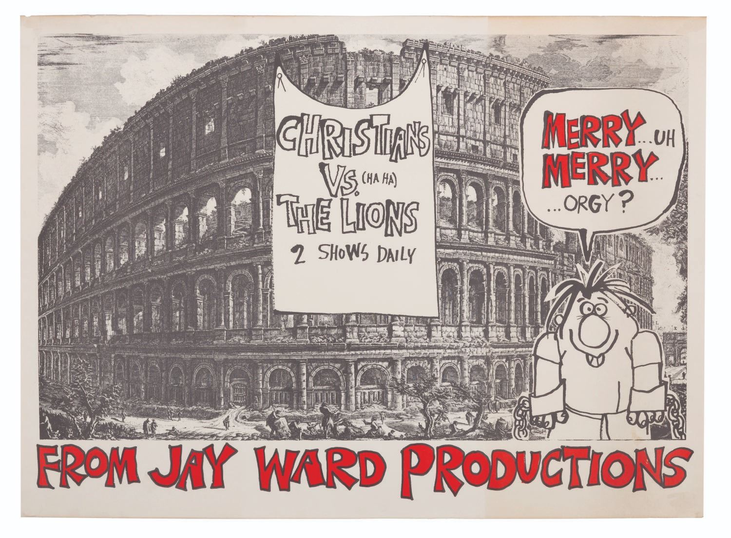 (Ward, 1960s-80s) A Jay Ward Productions Christmas gag poster featuring Christians vs. The Lions at the Roman Colosseum and the phrase “Merry Orgy.” Measuring 20.5” x 28” good condition with edge wear, stains, and discoloration from age.