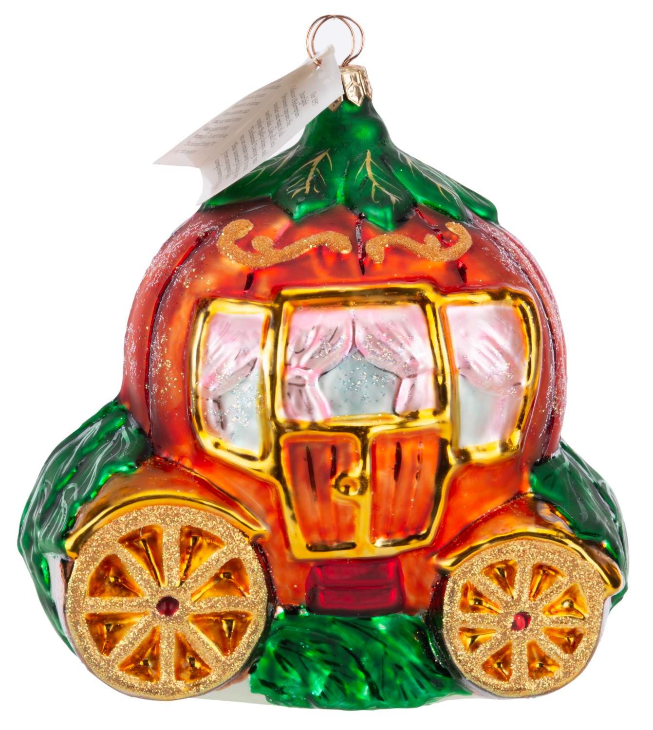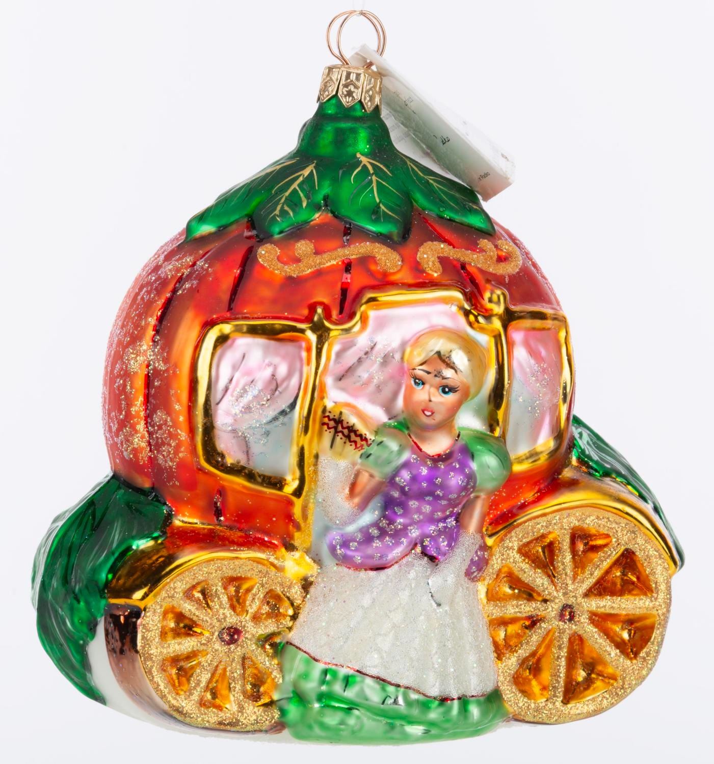 (Radko, 1997) A "Cinderella " pumpkin carriage ornament by Christopher Radko, the 1997 Starlight Collector's Redemption Ornament from his Enchanted Evening series. Measuring 5 " x 4 " x 6 " tall, the ornament is in very good condition with light scratches and wear.