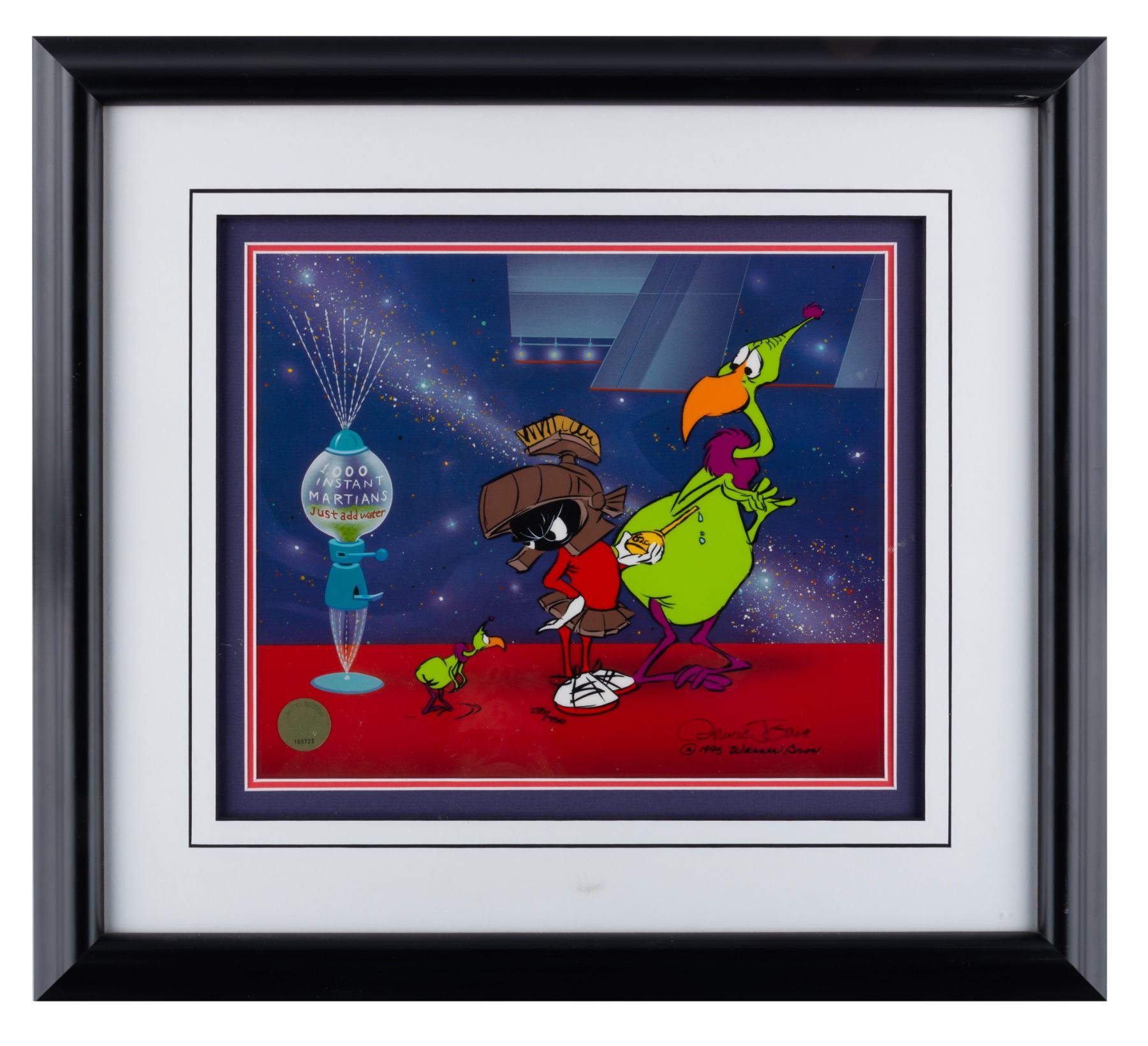 (Warner Bros., 1995) A hand-painted limited edition sericel titled "Instant Martians." The cel is 235/750 and is hand-signed by animation legend Chuck Jones. The art is serigraph printed from Jones' original drawing, then hand-painted on the reverse. With a character size of 7.5" x 8" on a 9.75" x 12" visible cel within a 16" x 18" matte, the cel is in very good condition.