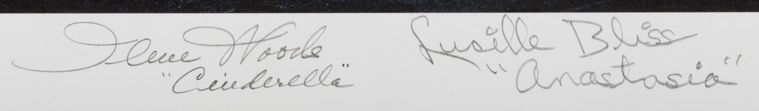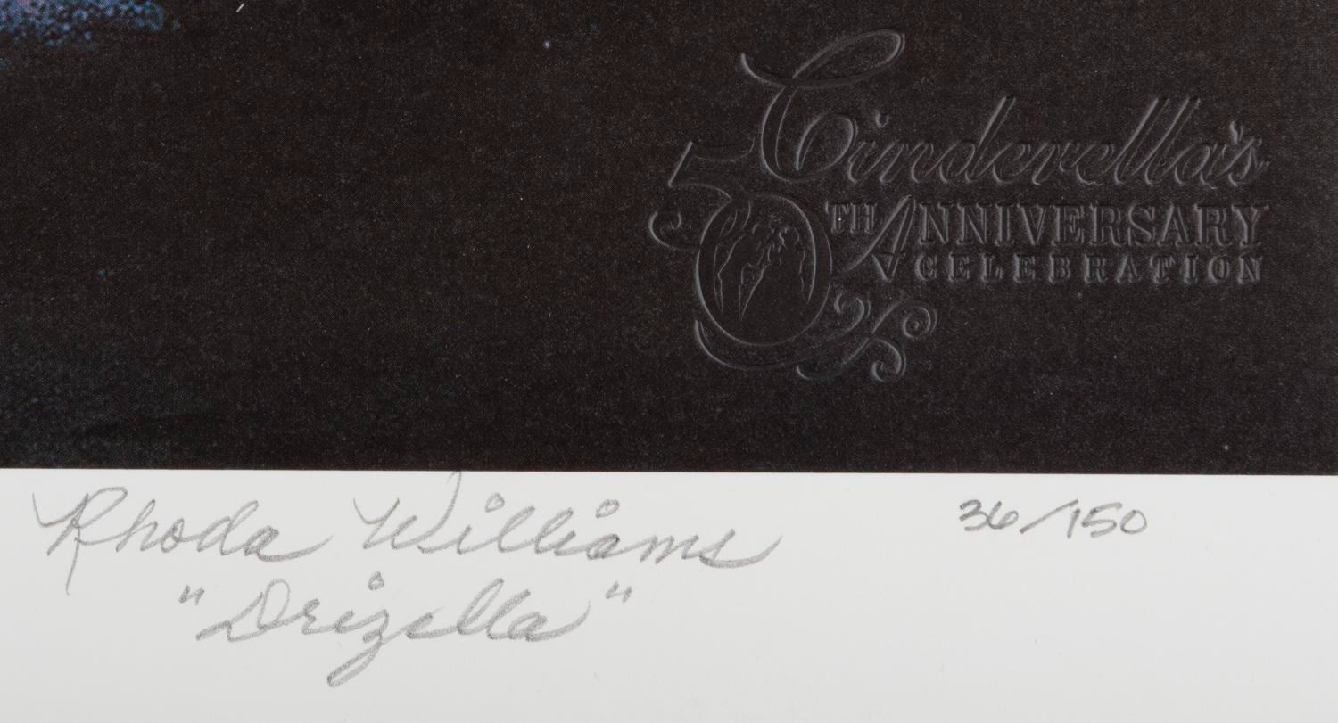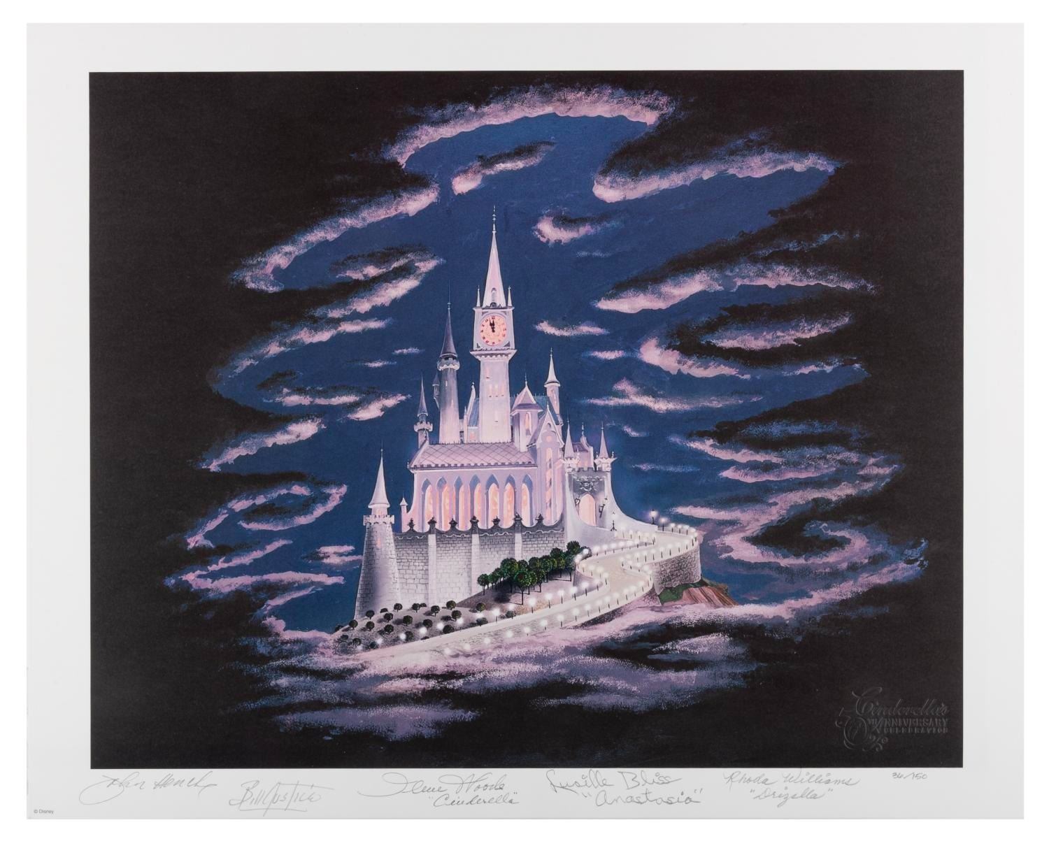 (Disneyland, 2000) A limited edition print produced for the "Cinderella" 50th Anniversary event at The Disney Gallery in Disneyland. The lithographic print depicts Cinderella's castle by artist James Trout and has been signed by John Hench, Bill Justice, and voice actors Ilene Woods (Cinderella), Lucille Bliss (Anastasia), and Rhoda Williams (Drizella). Numbered 36/100 and measuring 16" x 20", the print is in fine condition.