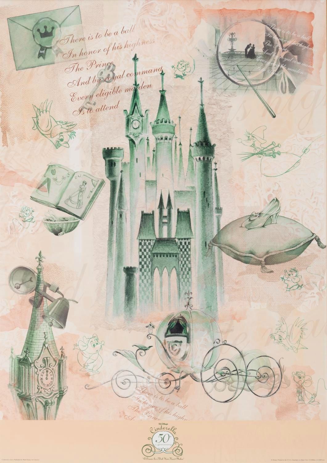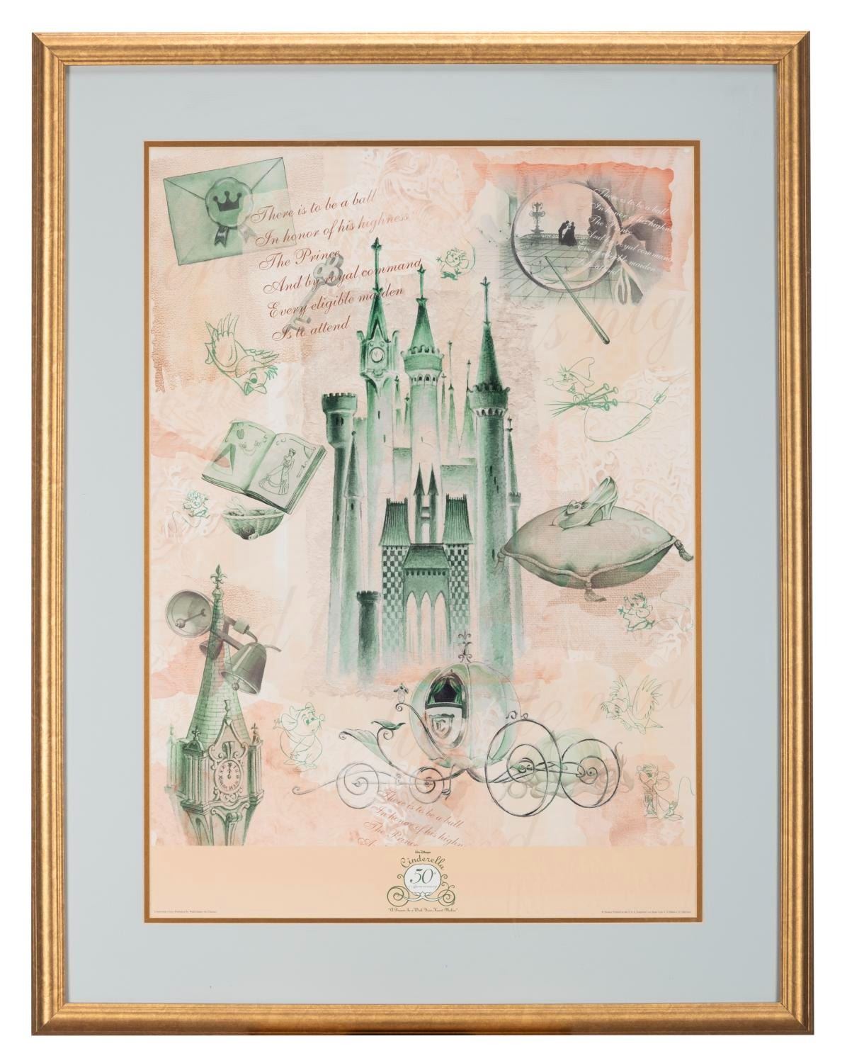 (Disney, 2000) A framed poster commemorating the 50th anniversary of Walt Disney’s "Cinderella." The poster was sold framed at the Disney Store, and the entire framed piece measures 28" x 36" with a matte opening of 20" x 28". The poster is in excellent condition, and the frame has minor scuffs and scratches, but presents well. The original Disney Store Tag is still attached. Because of size, shipping may be more than a standard-sized package. Please inquire before bidding.