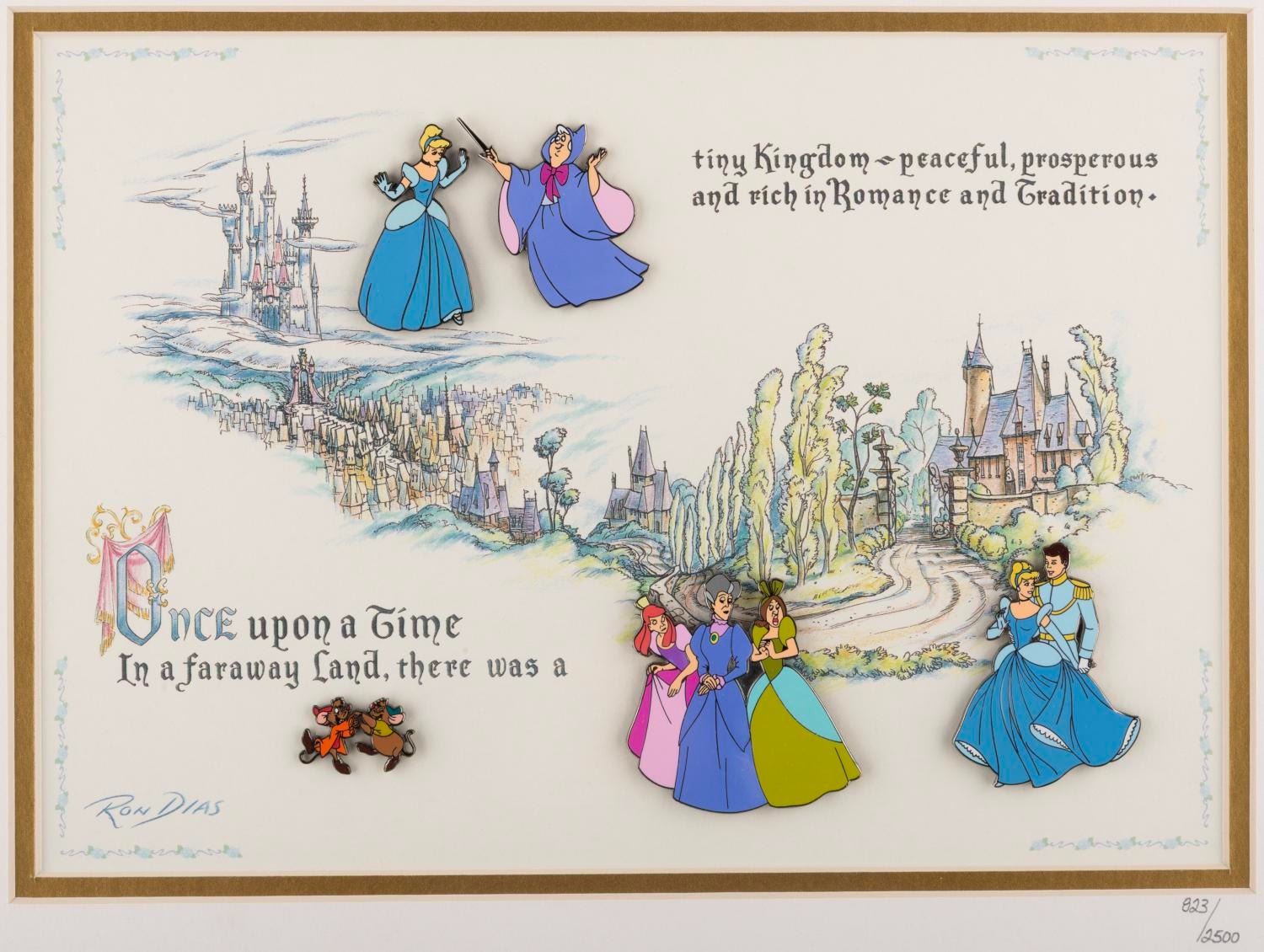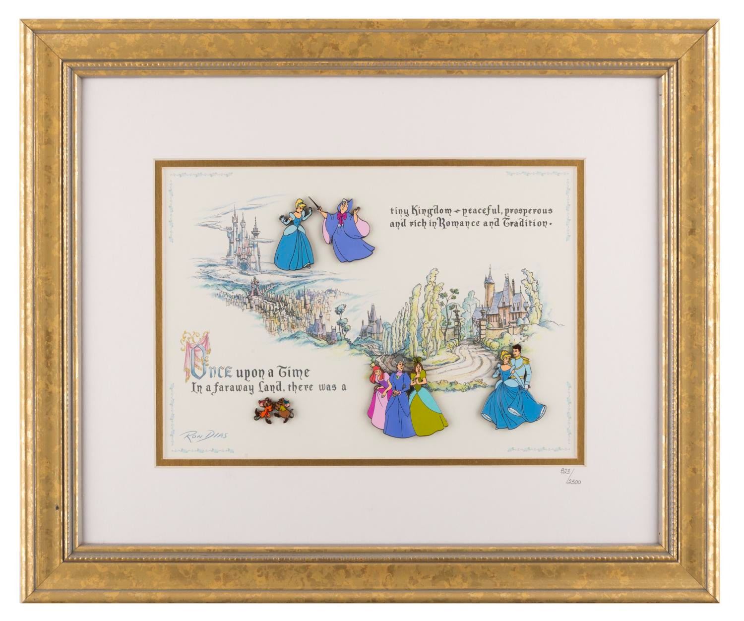 (Disney, 2000) A framed set of five pins commemorating the 50th anniversary of "Cinderella," released in a limited edition and hand-numbered 823/2500. Ranging in size from 0.75" x 1.25" to 2.25" x 2.25" in a 15.25" x 18.25" framed matte, the pins are in fine condition, while the frame displays in very good condition with scuffs, scratches, and wear.