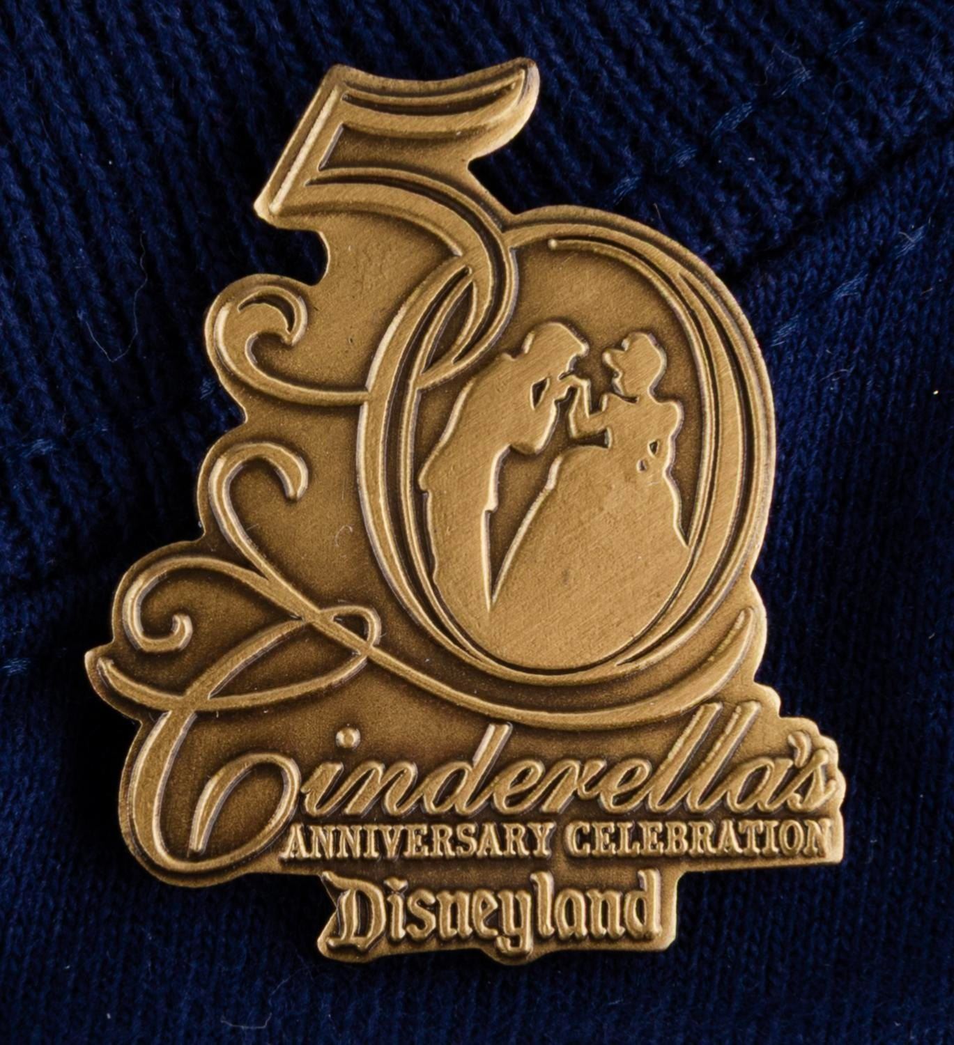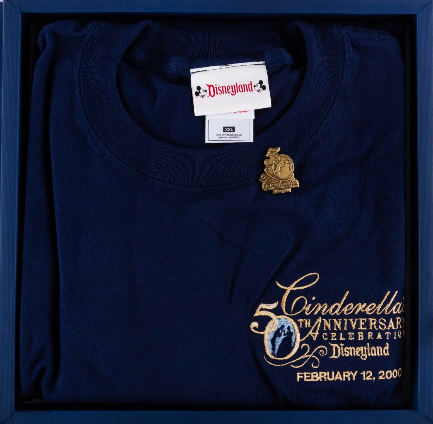 (Disneyland, 2000) A souvenir t-shirt and pin from the "Cinderella " 50th Anniversary Celebration at Disneyland on February 12, 2000. The shirt is labeled size XXL, and it and the pin are both in fine condition with the original themed packaging.