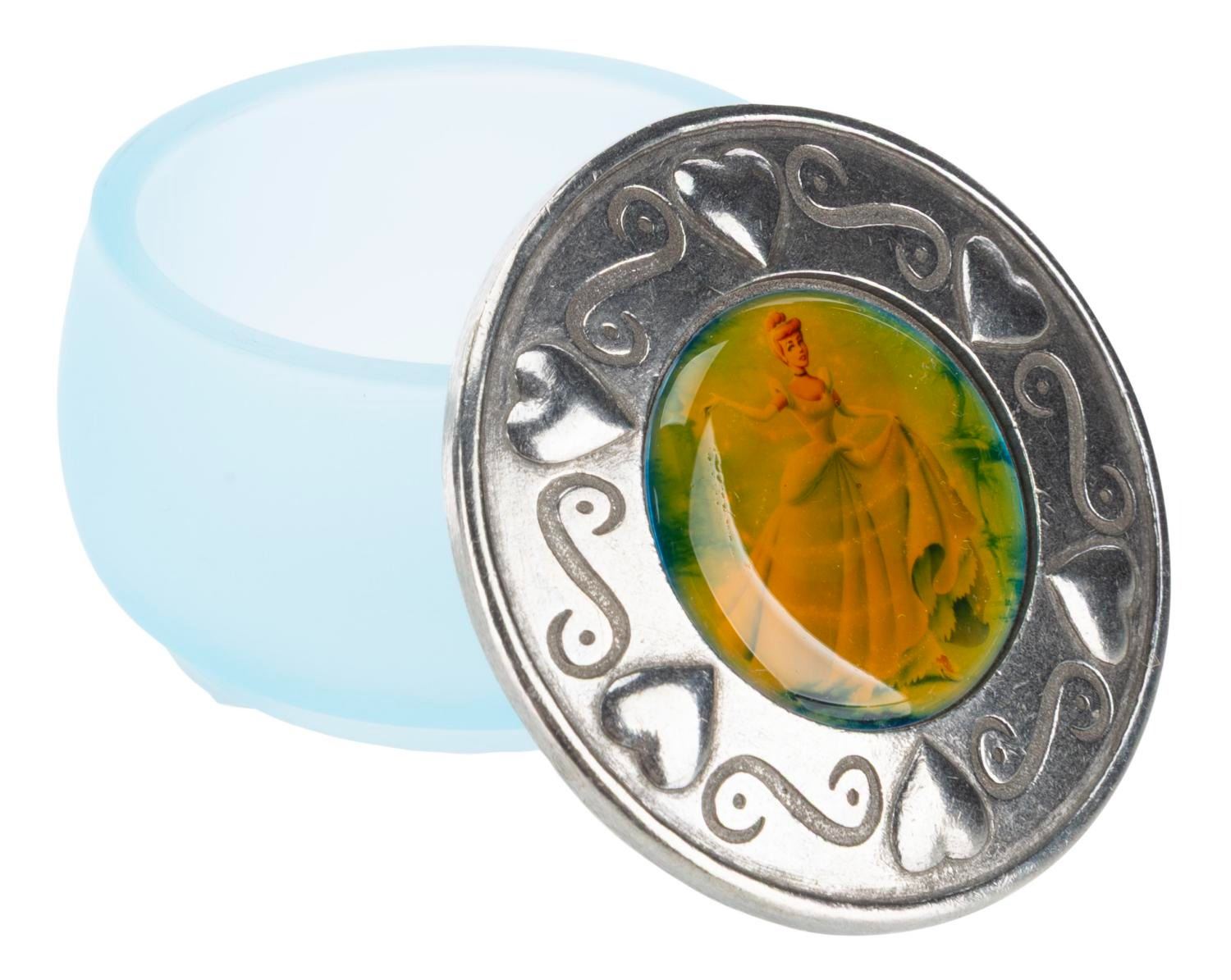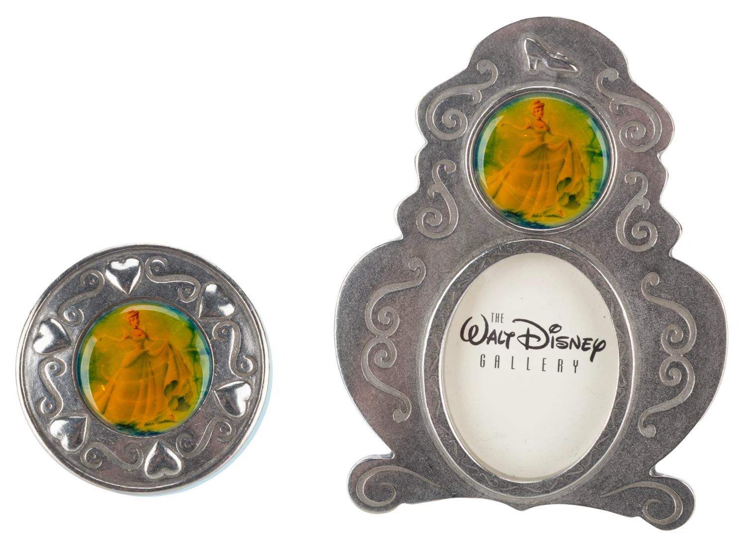 (Walt Disney Gallery, 2000s) A "Cinderella" photo frame and trinket box released by the Walt Disney Gallery for the 50th anniversary of the film. Measuring 2" x 1.25" to 3.25" x 4", the set is in good condition with light soiling, tarnishing, and oxidation.