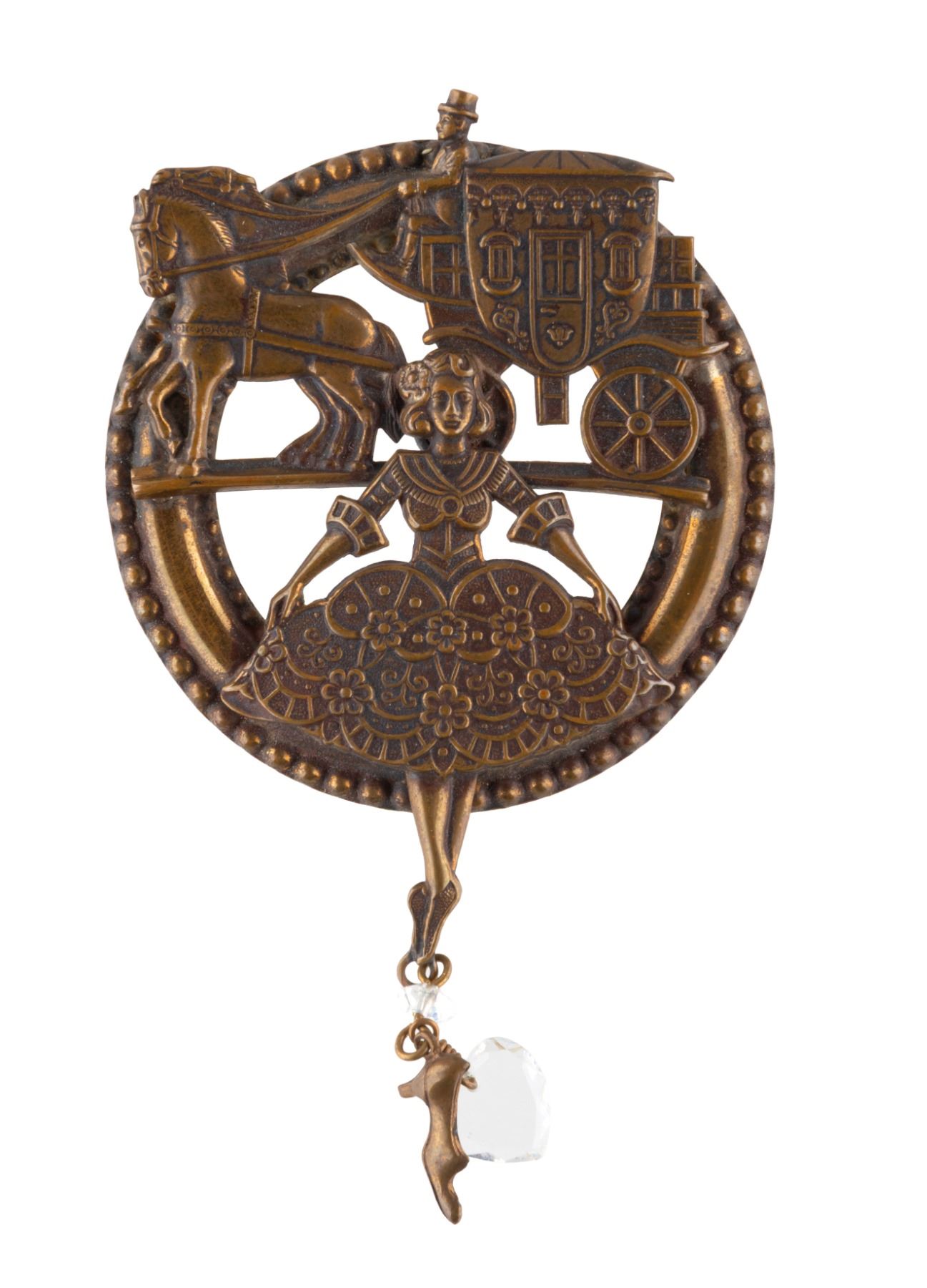(Unknown, 1950s-90s) A bronze colored Cinderella brooch with crystal heart charm, of unknown manufacture and age. Measuring 3.5" x 2", the brooch displays in very good condition with oxidation to the back.