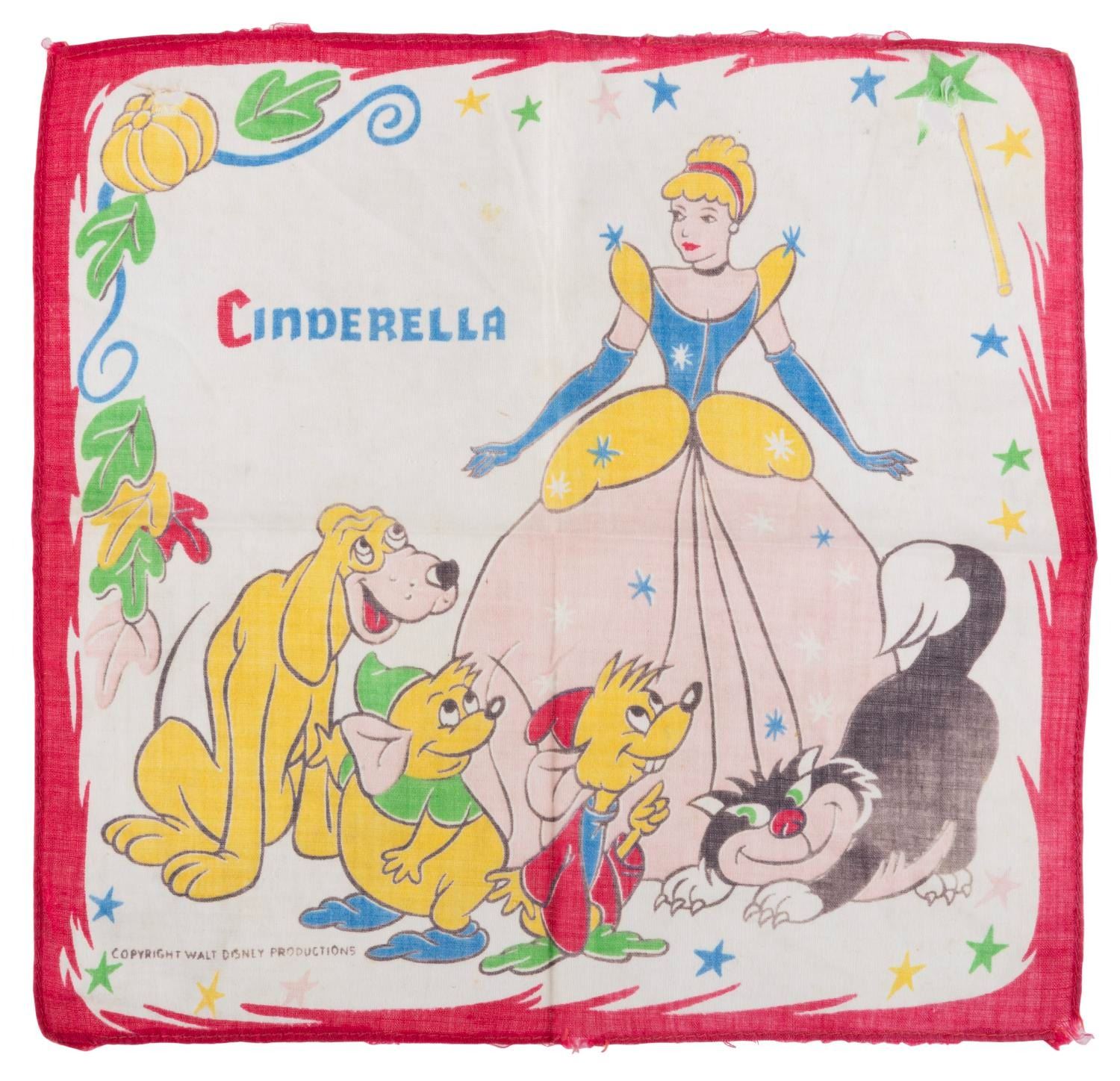 (Disney, 1950s) A child’s handkerchief featuring Cinderella with several of her animal friends. Measuring 8" x 8.5", the handkerchief is in fair condition with wear overall, including spots of fraying on the edges, and small holes in the upper corners.