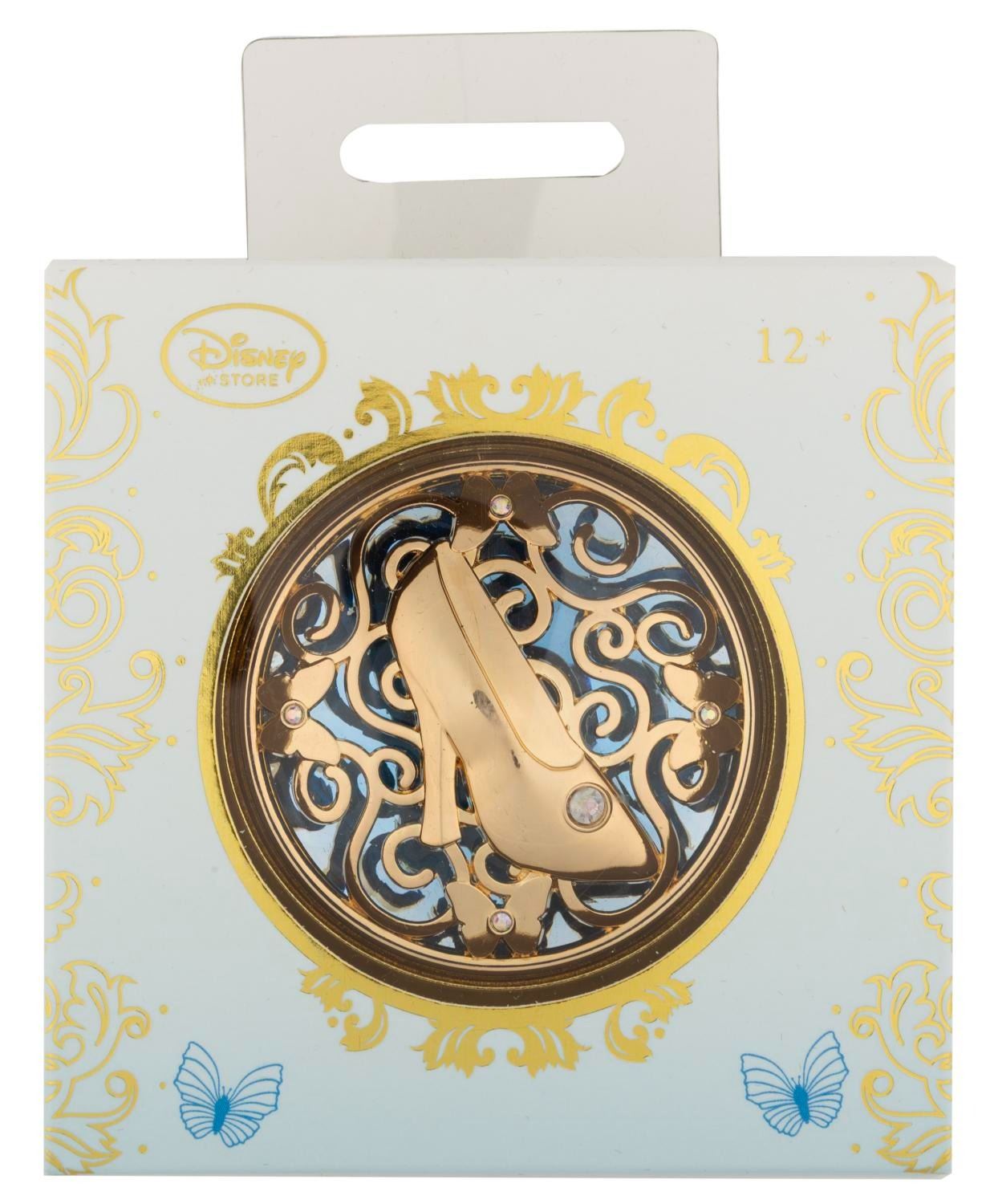(Disney Store, 2000s) A "Cinderella" compact mirror featuring a slipper design on the front. Measuring 3" in diameter, the compact mirror is in very good condition with very light handling wear.