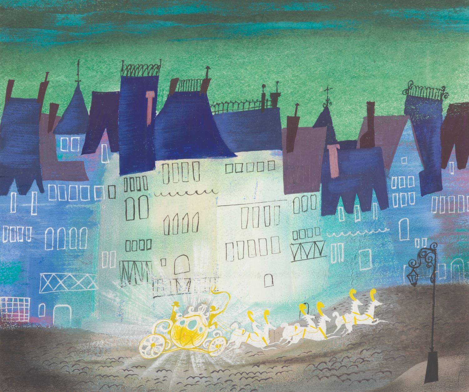 (Disney, 1950) A spectacular large original concept painting by Mary Blair for Disney's 1950 feature film, "Cinderella." Accomplished in gouache on artists' board, it features the pumpkin coach as it races through town. Measuring 12"x10", the artwork is in fine condition.