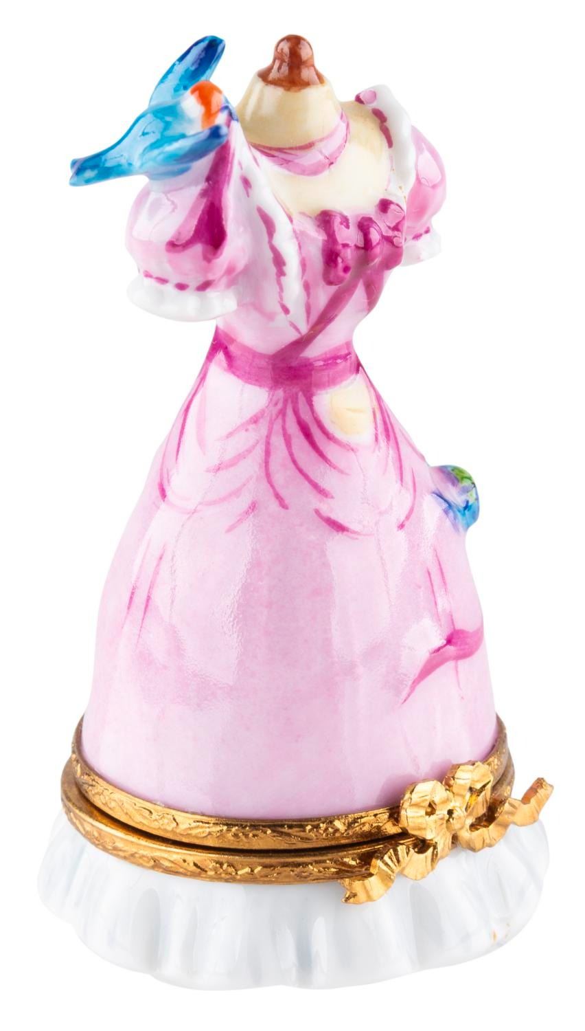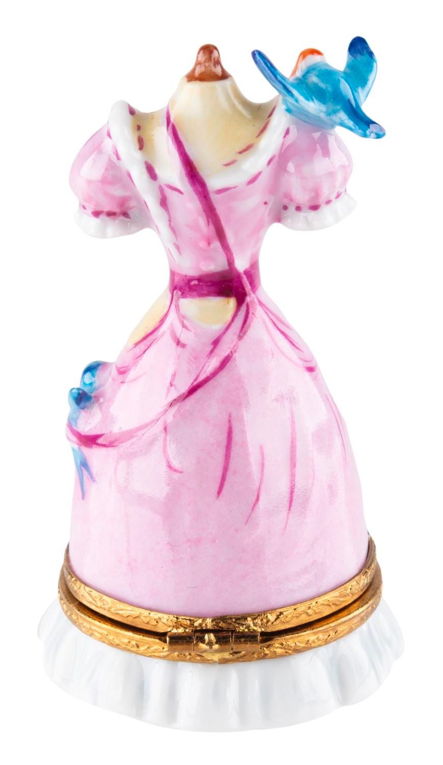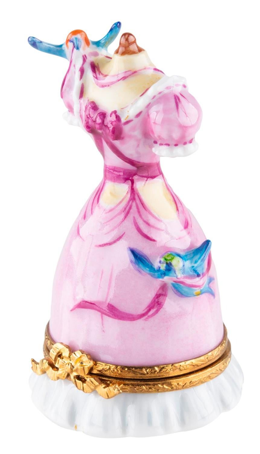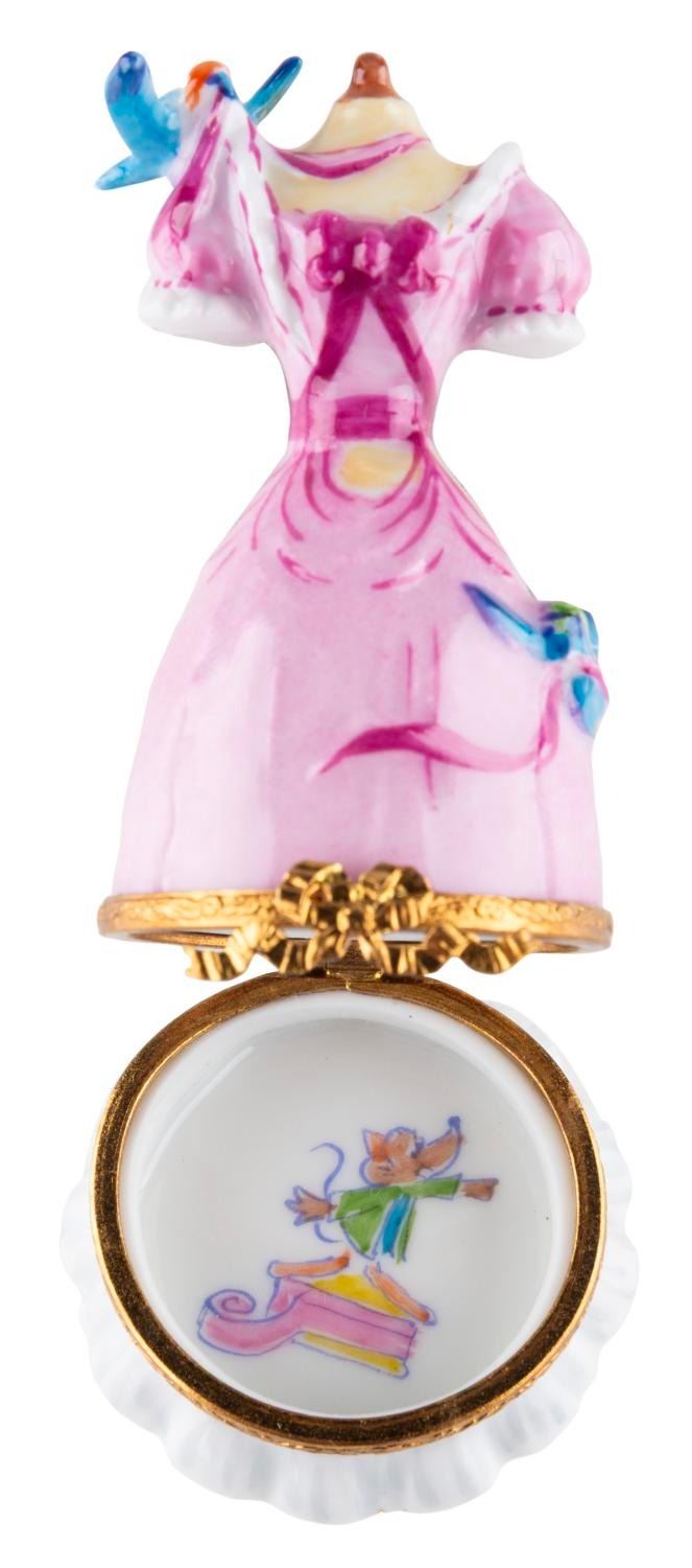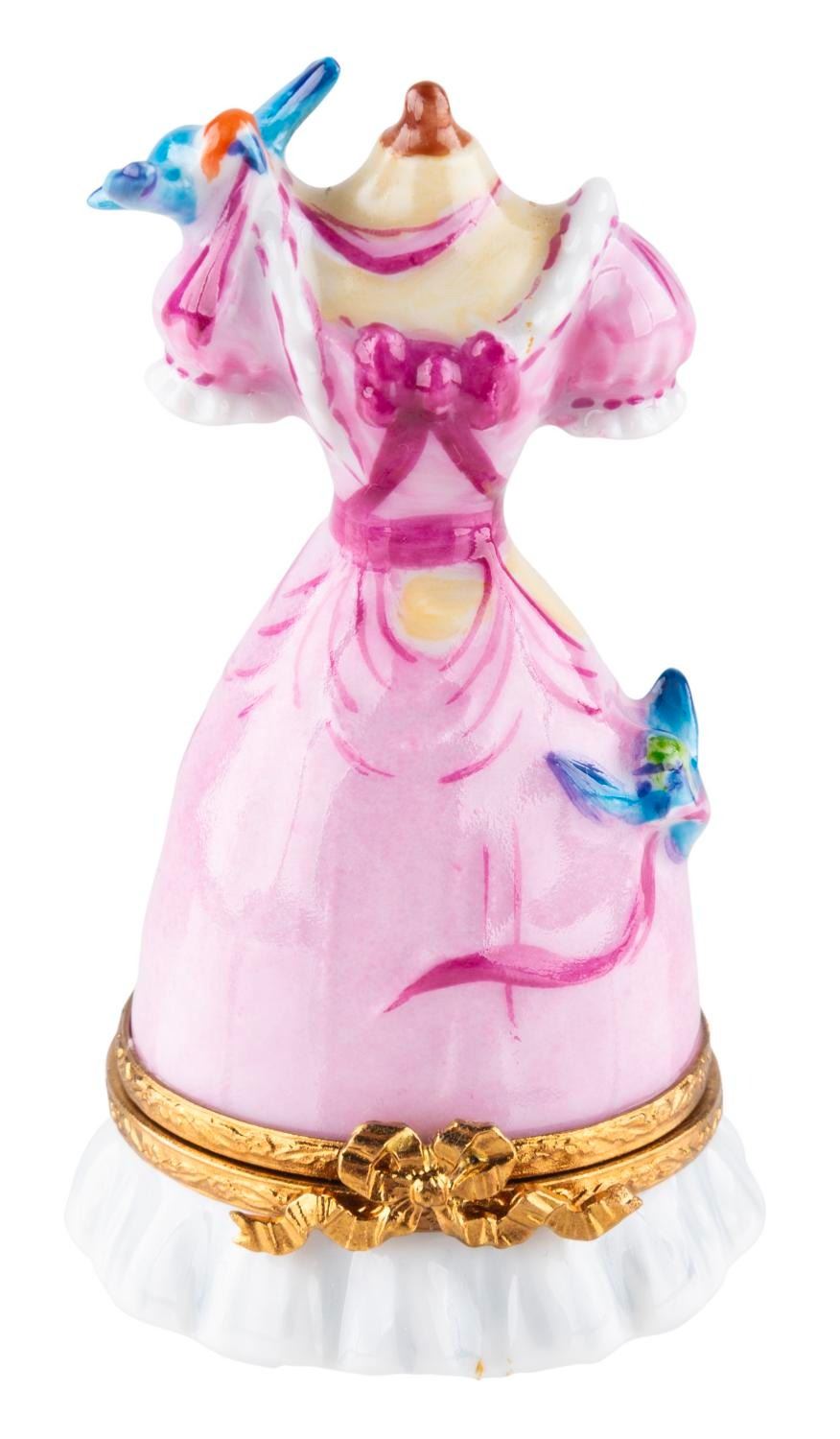 (Artoria, 2000s) A porcelain trinket box of the pink dress from "Cinderella," revealing Jaq when opened. Measuring 3" tall and 1.75" in diameter, the porcelain figurine is in very good condition with spots of discoloration.