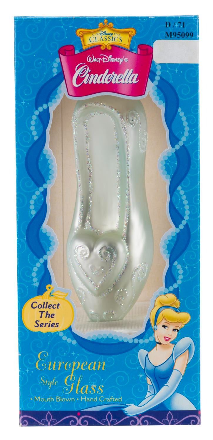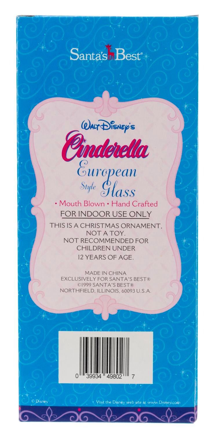 (Santa’s Best, 1999) A mouth-blown European Style Glass Ornament of the slipper from "Cinderella." Measuring 6" tall in its 4" x 4" x 9" original box, the handcrafted ornament displays in very good condition with light scratches and wear.