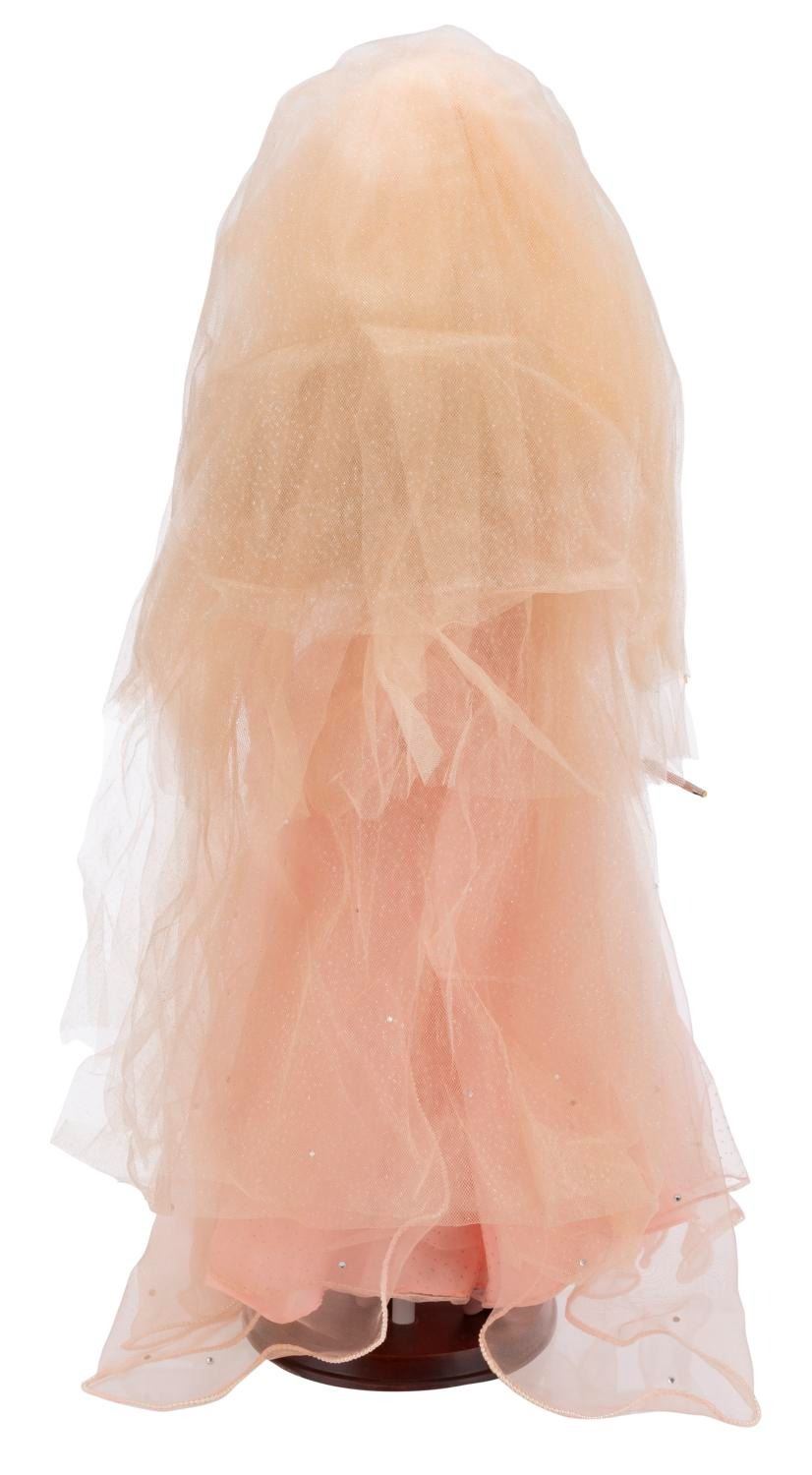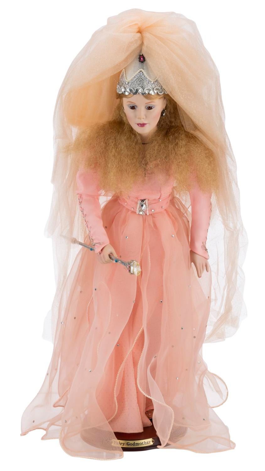 (Danbury Mint, 1980s) A hand-painted porcelain Fairy Godmother doll from the Cinderella fairy tale. Measuring 27 " tall with a display stand, the doll is in good condition with light discoloration and wear from age.