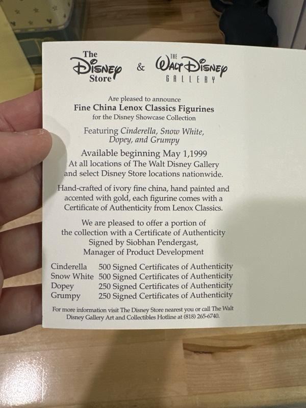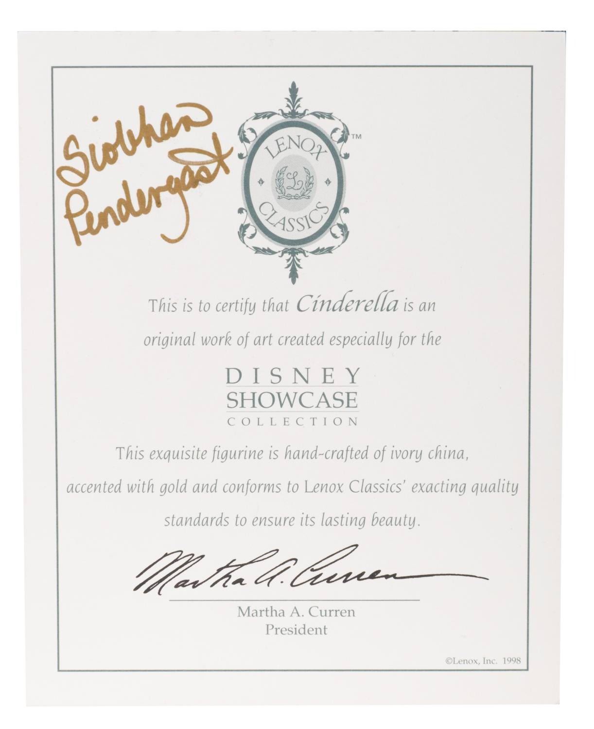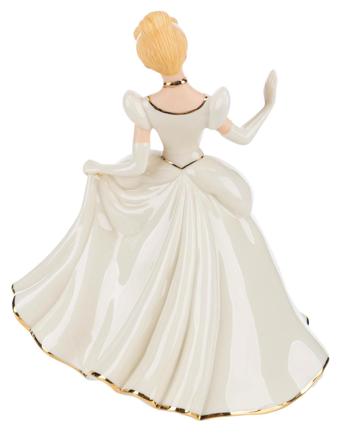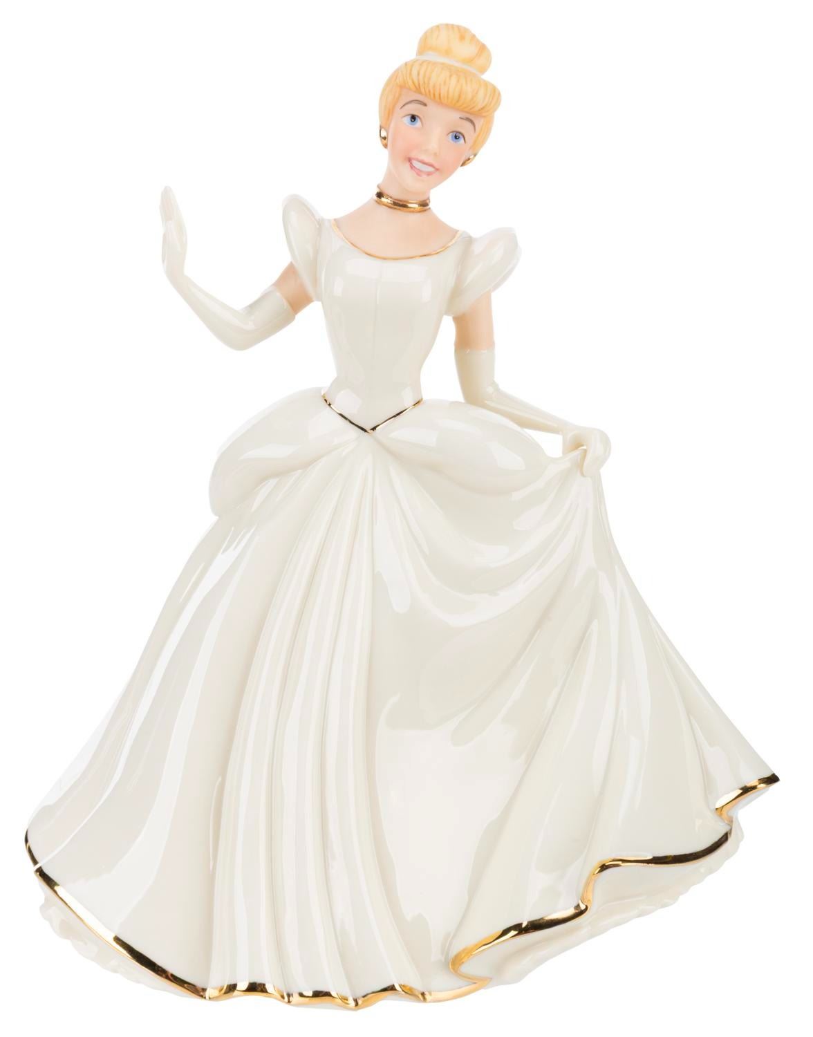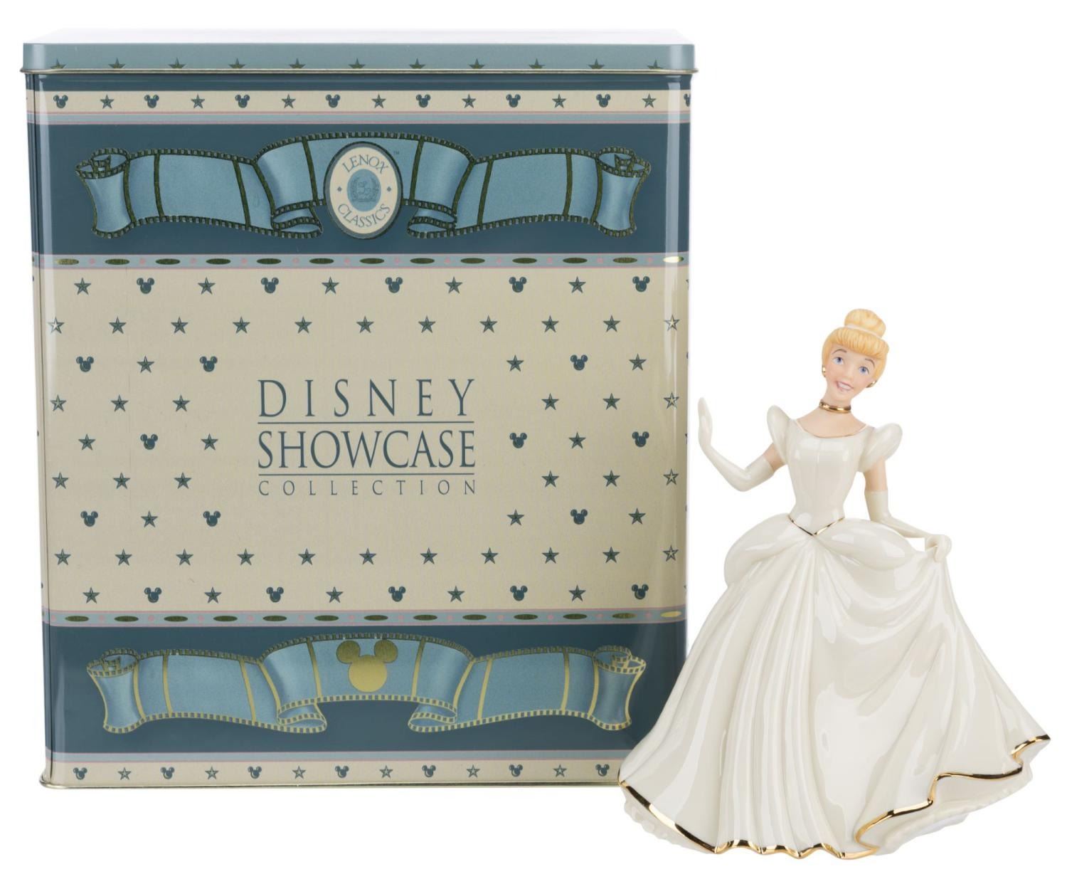 (Lenox Classics, 1998) A Disney Showcase Collection figurine of Cinderella, hand-crafted with ivory fine china and gold-tone accents by Lenox Classics. Measuring 7" tall with its original cardboard and 6.75" x 9" x 10.5" collectable metal box, Cinderella is in fine condition, while the boxes exhibit minimal shelf wear.