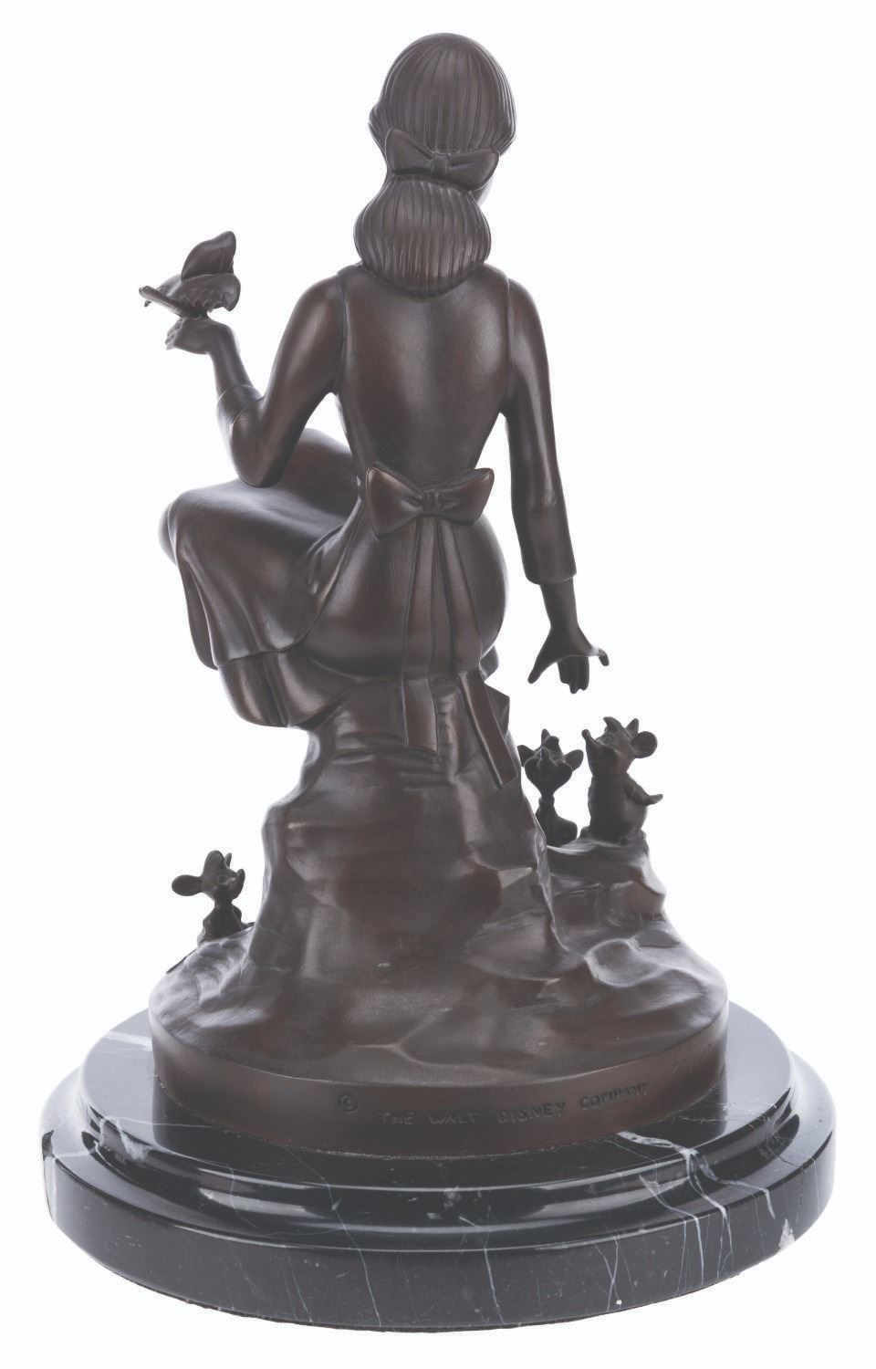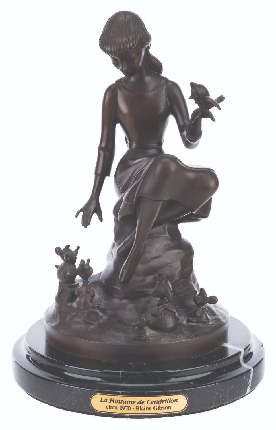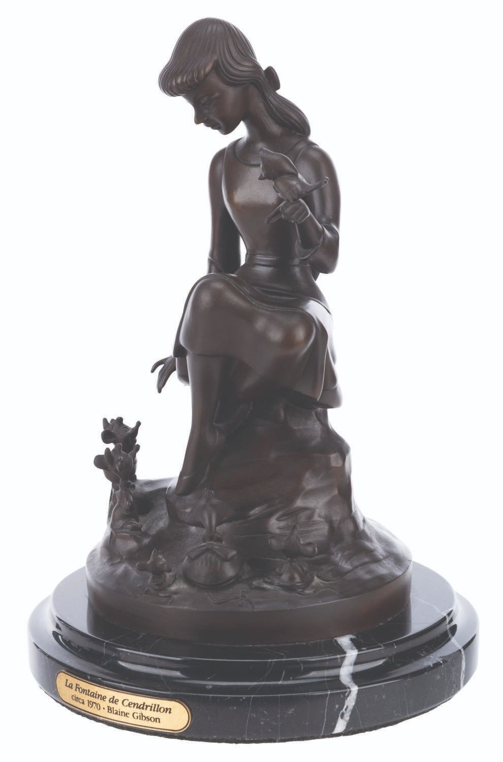 (Disney, 1989) A rare Cinderella statue titled "La Fontaine de Cendrillon." The piece recreates Disney Legend Blaine Gibson's larger statue from the Magic Kingdom, displayed at the Cinderella Fountain in Fantasyland. Numbered 79 of 100 and measuring 11" tall and 7.5" in diameter, the bronze statue on a marble base displays in very good condition with light scuffs and wear. The marble base exhibits chipping and cracks throughout, though it still maintains its integrity.