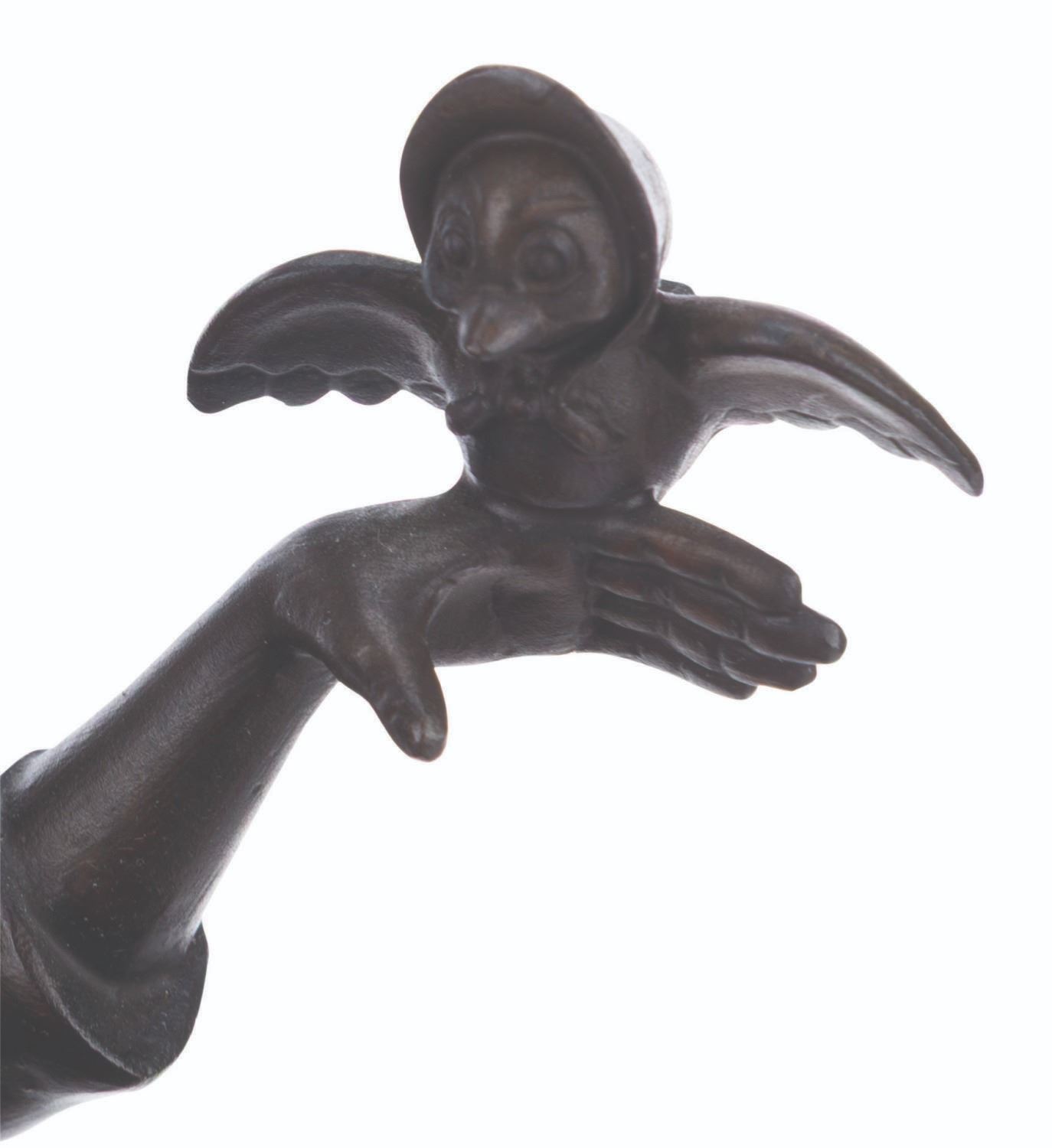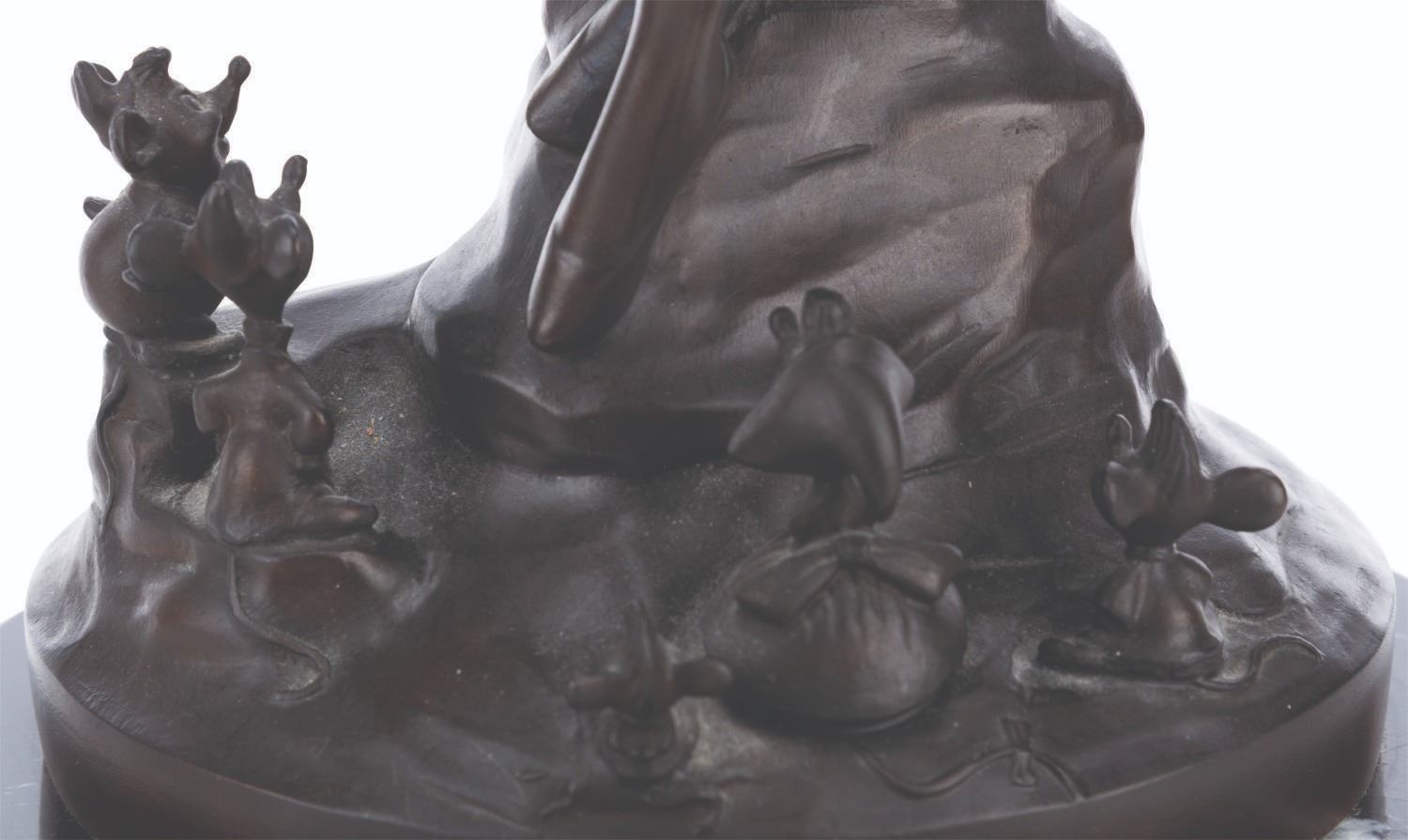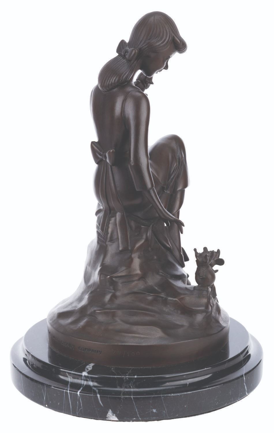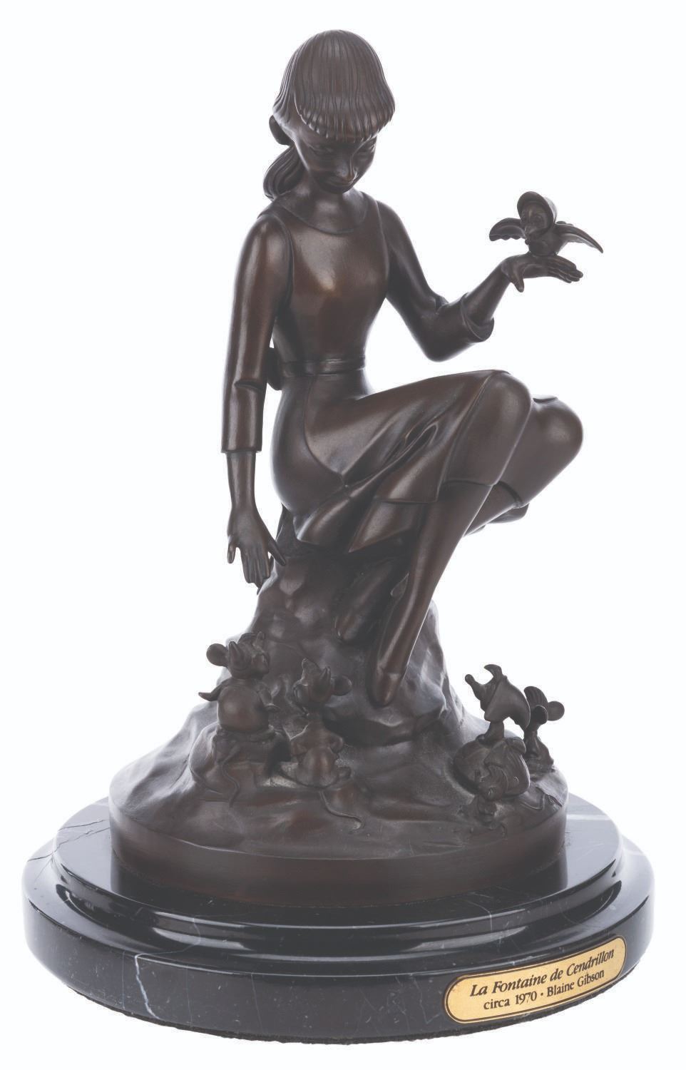 (Disney, 1989) A rare Cinderella statue titled "La Fontaine de Cendrillon." The piece recreates Disney Legend Blaine Gibson's larger statue from the Magic Kingdom, displayed at the Cinderella Fountain in Fantasyland. Numbered 79 of 100 and measuring 11" tall and 7.5" in diameter, the bronze statue on a marble base displays in very good condition with light scuffs and wear. The marble base exhibits chipping and cracks throughout, though it still maintains its integrity.