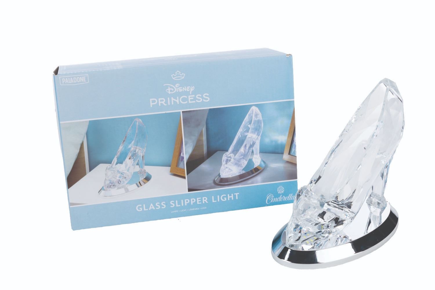 (Paladone, 2000s) A Disney Princess "Cinderella" light-up glass slipper, manufactured by Paladone. Requiring 3 AAA batteries (not included), the slipper worked when tested, featuring on and magical glowing modes. Measuring 7.5" x 4" x 7.5" tall, the plastic slipper comes with its original box and is in very good condition with light wear.