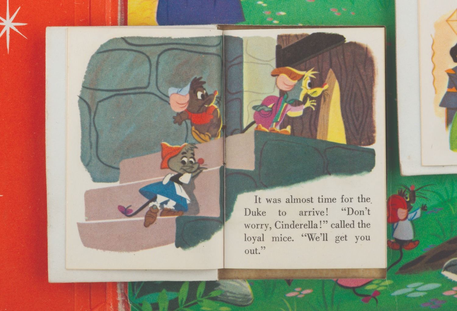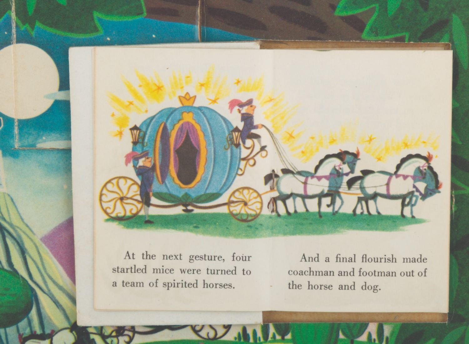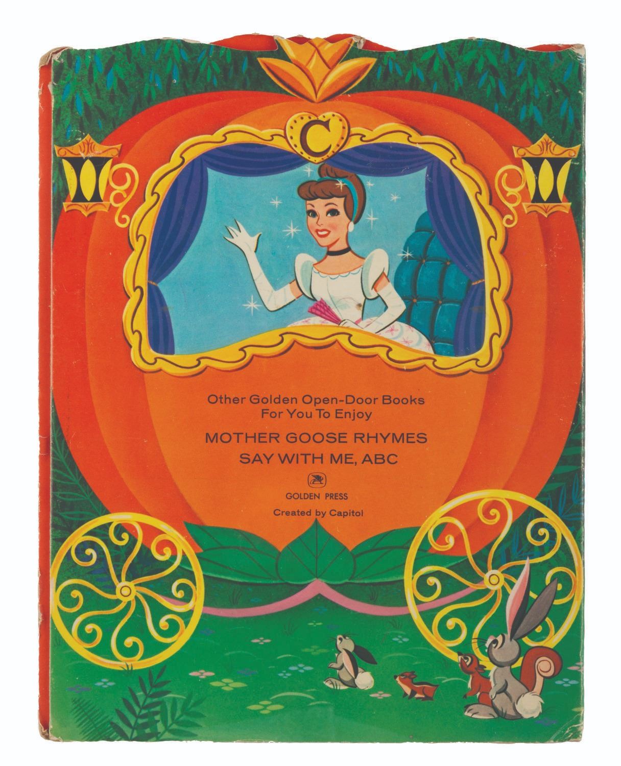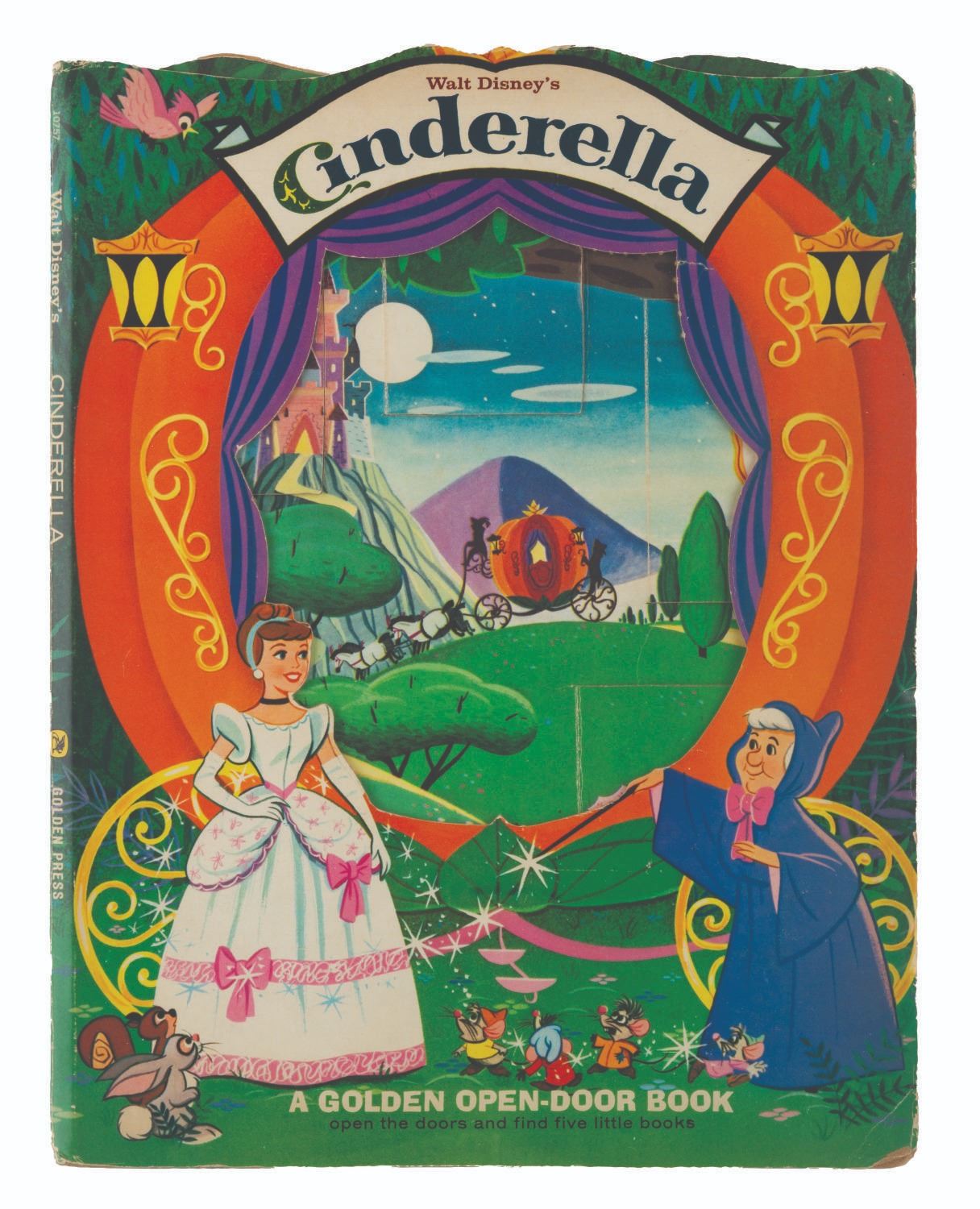 (Golden Press, 1965) A Cinderella open door book. The 9.75" x 12" cover opens to reveal five 3.5" x 2.25" books inside. The book is in good condition with typical handling wear, some pages slightly loose, and some discoloration from age on the last pages in the little books.