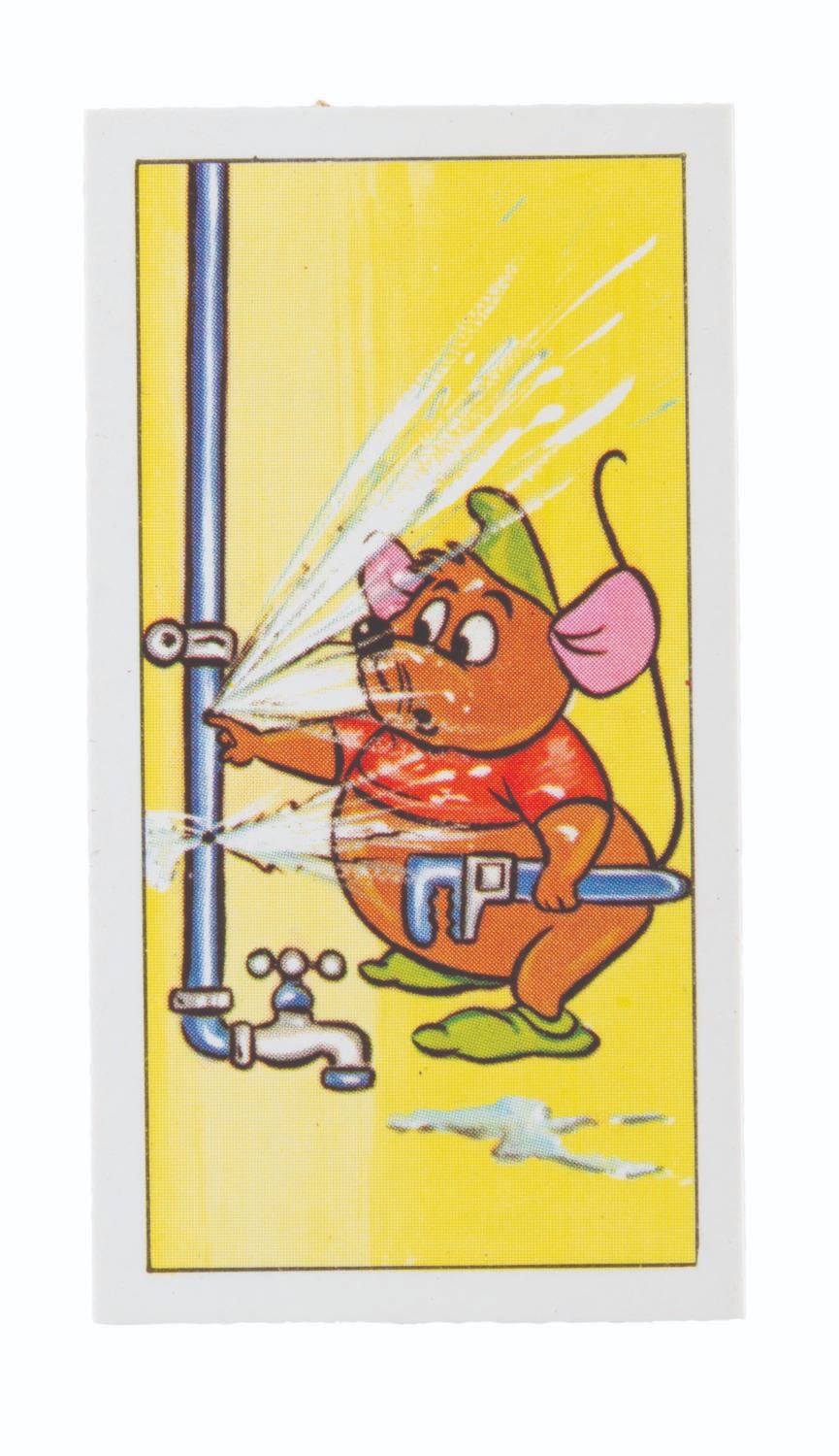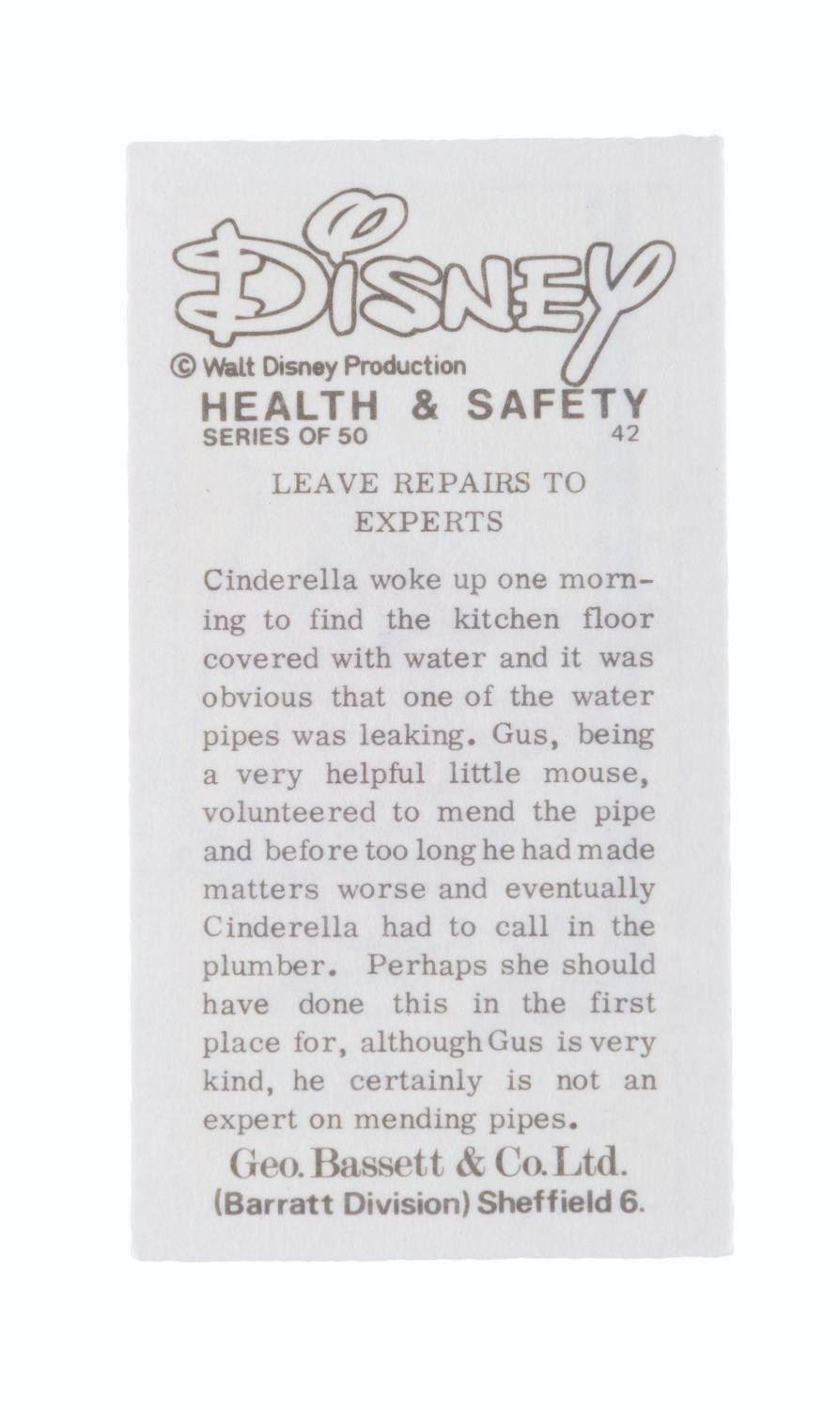 (Geo. Bassett & Co. Ltd., 1977) A Health & Safety card of Gus from "Cinderella " reminding us to "leave repairs to experts. " The card released in a series of 50 measures 1.5 " x 2.75 " and is in very good condition with light wear.