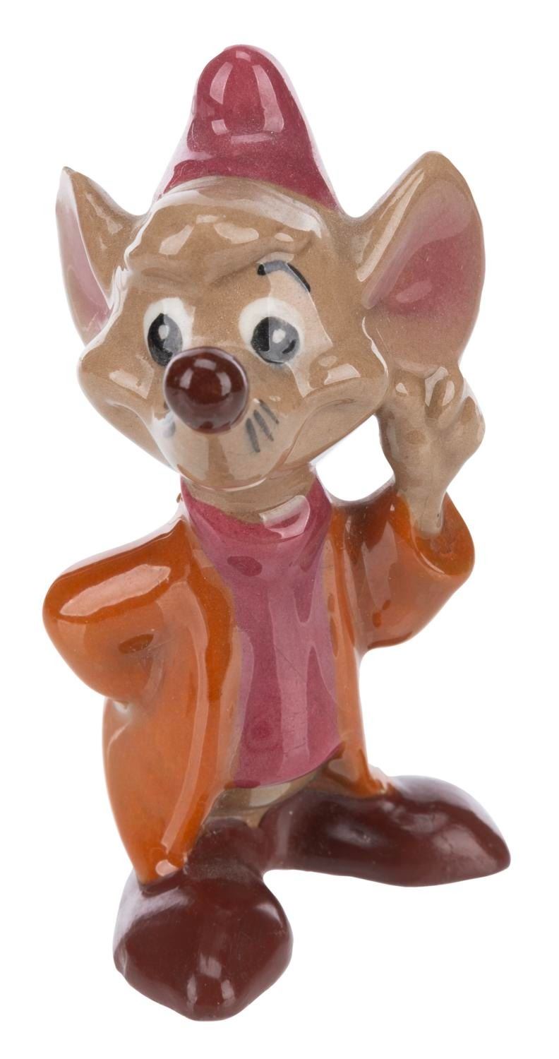 (Shaw, 1950s) A painted and glazed ceramic figurine of Jaq from"Cinderella" manufactured by Evan K. Shaw Pottery. Measuring 2" x 2" x 3.75" tall, the figure is in fair condition with chips to the ears.