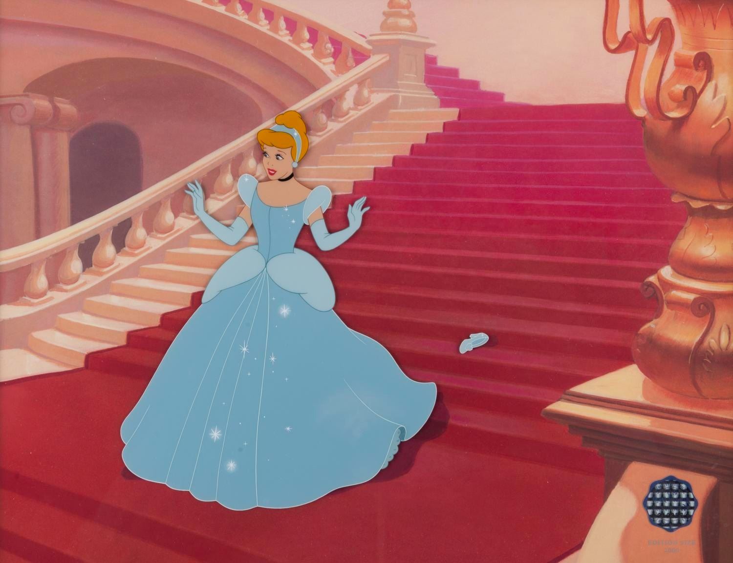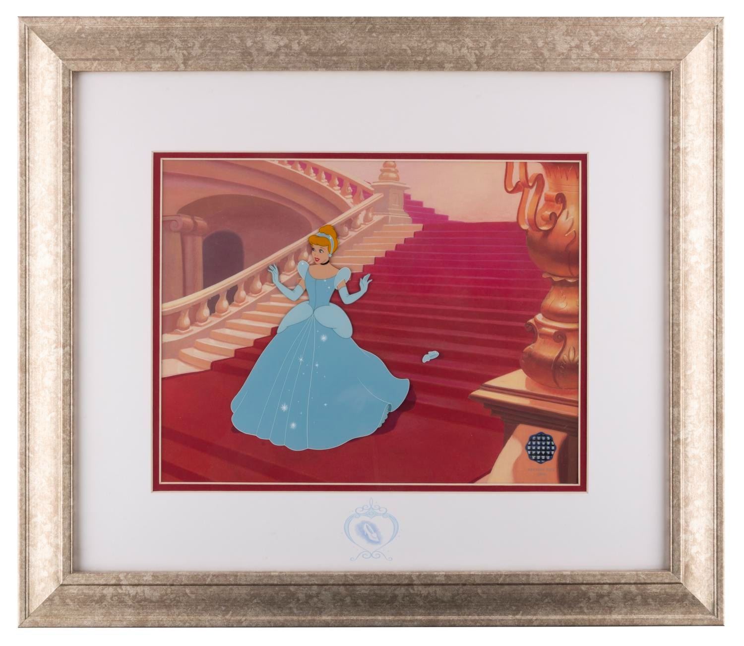 (Animated Animation Company, 2003) A limited edition sericel of the fateful moment Cinderella loses her glass slipper as she dashes from the ball. Part of an unnumbered edition size of 2000, the sericel is masterfully framed with a color reproduction background. The character has an image size of 6.75" x 7" on a 10" x 13" visible background in a 19" x 22" frame. The sericel is in fine condition, while the frame exhibits very minimal soiling from storage.