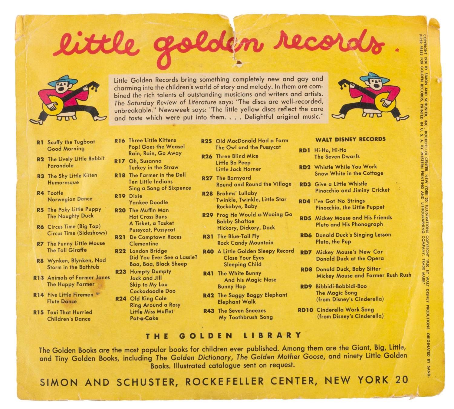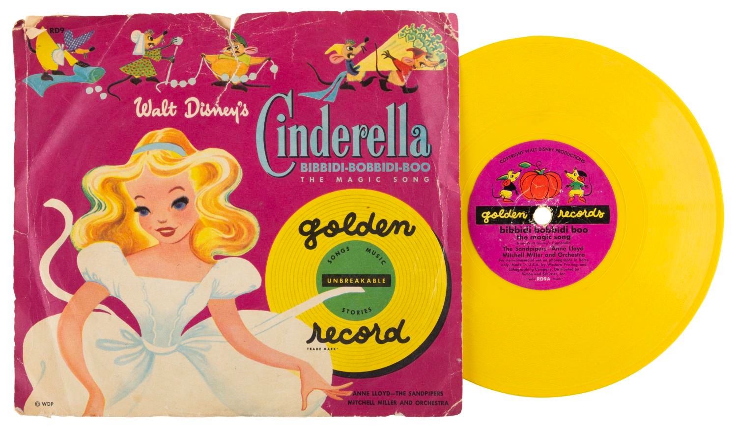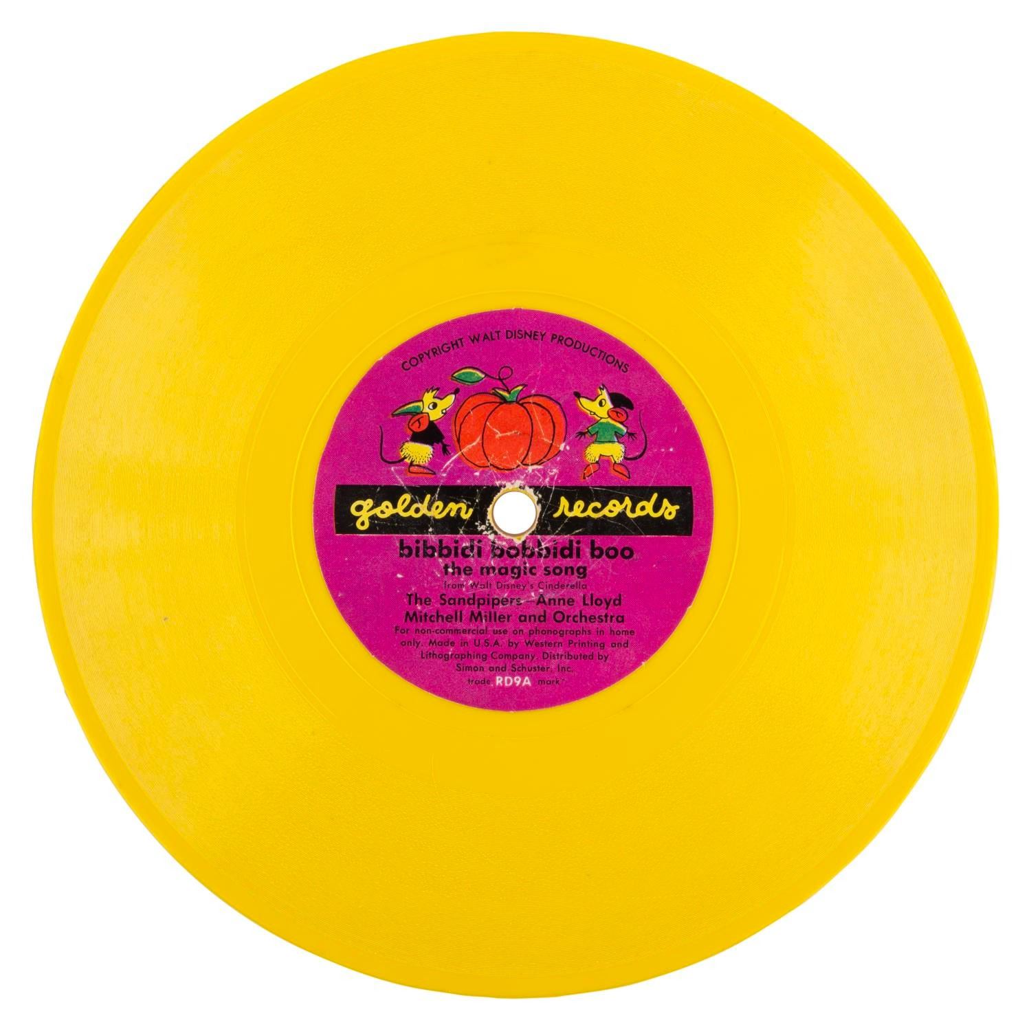 (Simon and Schuster, 1950) A Little Golden Record of Walt Disney's "Cinderella" featuring "Bibbidi-Bobbidi-Boo." Measuring 6" in diameter, the record is in very good condition with scratches and wear, while the sleeve is in fair condition with heavy tears, creases, paper loss, and wear throughout.