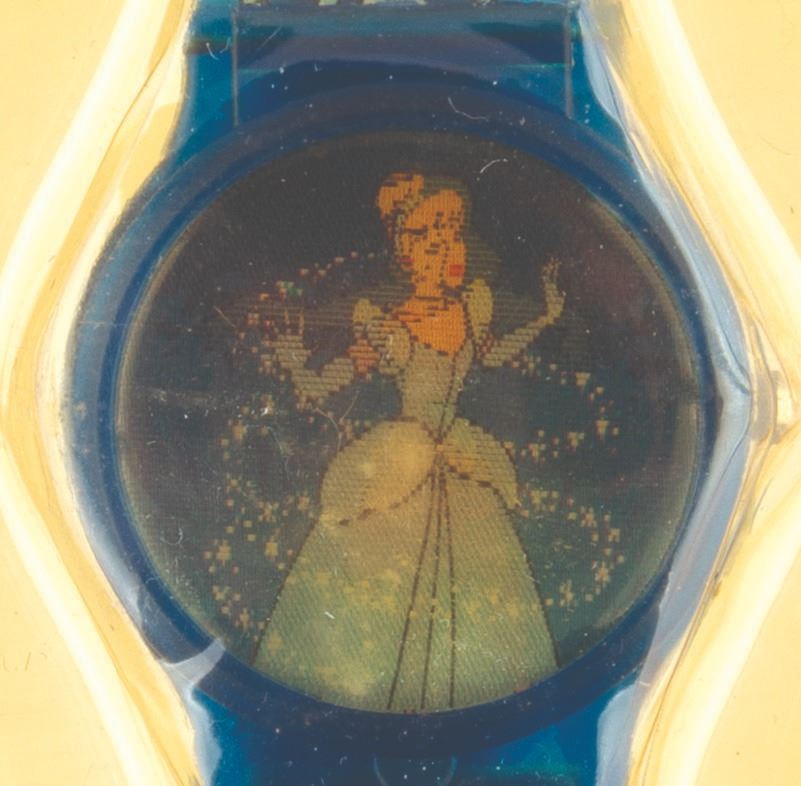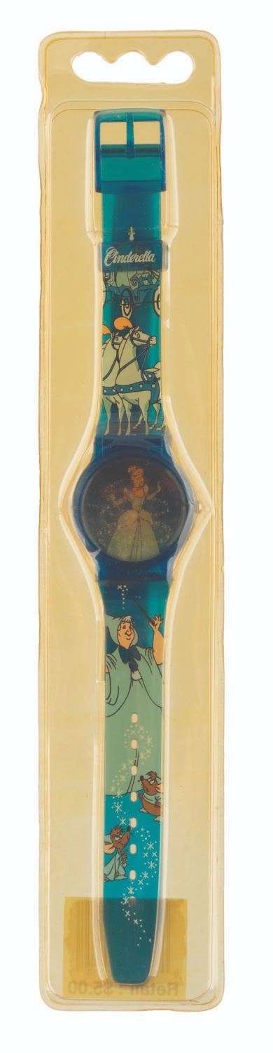 (Disney, 1990s) A "Cinderella " magic motion lenticular watch, showing the ball gown transformation. The watch is in fine condition, requiring a battery and possibly service to function, sealed in the original packaging that is slightly discolored from age.