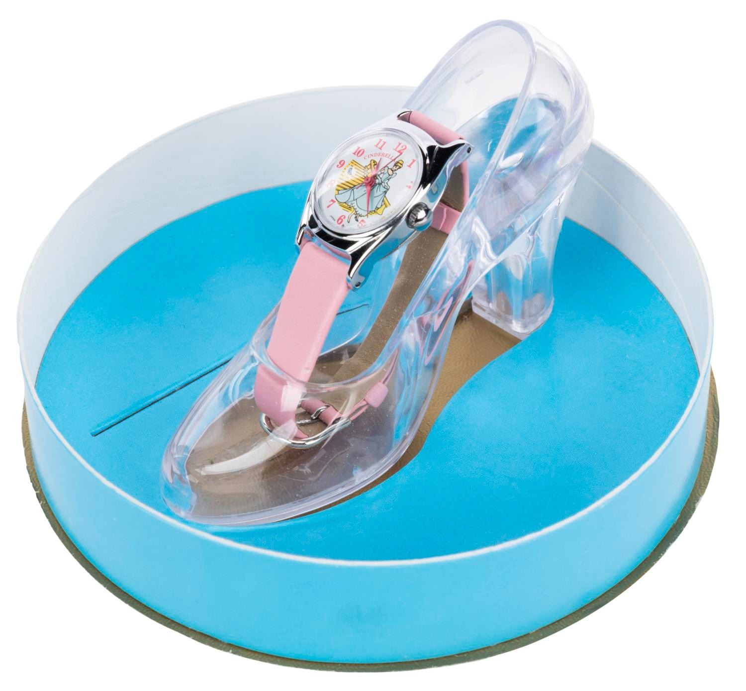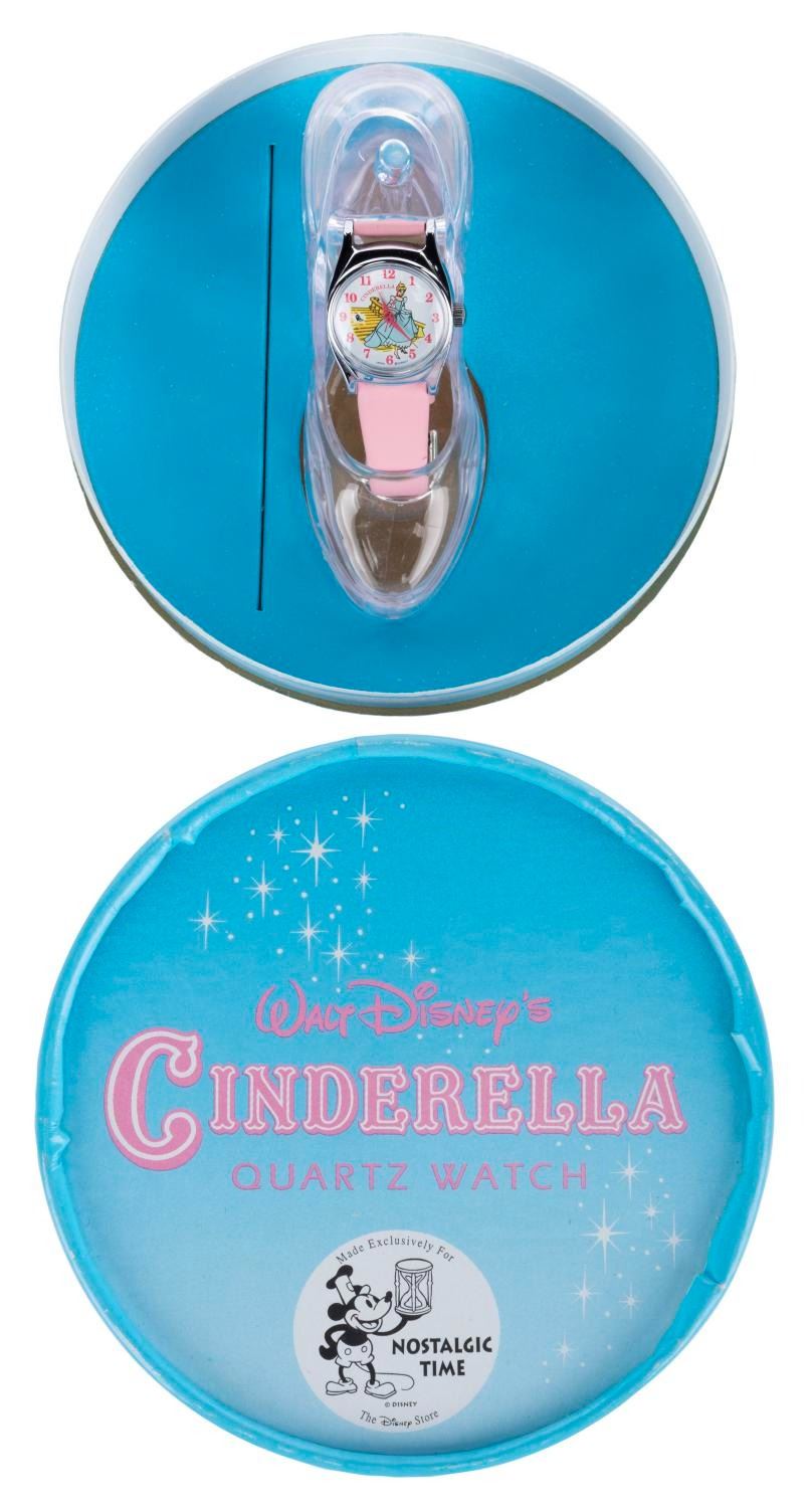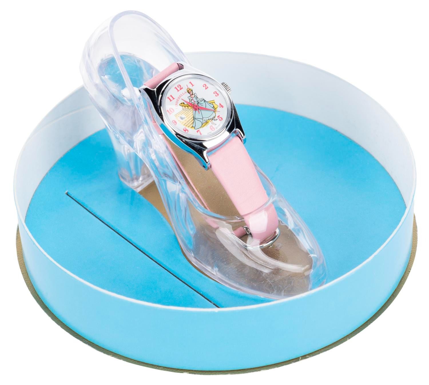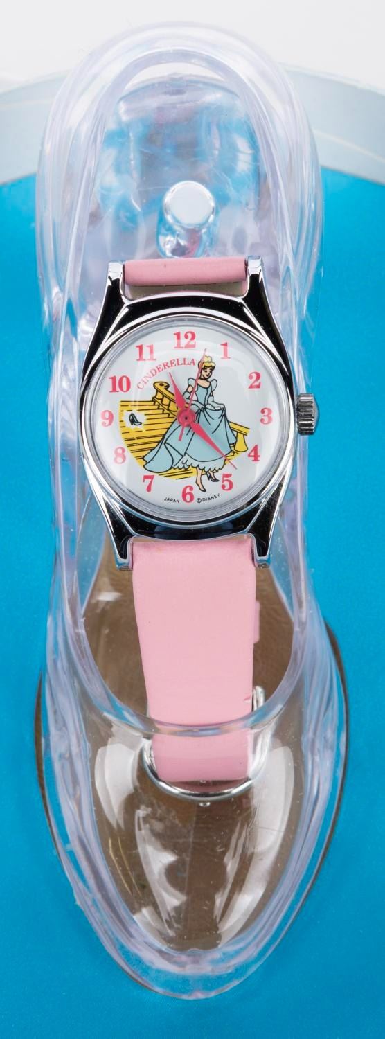 (Disney, 1990s) A "Cinderella" quartz watch, part of The Disney Store's Nostalgic Time collection, displayed on a plastic glass slipper. The watch did not work when tested, likely requiring repair or a new battery. The watch comes with its original case and is in very good condition with creases on the band.