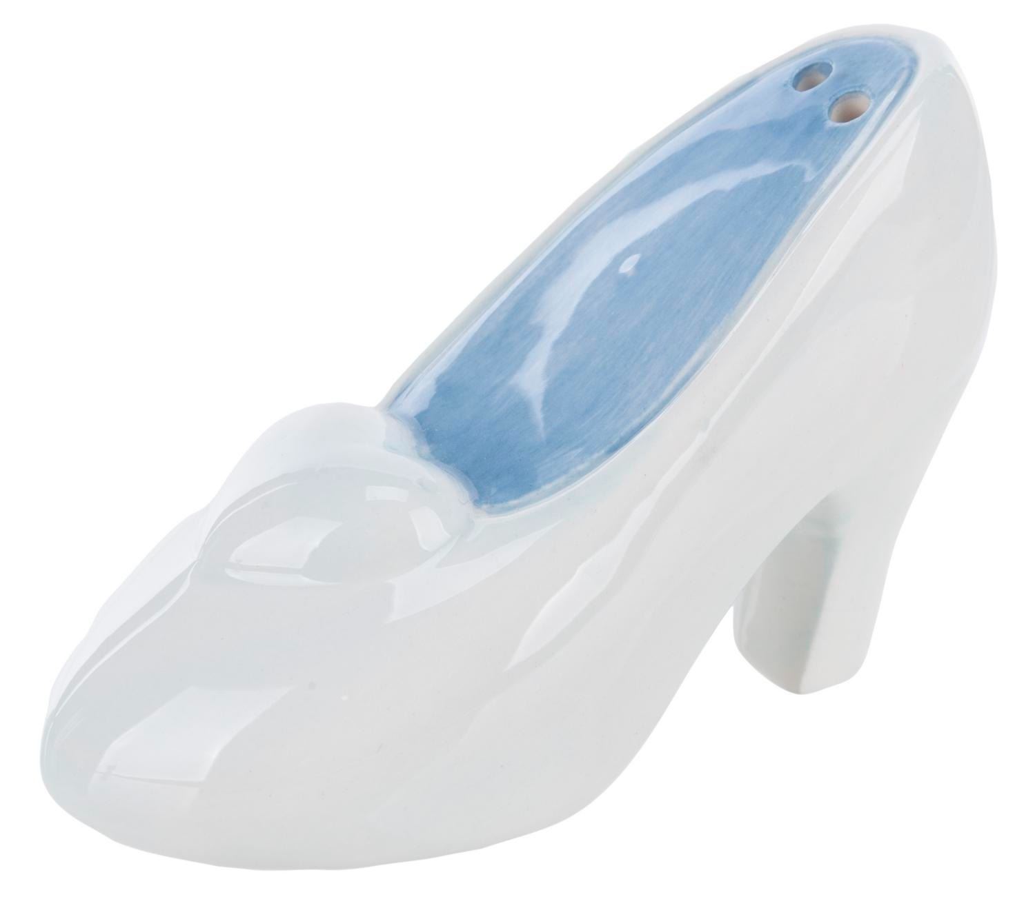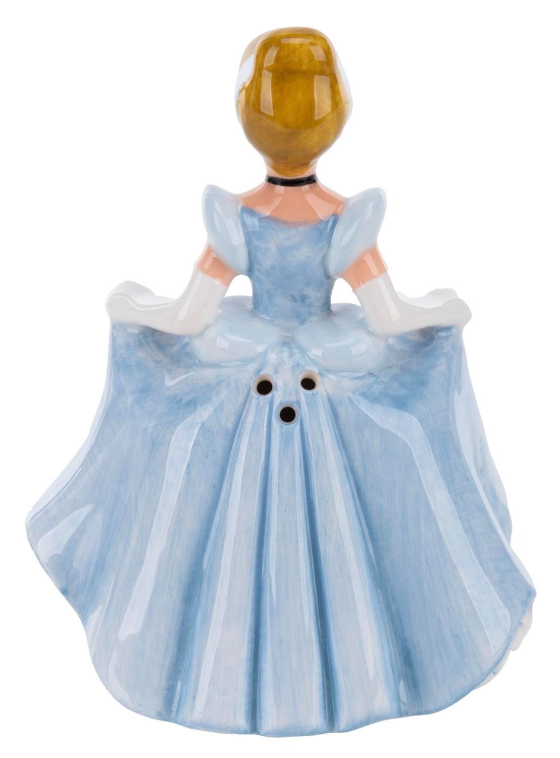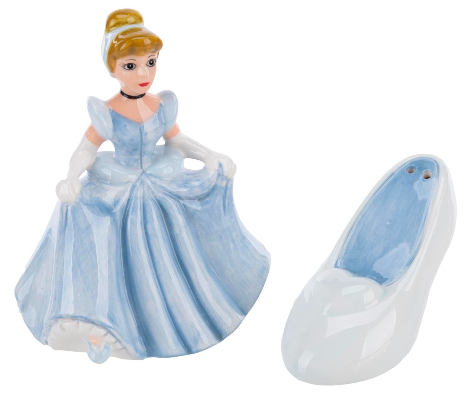 (Disney, 1990s-2000s) A ceramic "Cinderella " salt and pepper shaker set, including Cinderella and her glass slipper. Measuring 1.5 " x 3 " x 2 " to 3 " x 3.25 " x 4.25 " tall, the set is in fine condition.