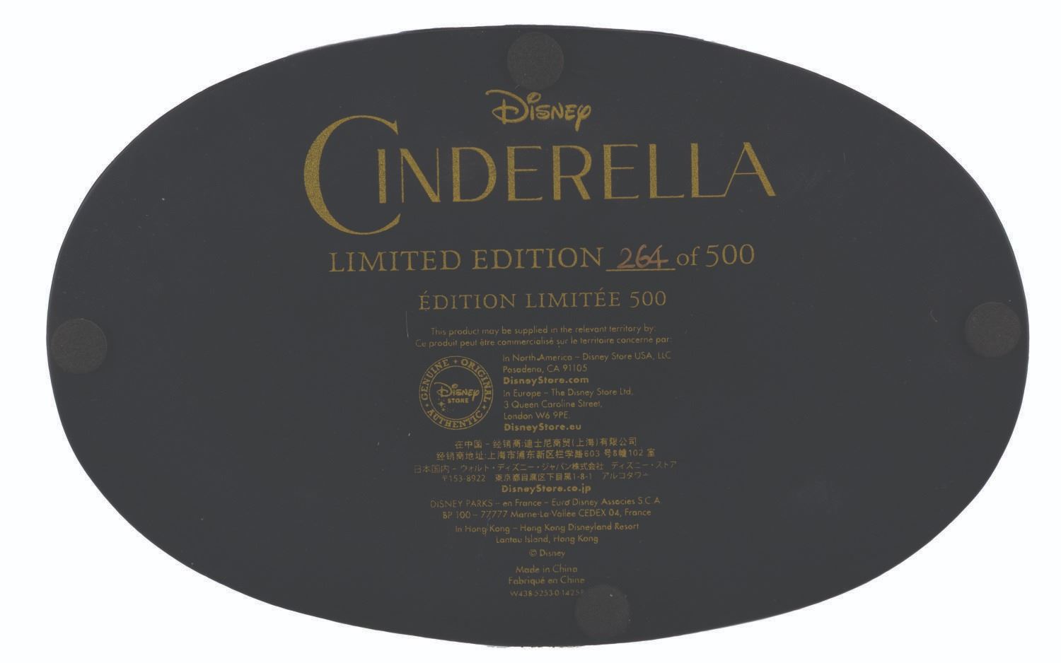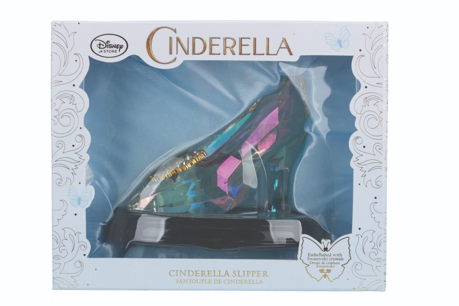 (Disney, 2015) A "Cinderella " replica slipper embellished with Swarovski crystals, released in a limited edition and numbered 264/500. Measuring 7 " x 4 " x 5.75 " in its 9.75 " x 6 " x 8 " original box, the slipper is in very good condition with light scratches and wear.