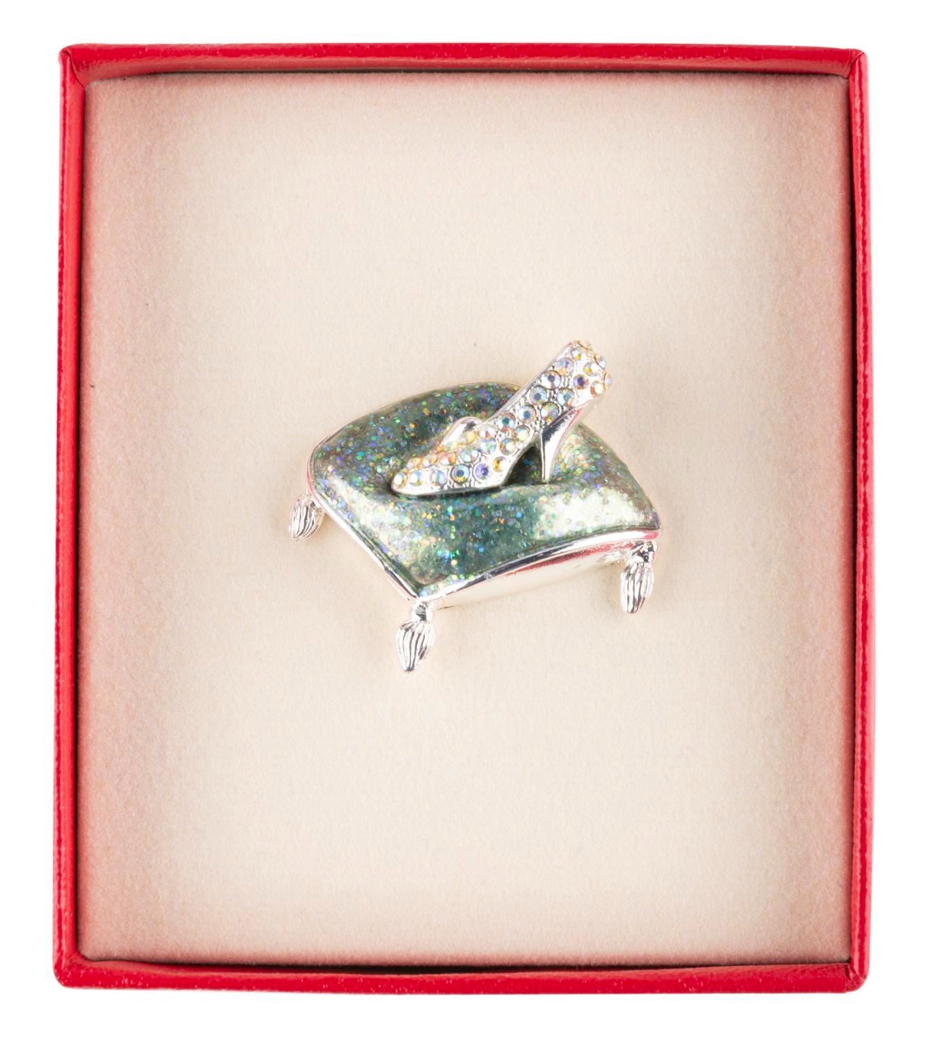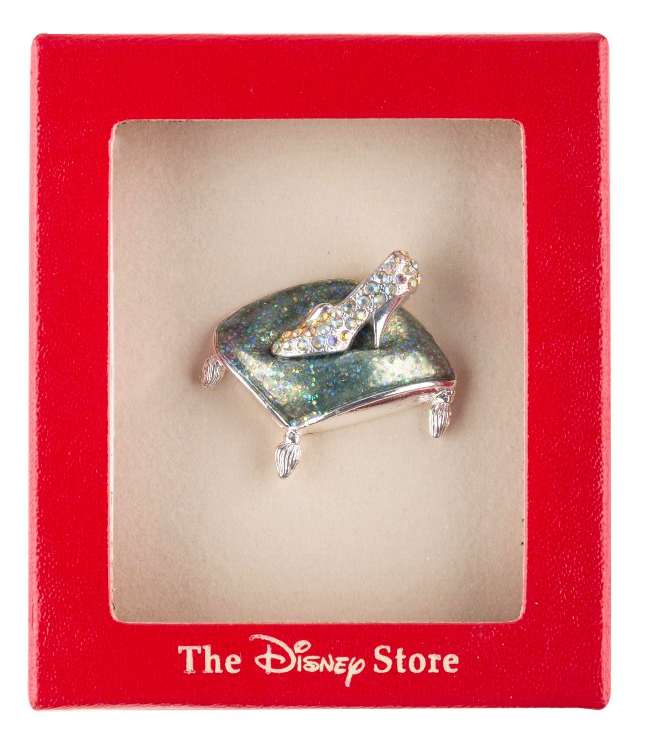 (Disney, 1990s-2000s) A sparkly "Cinderella" glass slipper brooch originally sold at The Disney Store. The brooch comes with its original box and is in fine condition.