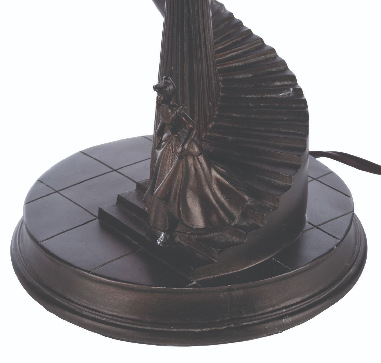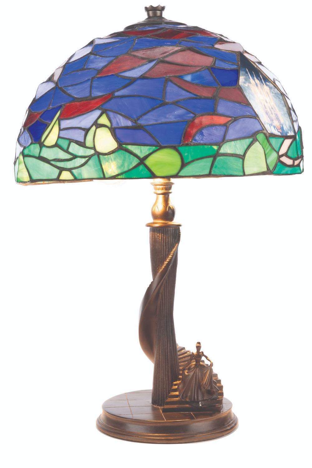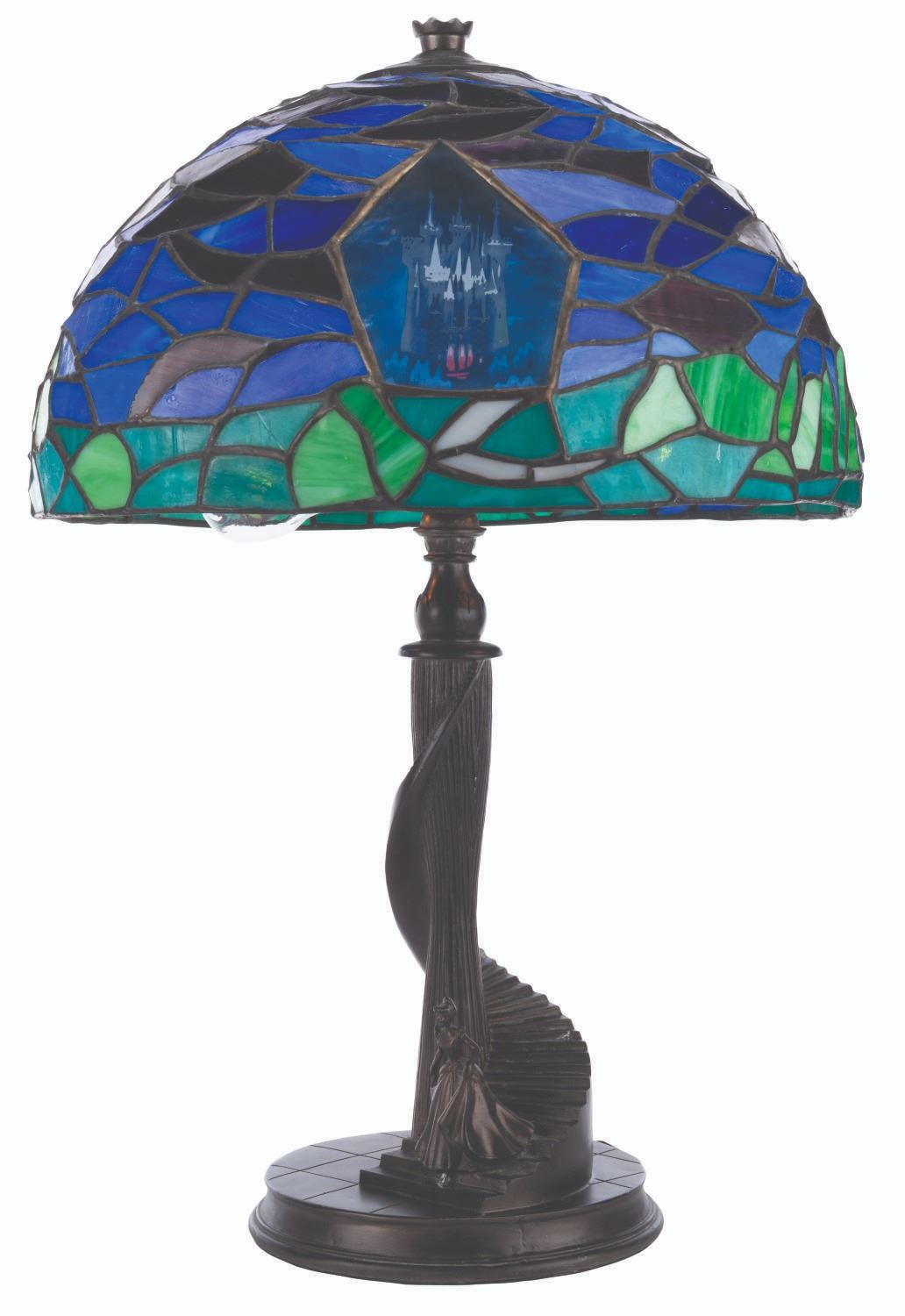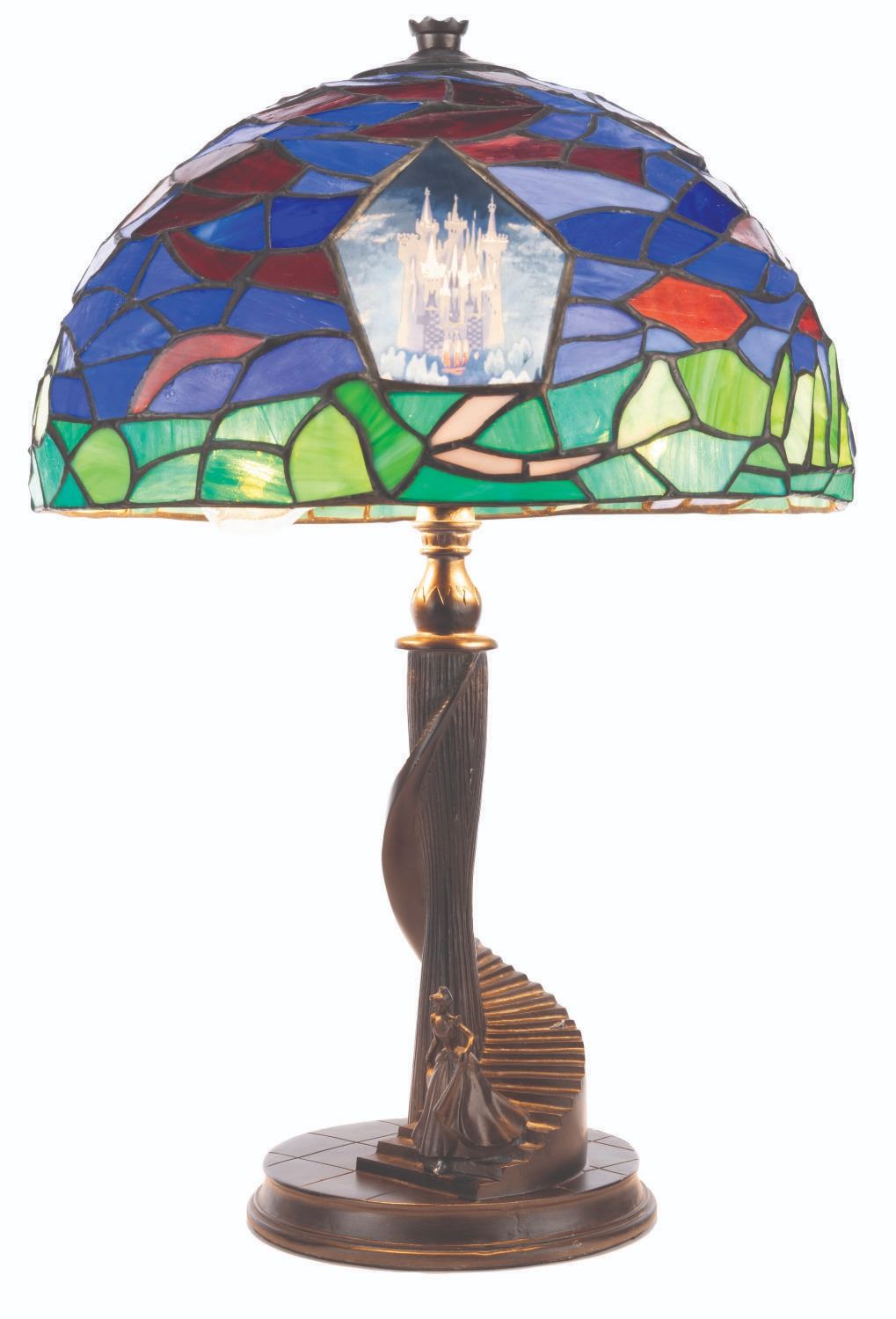 (Disney, 2003) A stained-glass"Cinderella" lamp by Jody Daily, released in a limited edition of 1500. When the stained-glass shade is illuminated, a silhouette of Cinderella's carriage appears. Two frosted light bulbs are included to bring the magic to life. Measuring 19" tall and 13.25" in diameter, the bronze lamp is in very good working condition with light scratches, scuffs, and wear.