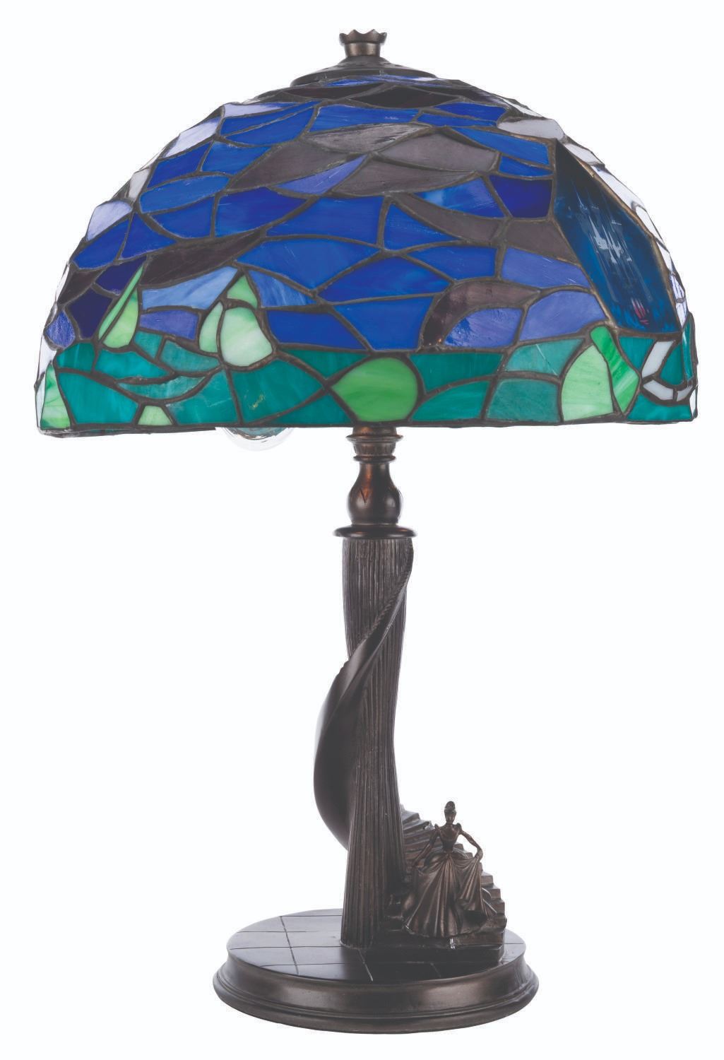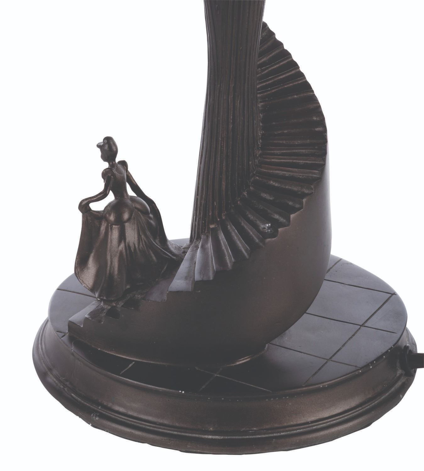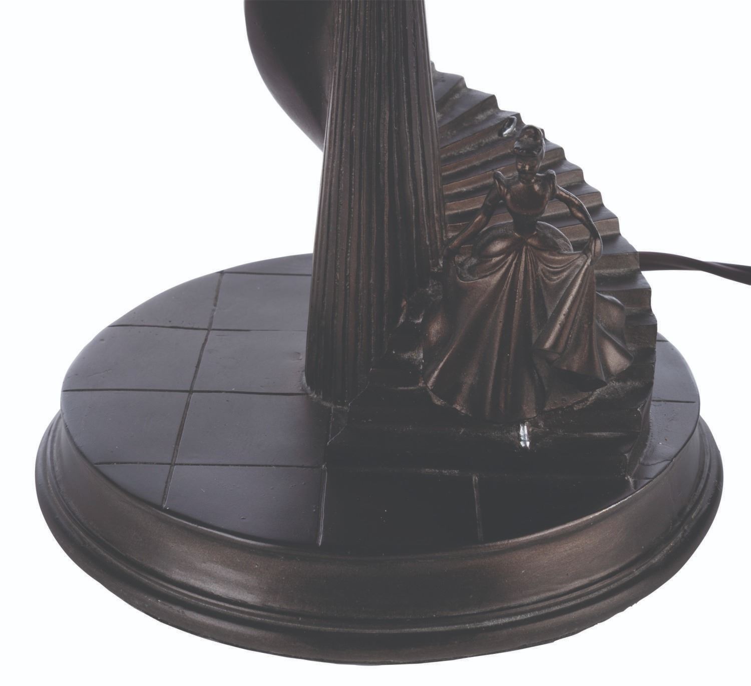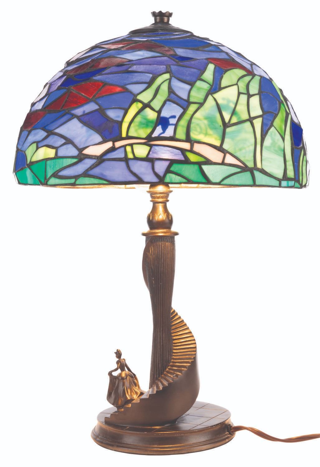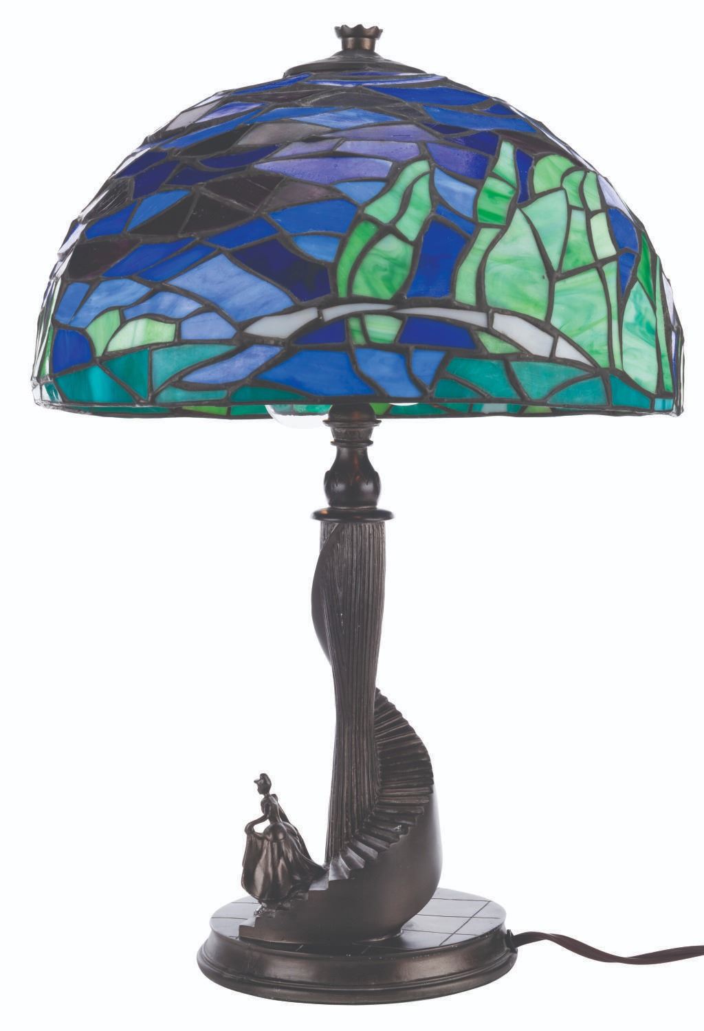 (Disney, 2003) A stained-glass"Cinderella" lamp by Jody Daily, released in a limited edition of 1500. When the stained-glass shade is illuminated, a silhouette of Cinderella's carriage appears. Two frosted light bulbs are included to bring the magic to life. Measuring 19" tall and 13.25" in diameter, the bronze lamp is in very good working condition with light scratches, scuffs, and wear.