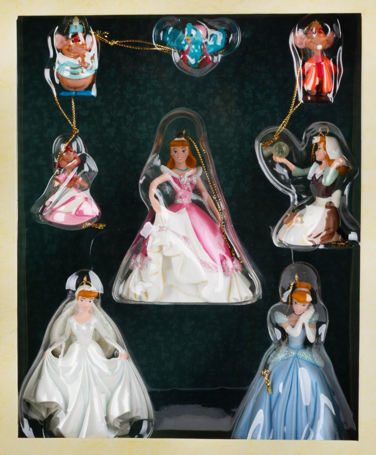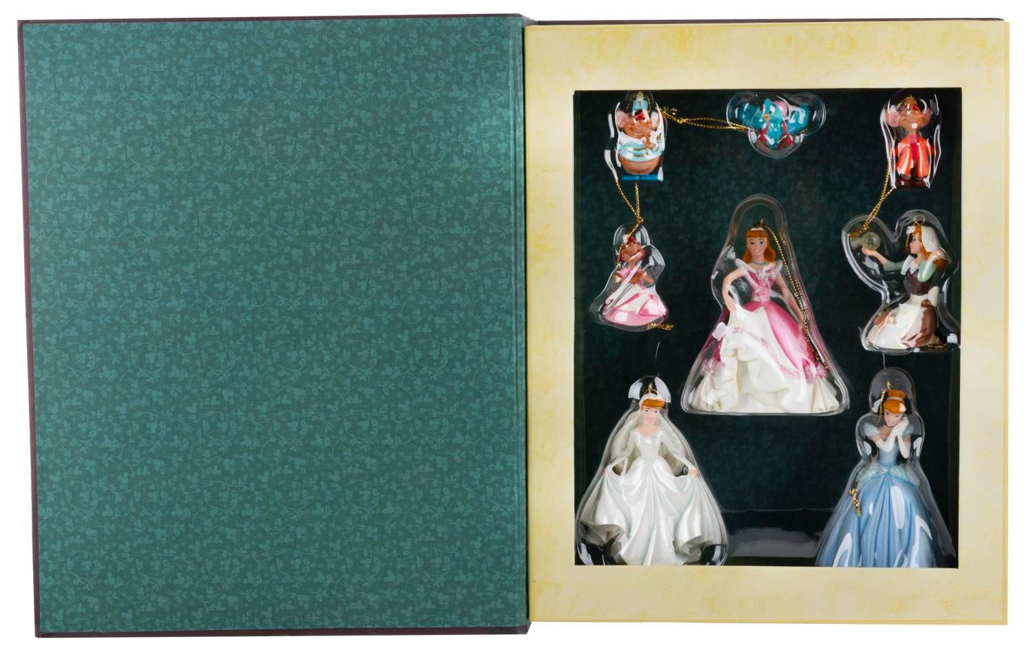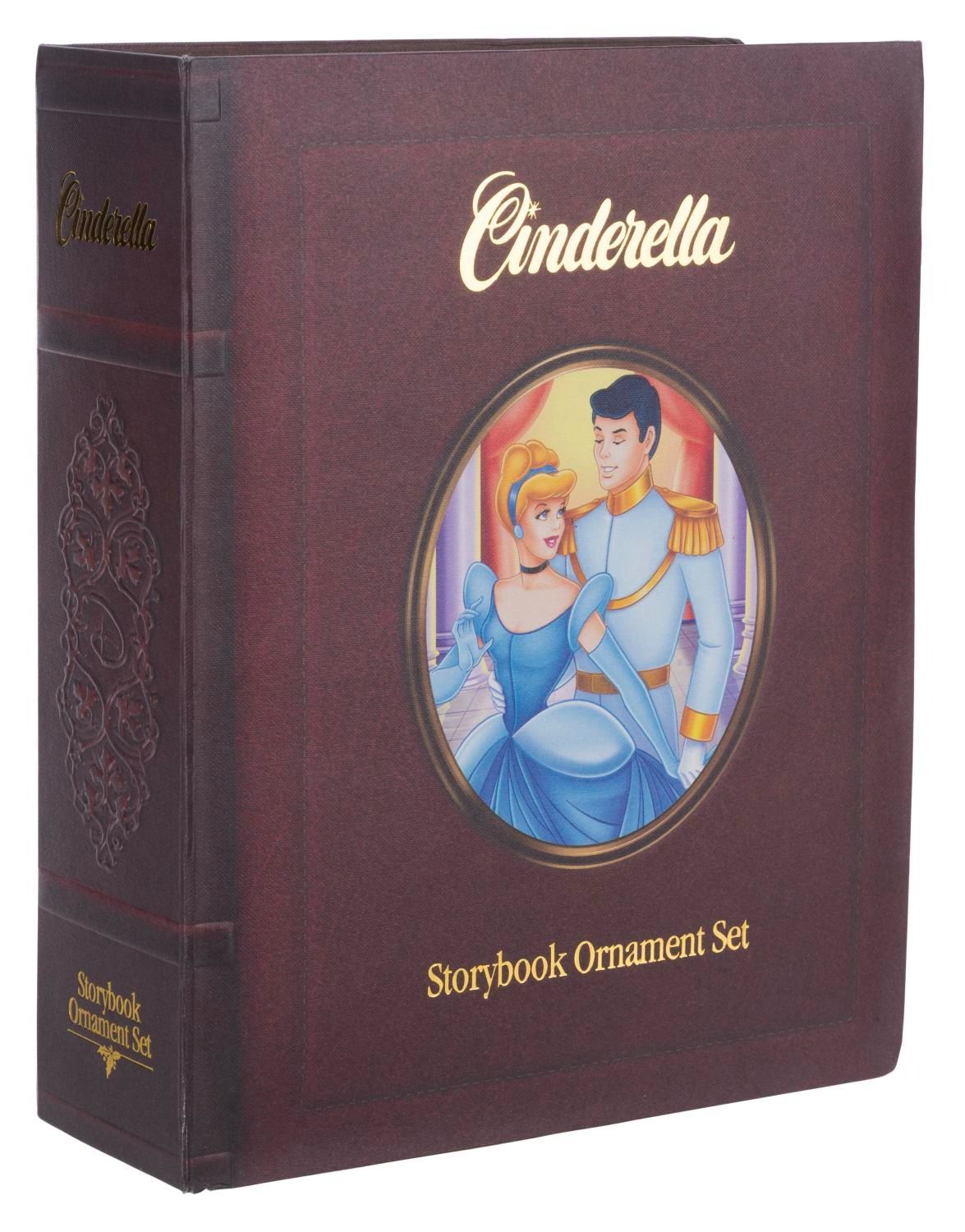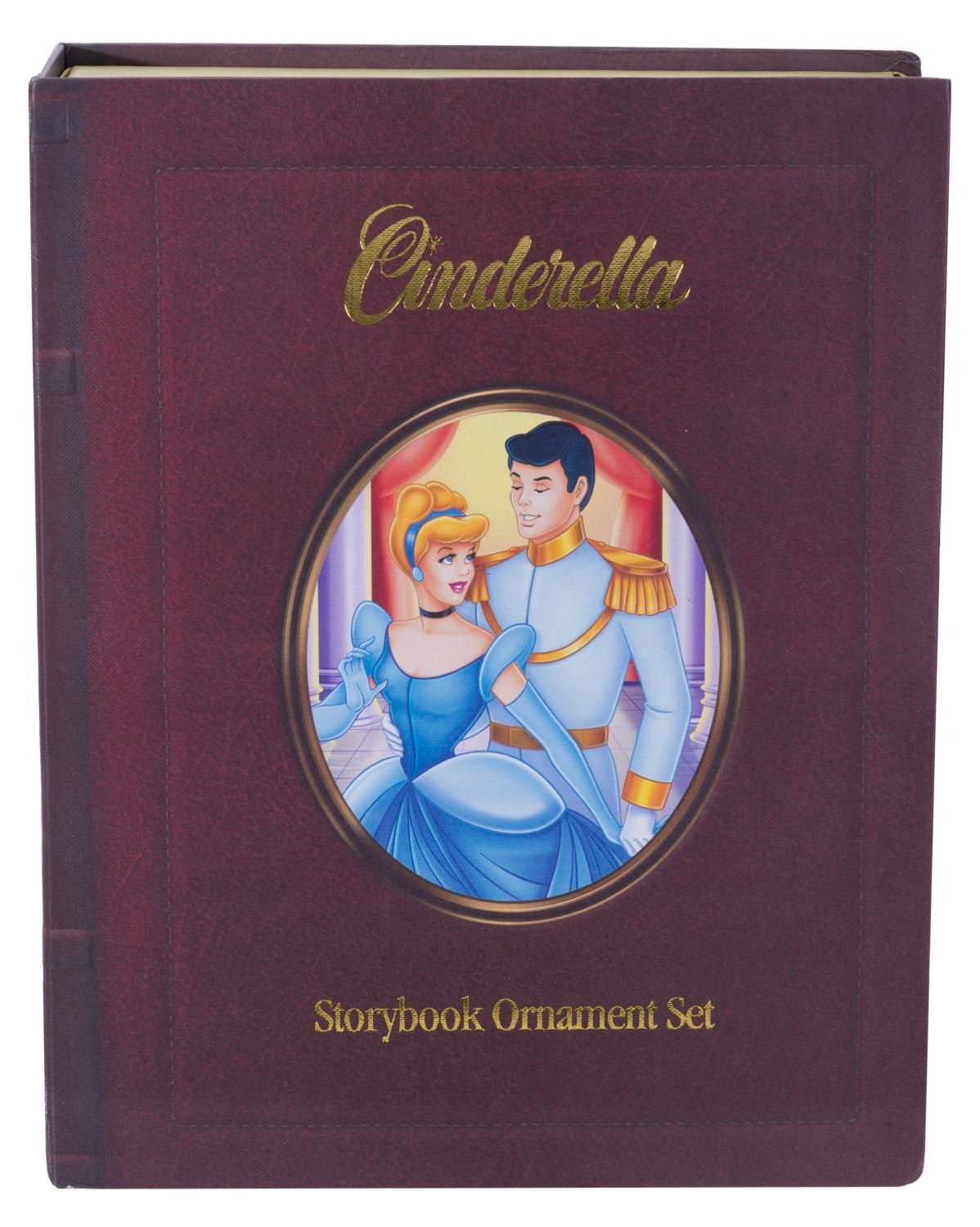 (Disney, 2000s) An eight-piece figural "Cinderella" Storybook Ornament set, including four of Cinderella, Gus, Jaq, Perla, and the bluebird. Measuring 3.5" x 9.25" x 11.75", the ornaments are in fine condition, while the storybook box exhibits light shelf wear.