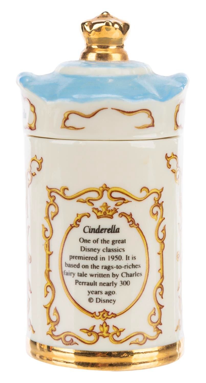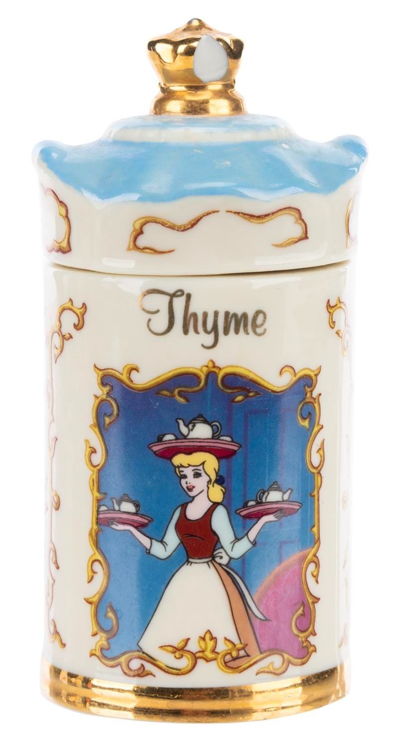(Lenox, 1995) A Walt Disney Spice Jar Collection Thyme jar featuring "Cinderella. " Measuring 2 " in diameter x 4 " tall, the jar displays in good condition with wear from use, and a 0.25 " chip in one side of the gold crown decoration on top.