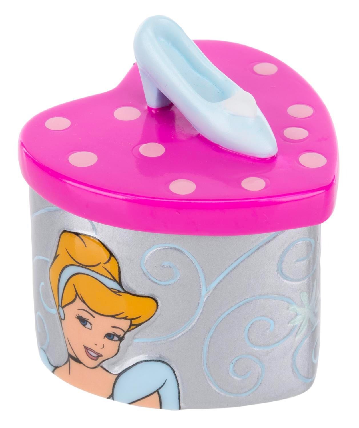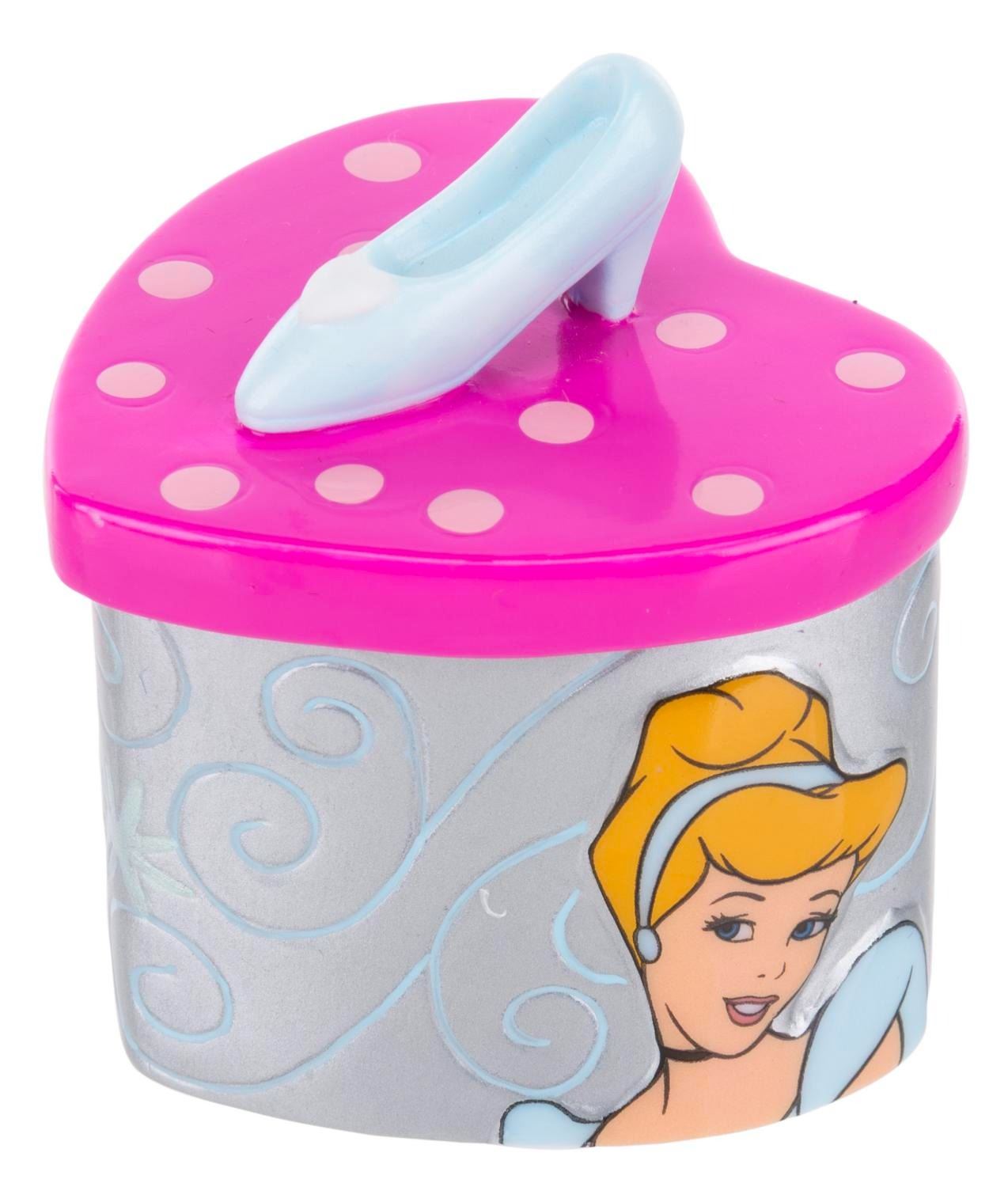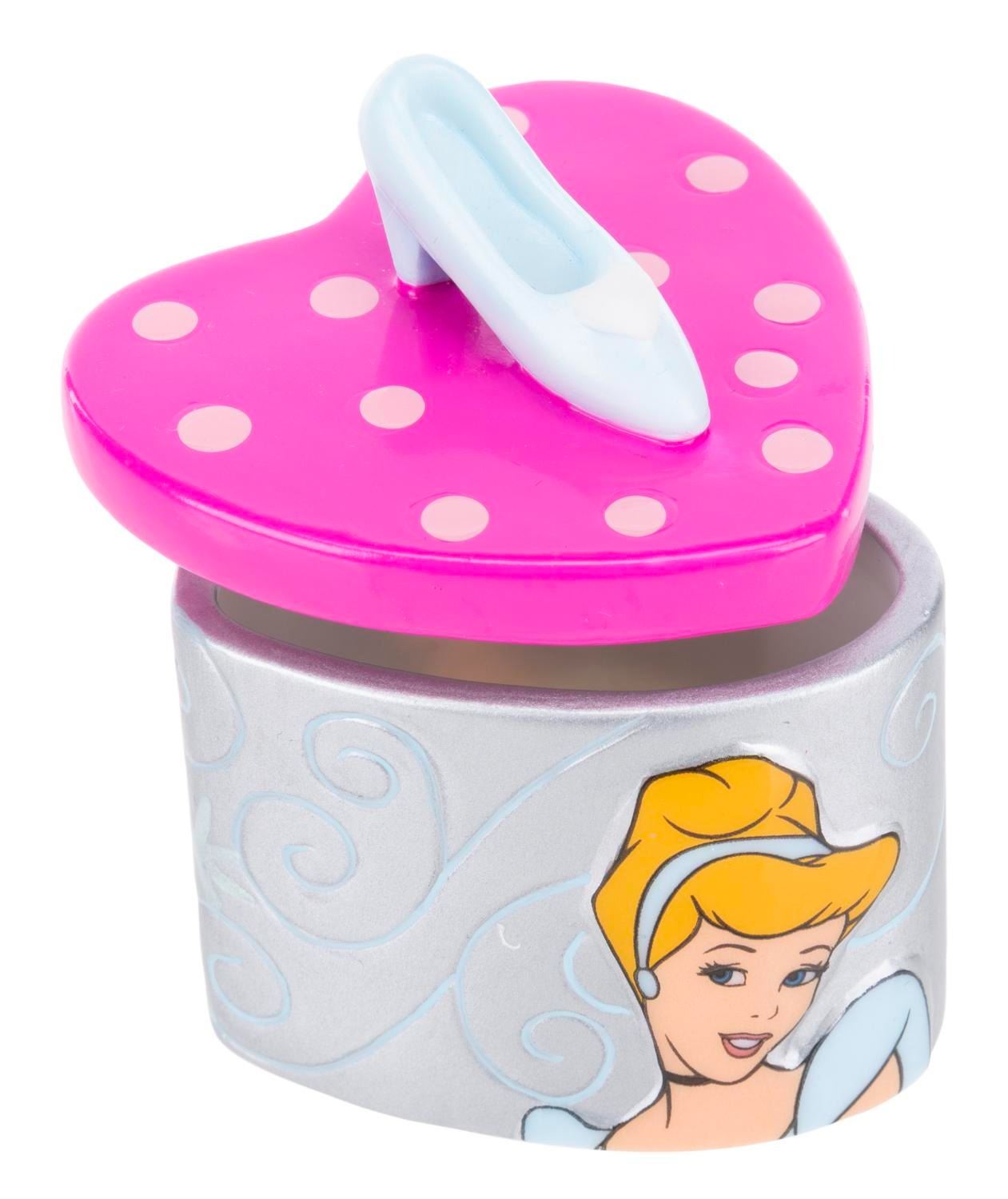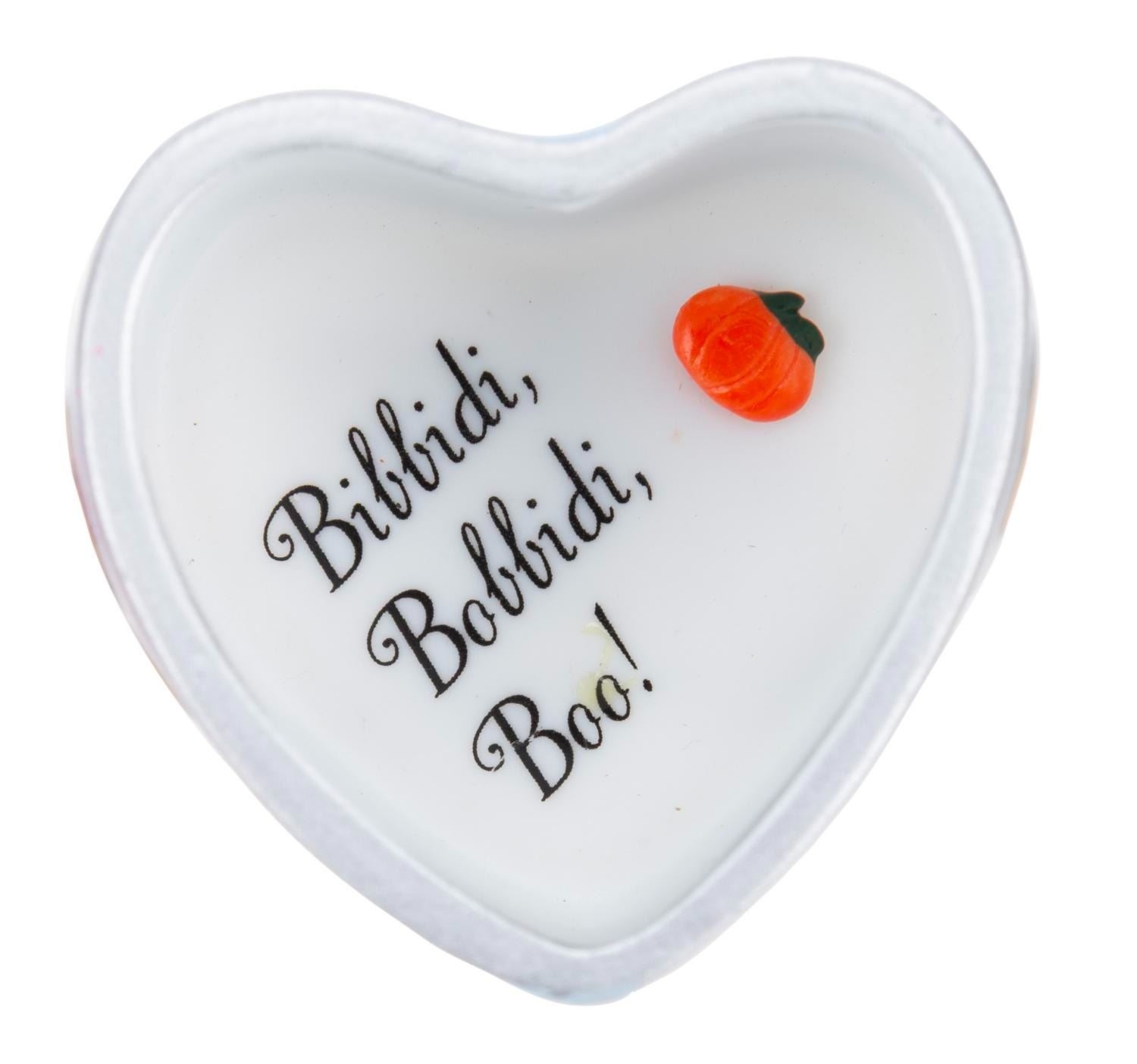 (Disney, 2000s) A "Cinderella" heart-shaped trinket box topped with the glass slipper. The interior features a pumpkin and the phrase "Bibbidi, Bobbidi, Boo!" Measuring 2.25" x 2.25" x 2.5" tall, the trinket box is in very good condition with light wear.