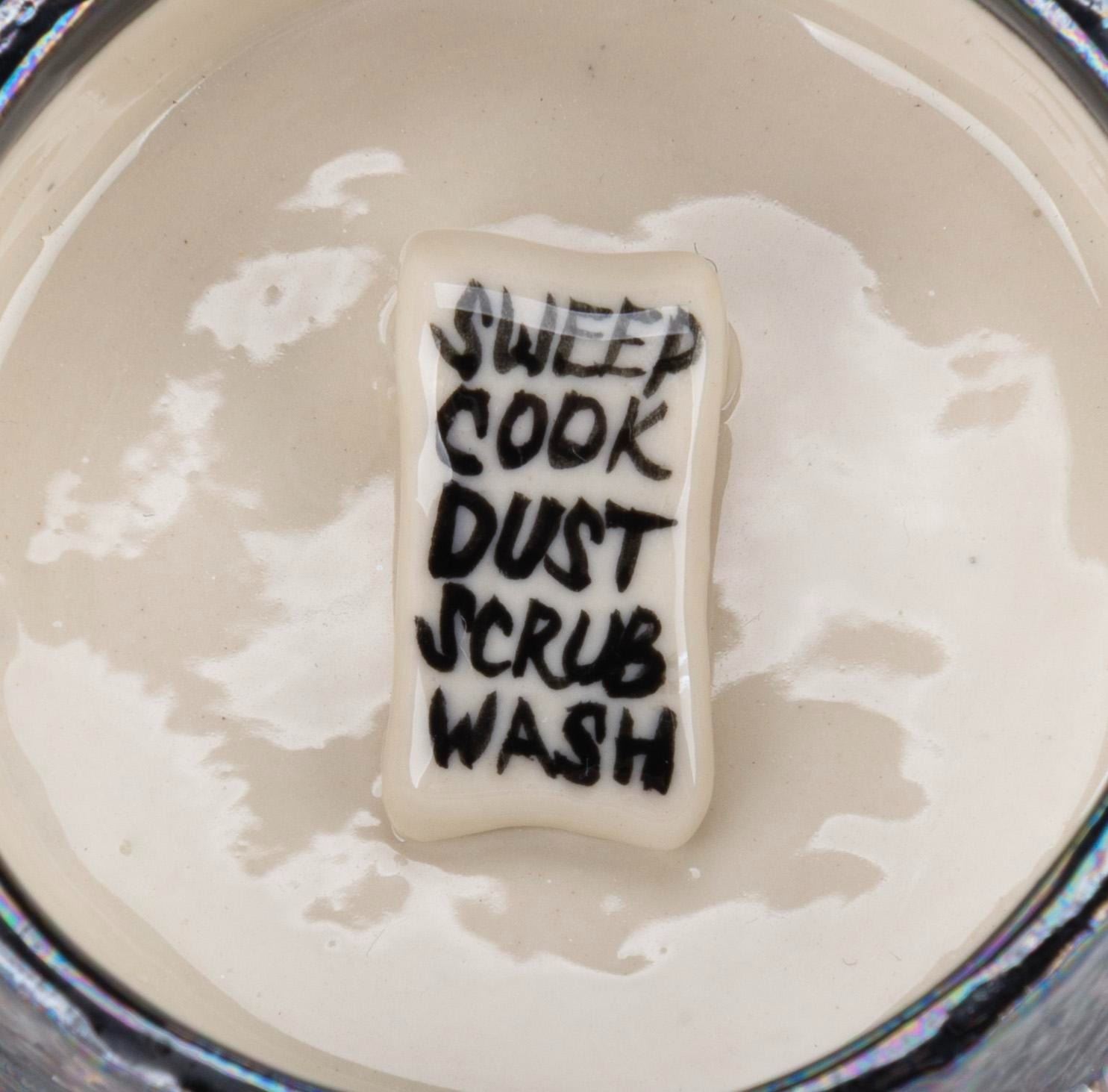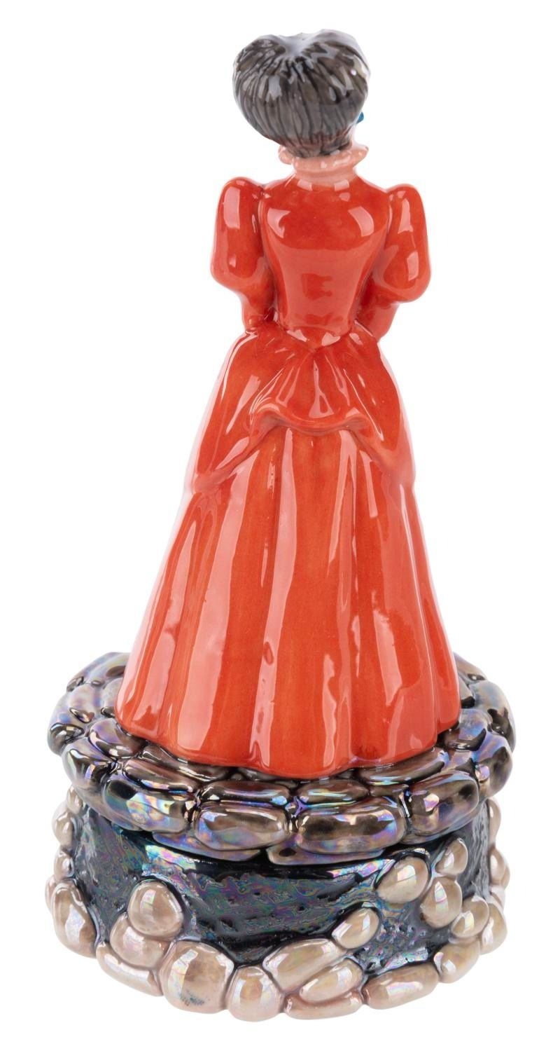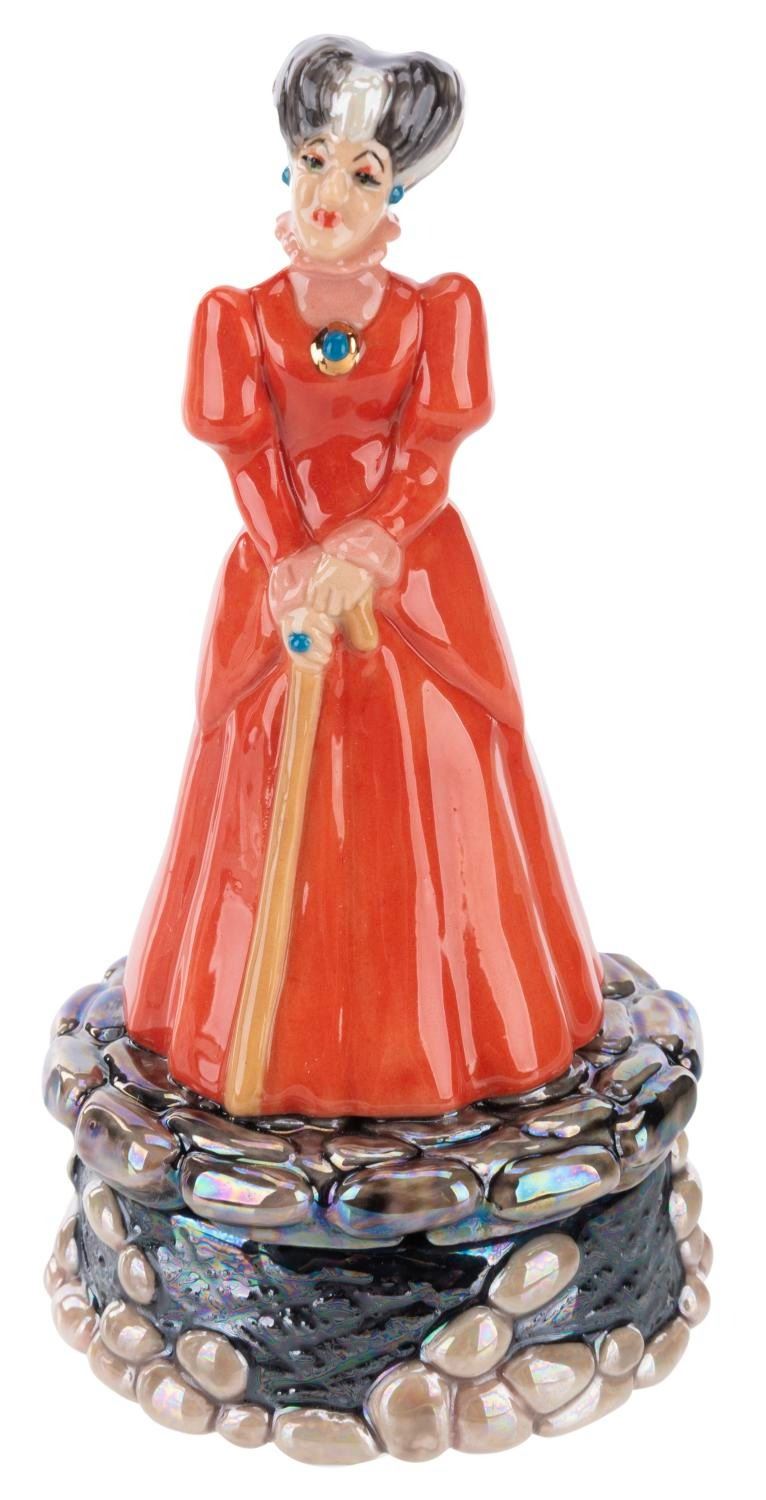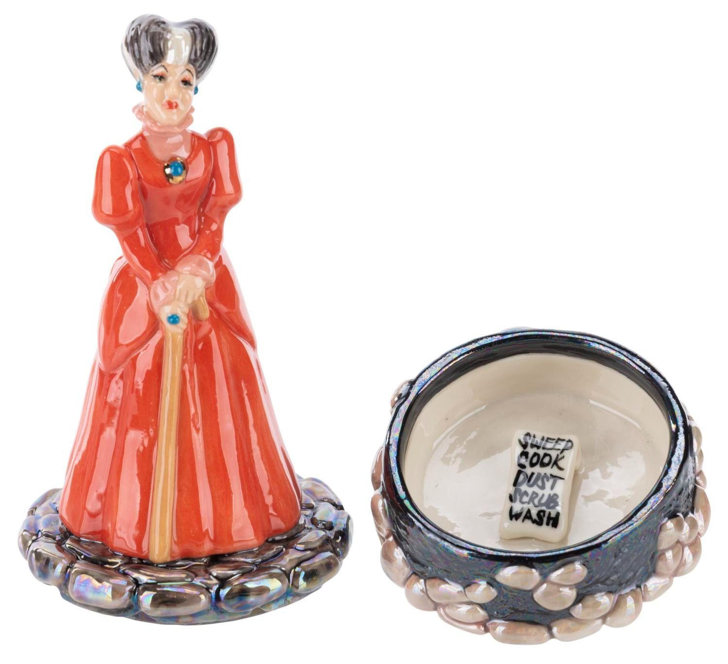 (Michael Lawrence, 1996) A ceramic trinket box topped with Lady Tremaine, the Wicked Stepmother from "Cinderella." The hand-painted box opens to reveal an exhausting to-do list for Cinderella. Measuring 4" tall, the trinket box is in fine condition.