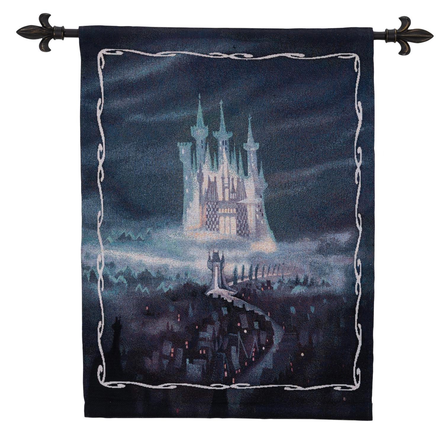 (Riddle Home and Gift, 2000s) A Cinderella Castle tapestry released in an edition of 1000 with a fleur de lis hanging rod and weighted hem for display. Measuring 37 " x 34.5 ", the tapestry is in fine condition, while the hanging rod exhibits spots of paint loss.