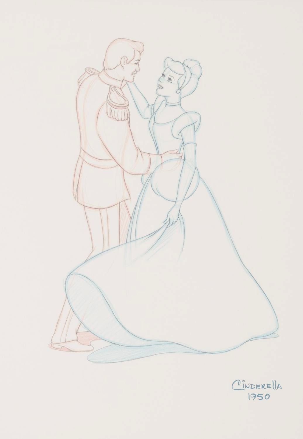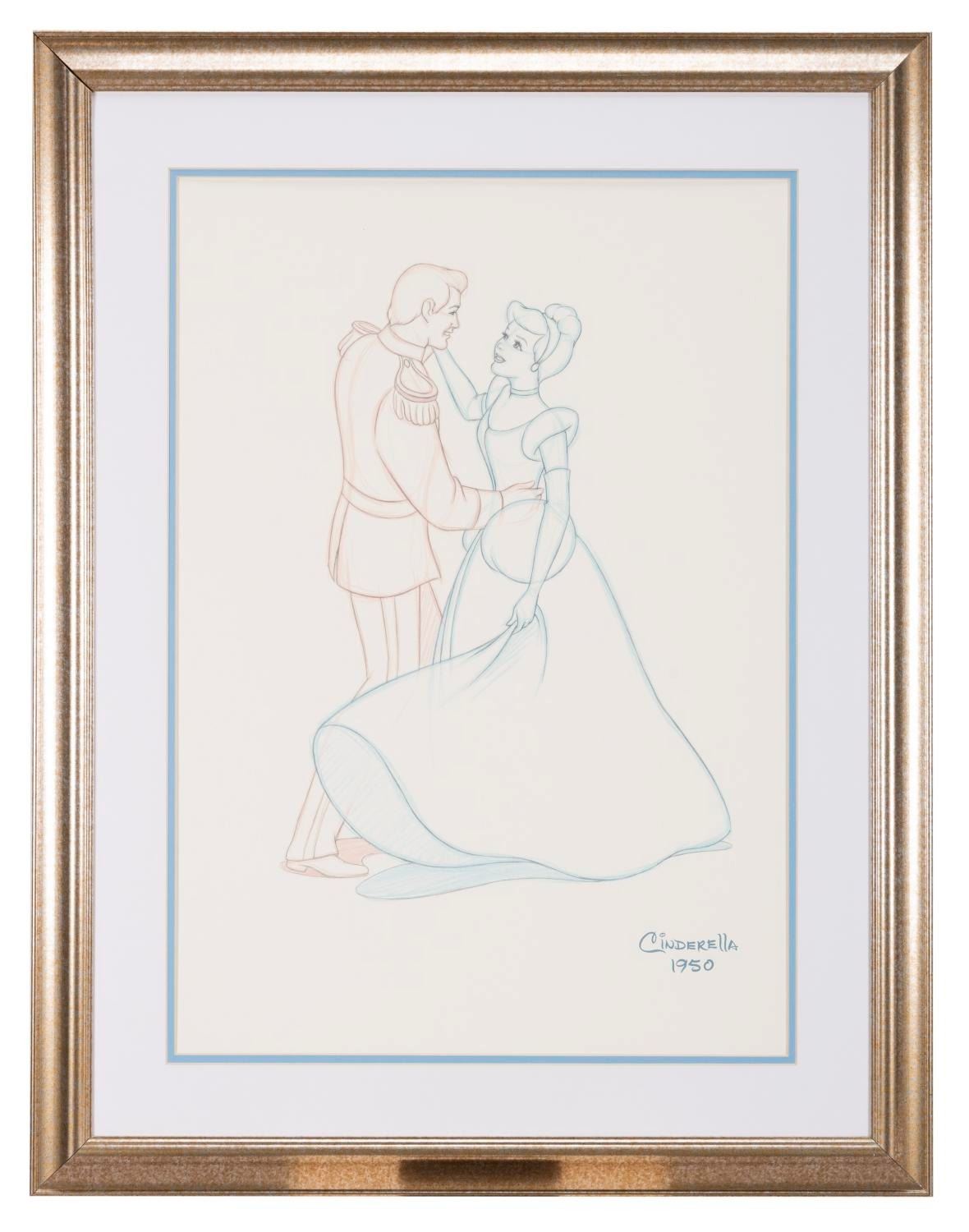 (Disney Store, 1990s) An oversized lithograph print from an animation drawing of "Cinderella " dancing with Prince Charming. With an image size of 13.5 " x 19.25 " in the 27.5 " x 35.25 " frame, the lithograph is in fine condition.