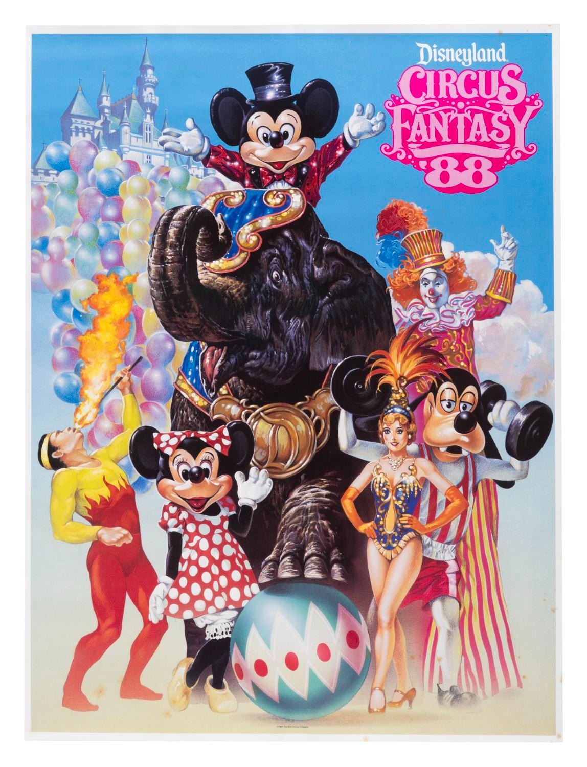 (Disneyland, 1988) A souvenir poster from the third and final season of Disneyland Circus Fantasy during the spring of 1988. Circus Fantasy ushered the Circus on Parade down Main Street for one final season, with a cavalcade of clowns, aerialists, and exotic animals. Measuring 18" x 24", the poster displays in very good condition, with light spotting along the bottom.