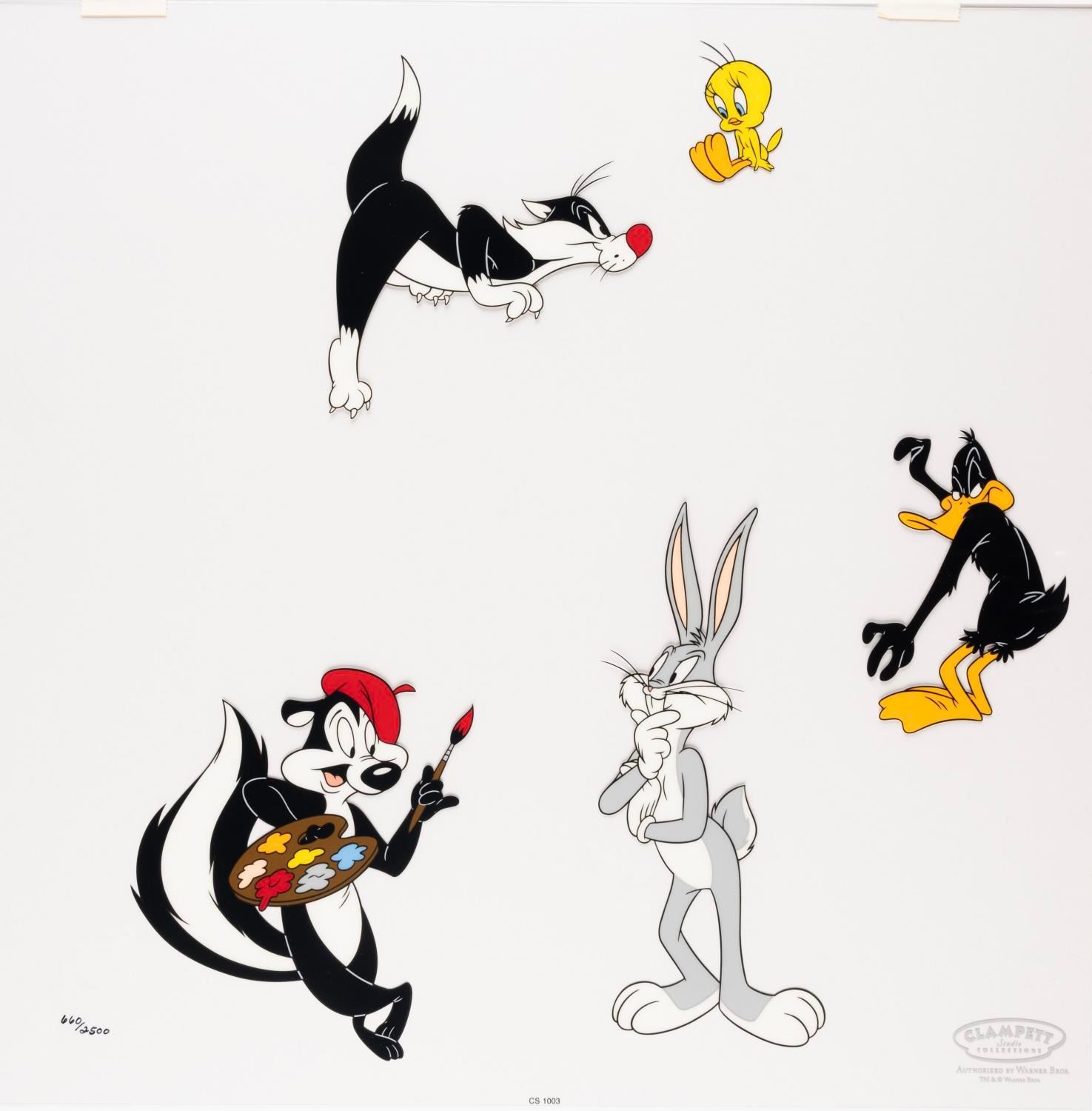 (Warner Bros./ Clampett Studios, 2002) A hand-painted limited edition sericel of Bugs Bunny, Daffy Duck, Sylvester, Tweety, and Pepé Le Pew titled “Looney Tunes Art Opening.” The sericel numbered 660 of 2,500, includes a hand-signed and numbered certificate of authenticity, and a Clampett Studio Collections holiday card. The holiday card has been signed by Ruth Clampett and the staff. Measuring 15.5” x 15.5”, the sericel is in fine condition.