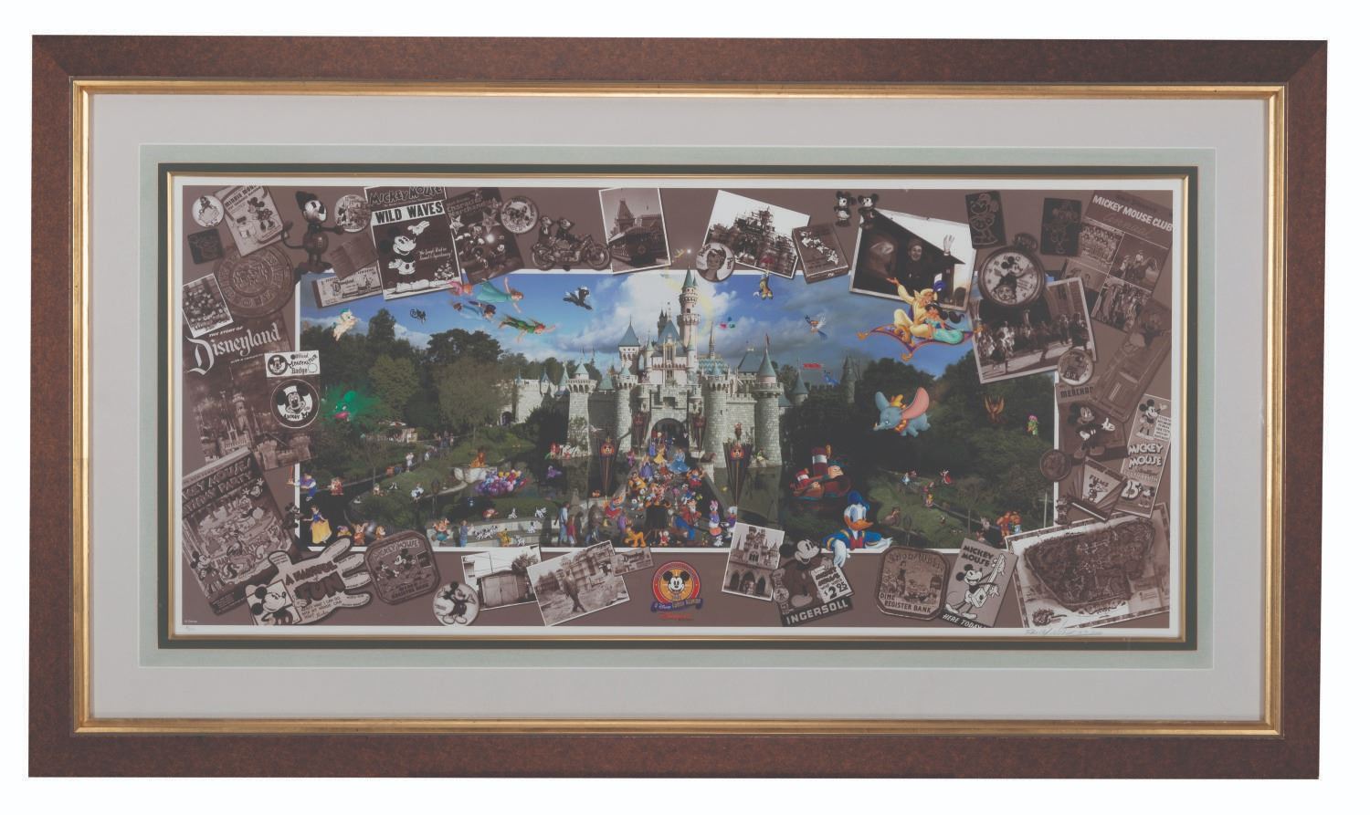 (Disneyana, 2001) A limited edition print featuring a reunion of Disney characters at Disneyland. “Classic Castle Memories” is signed by artist Randy Noble and was released in a Limited Edition of 200. The print numbered 33/200 with a visible area of 36.75” x 16.5” is in fine condition.