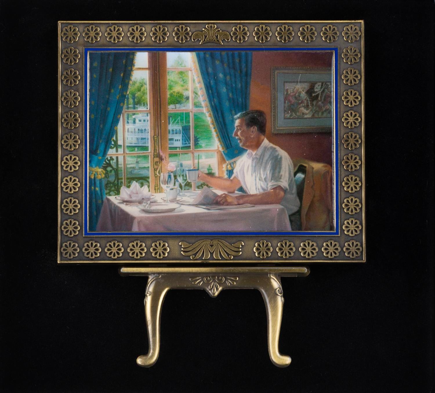 (Disneyland, 2007) A jumbo pin of the Charles Boyer / Bruce Boyer lithograph"A New Magic Kingdom Morning," released in a limted edition of only 330 through the exclusive Club 33. Measuring 3.5" x 3.75", the pin and easel are in fine condition, with the original box.