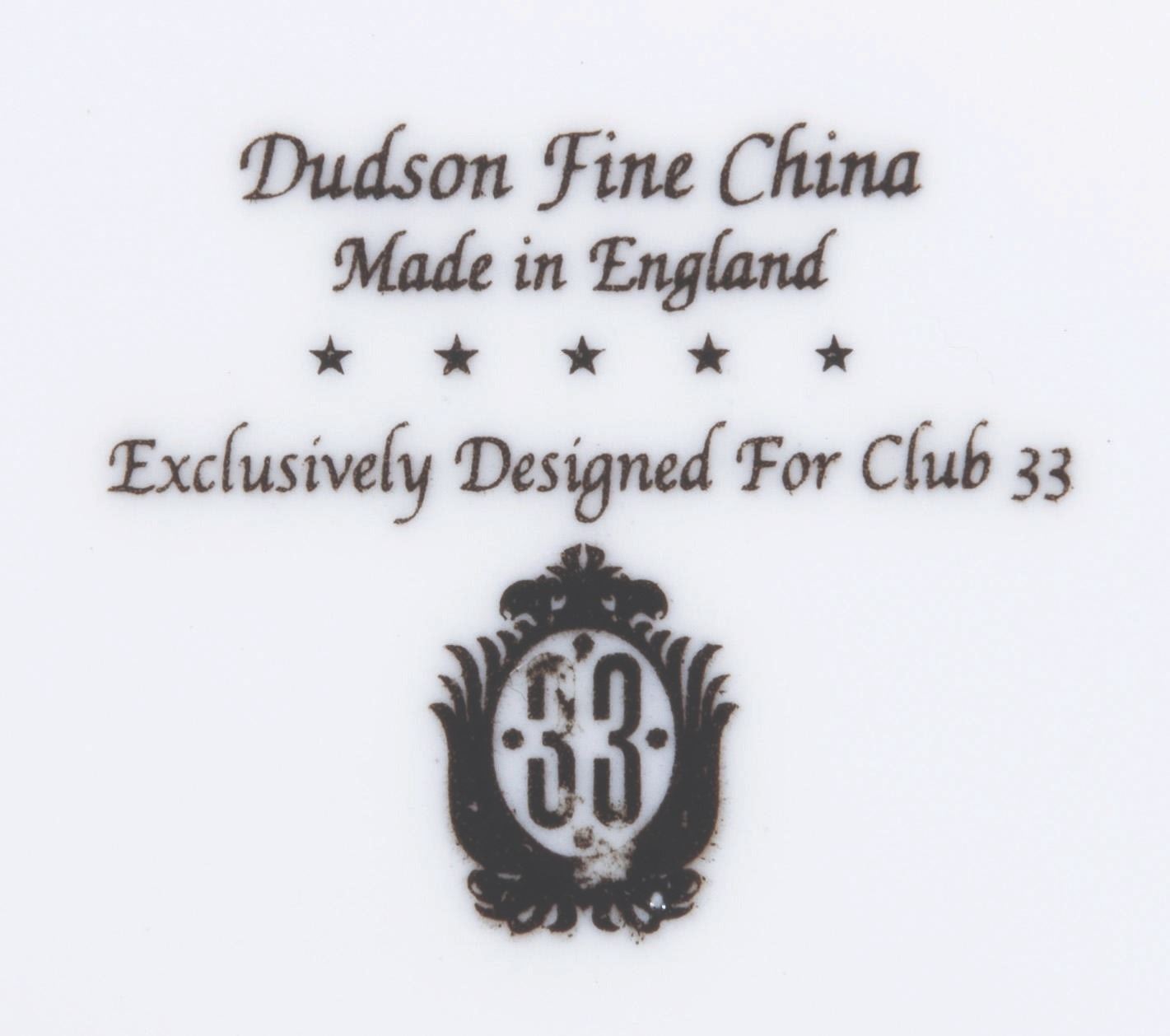 (Disneyland, 2010) A Club 33 charger plate designed by Dudson Fine China of England, made exclusively for the exclusive New Orleans Square restaurant. The Club’s logo is in the center, surrounded by a blue and white pattern and a gold filigree border. Measuring 12.25" in diameter, the charger plate displays in fine condition with a very small smudge on the reverse.