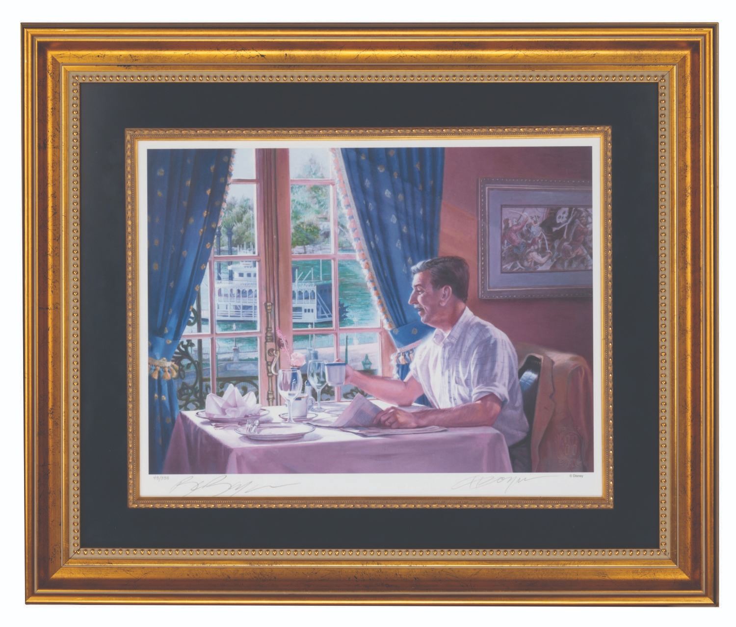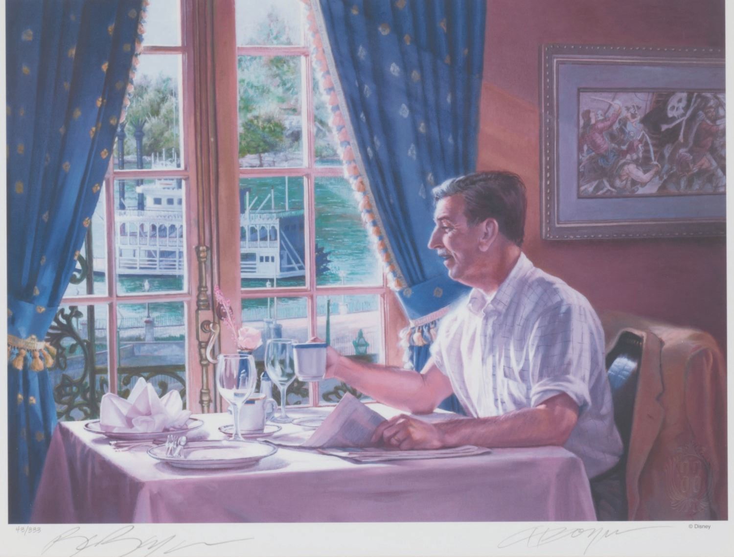 (Disneyland, 2005) A rare Club 33 exclusive fine art print of Charles Boyer’s painting “New Magic Kingdom Morning." This Special Edition print was offered in a limited edition of 333 pieces and is signed by Boyer. The artwork is titled "A New Magic Kingdom Morning." This piece, numbered 43/333, is beautifully framed, with an image size of 10.75" x 15" within the 19.5" x 23.5" frame. The condition is fine.