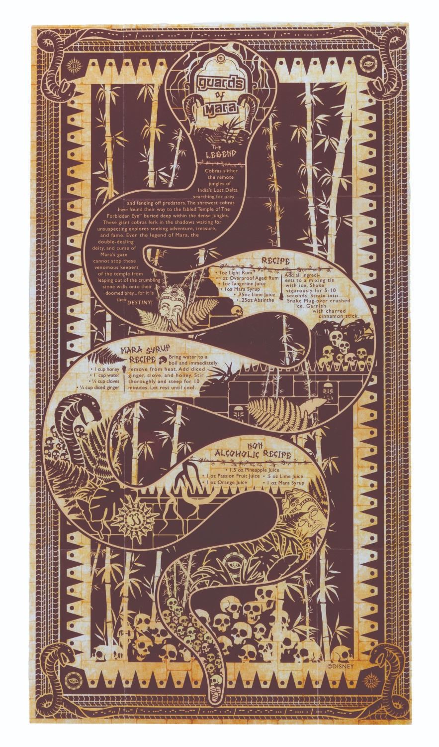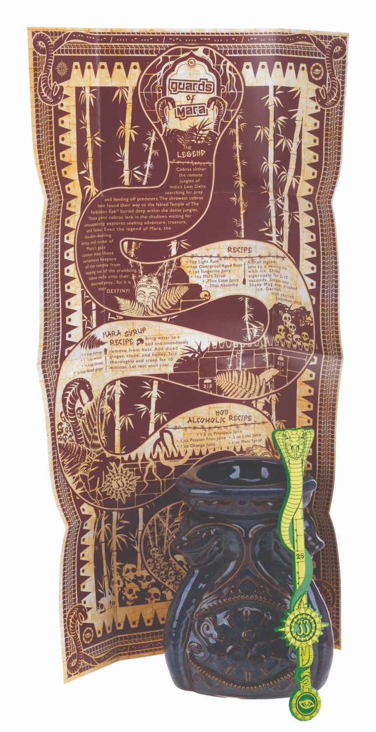 (Disneyland, 2021) A Club 33 exclusive second edition “SNAKES!” tiki mug designed by Tim Wollweber and Marcus Gonzalez, and manufactured by Tiki Farm for the Club’s Summer Tiki Takeover event and celebration of the 25th anniversary of Indiana Jones Adventure: Temple of the Forbidden Eye. Included is a snake swizzle stick. Measuring 4.5” x 5.75” x 4.5” deep, the ceramic tiki mug is in fine condition, while the 7.25” swizzle stick has scratches on the reverse. The mug comes with the original 5.75” x 7” x 5.75” box and a flier detailing the “Guards of Mara” cocktail served in the mug.