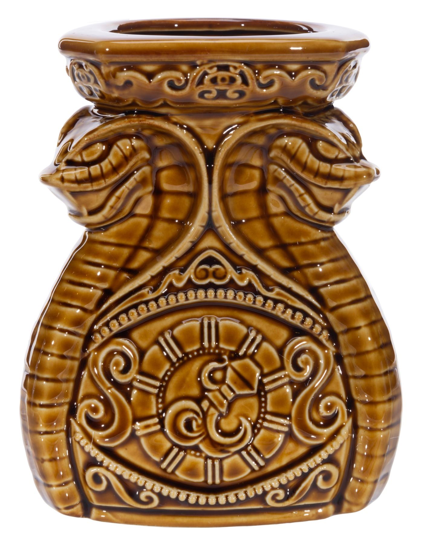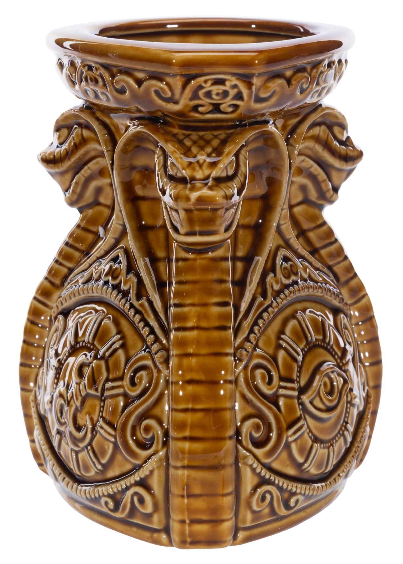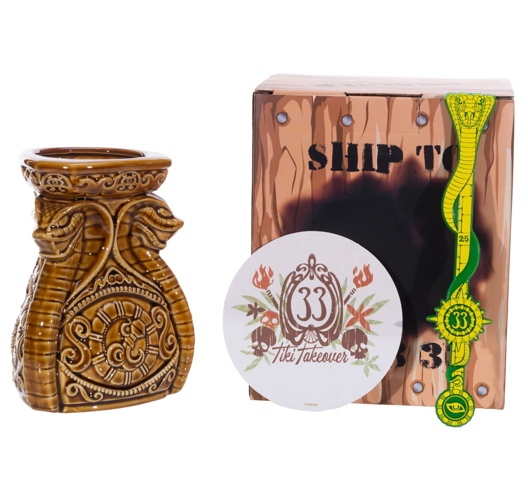(Disneyland, 2021) A Club 33 exclusive first edition "SNAKES!” tiki mug designed by Tim Wollweber and Marcus Gonzalez, and manufactured by Tiki Farm to celebrate the 25th anniversary of Indiana Jones Adventure: Temple of the Forbidden Eye at Disneyland. Included is a Club 33 snake swizzle stick and coaster. Measuring 4.5” x 5.75” and 4.5” deep, the ceramic mug is in fine condition. The 7.25” swizzle stick is very good condition with light wear to the reverse, and the 4” diameter coaster is in fine condition. The mug comes with the original 5.75” x 7” x 5.75” box.
